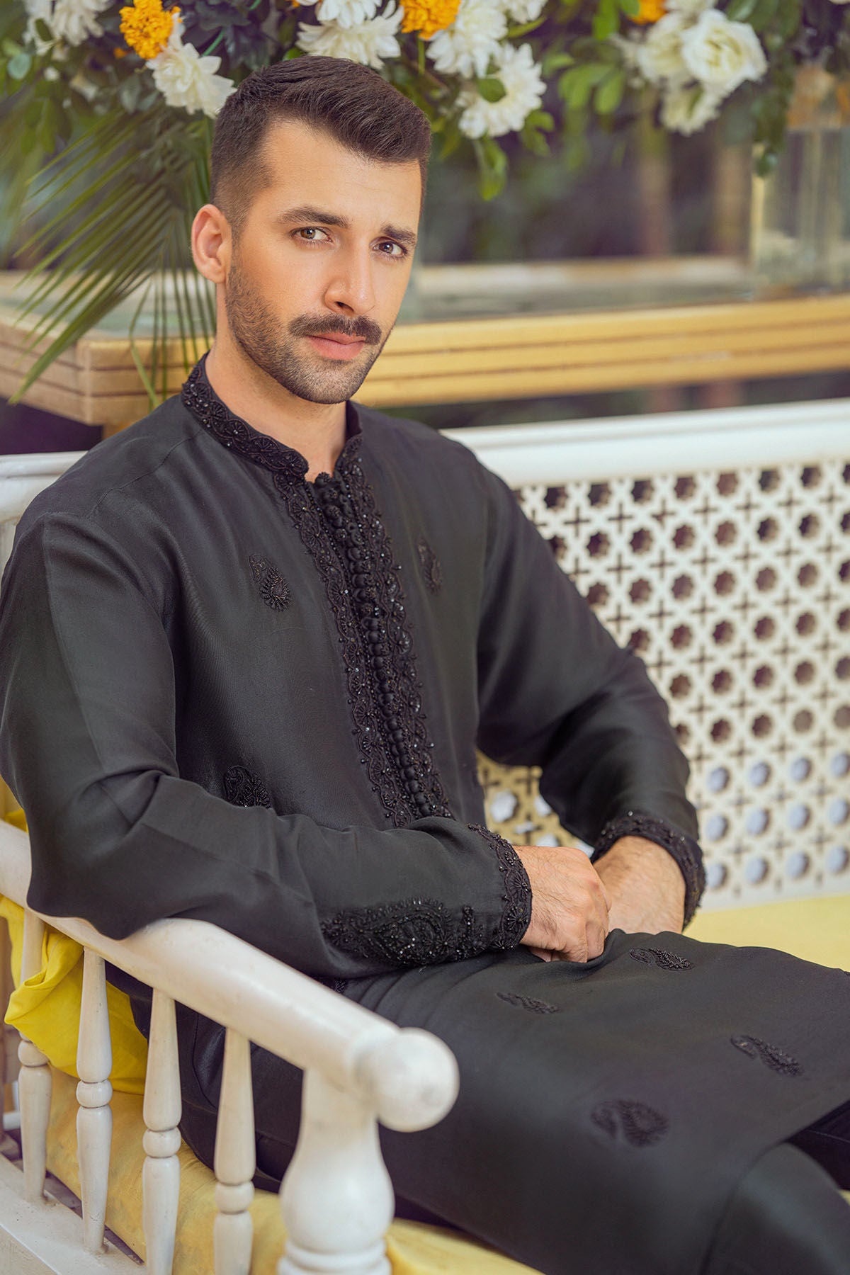 Pure raw silk kurta in head turning Noir shade featuring silk thread anchor embroidered details on neckline and sleeves and collar, the embroidered details are enhanced with zardozi in all black which are adorned with light catching crystals and sequins. The kurta is paired with matching raw silk pants.
