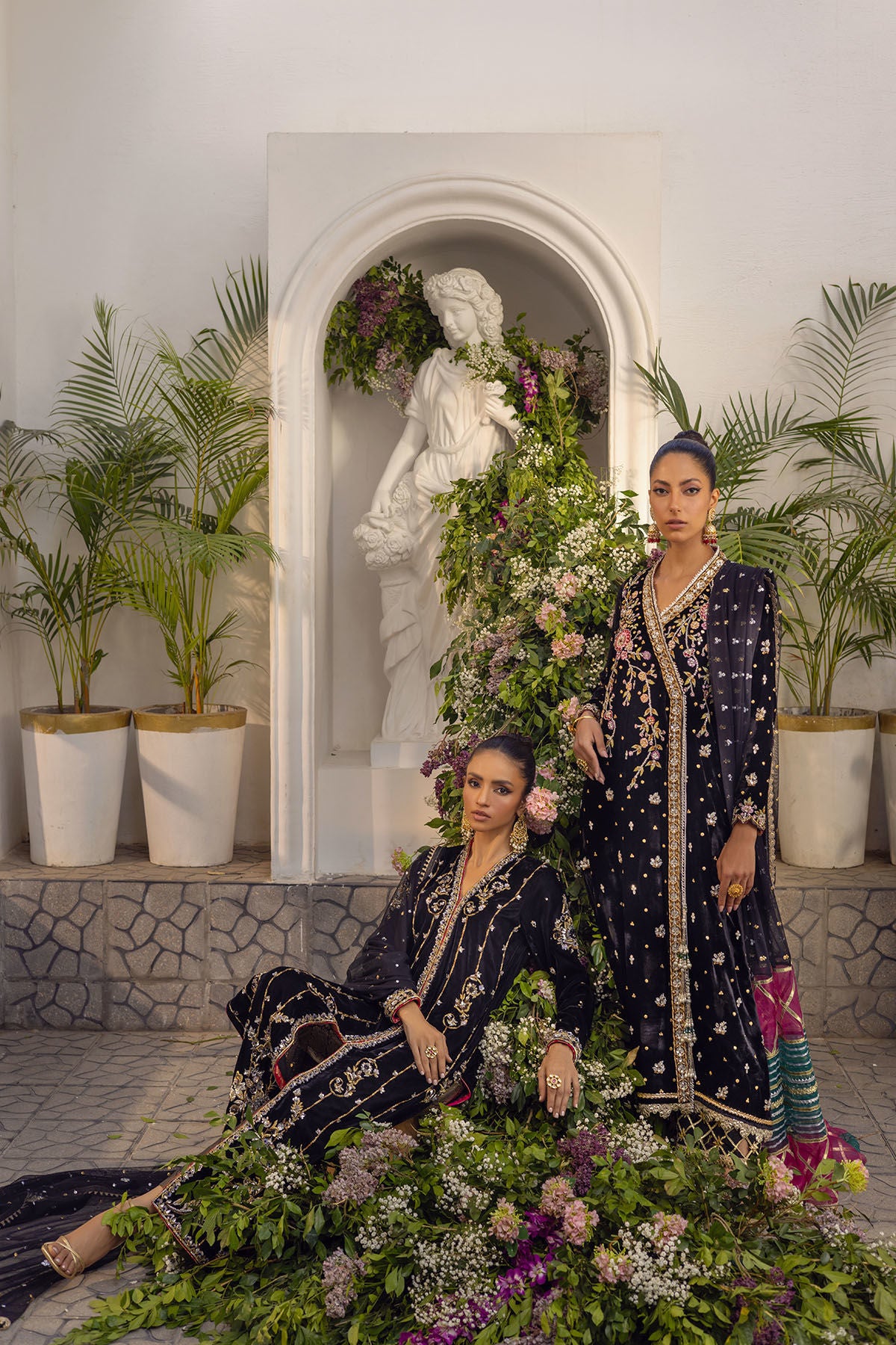 Old school angharka on deep black velvet canvas featuring silk thread embroidered details. The silk thread details are further adorned with zardozi. The centre front is enhanced with handcrafted tassels and the outfit is paired with gota and cutwork izaar. The angharka can be paired with net and organza colour blocked dupatta featuring gota manipulation on organza panels.