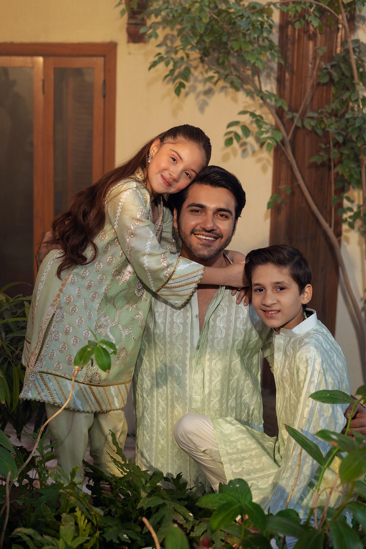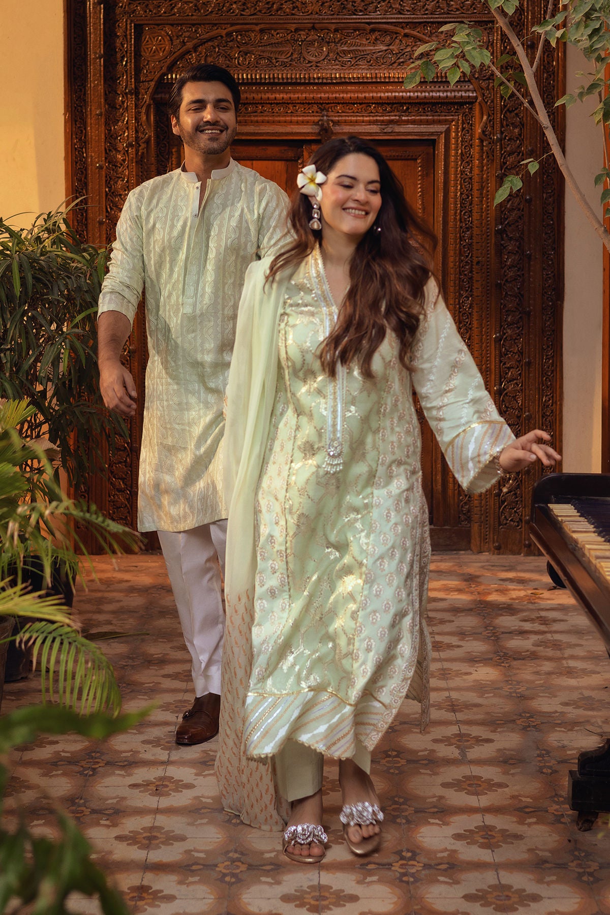Self-embroidered kurta in subtle shades of mints, showcasing tone-on-tone embroidered details on both the front and back. The neckline is accentuated with a placket, and the kurta can be elegantly paired with straight white pants to complete the ensemble.