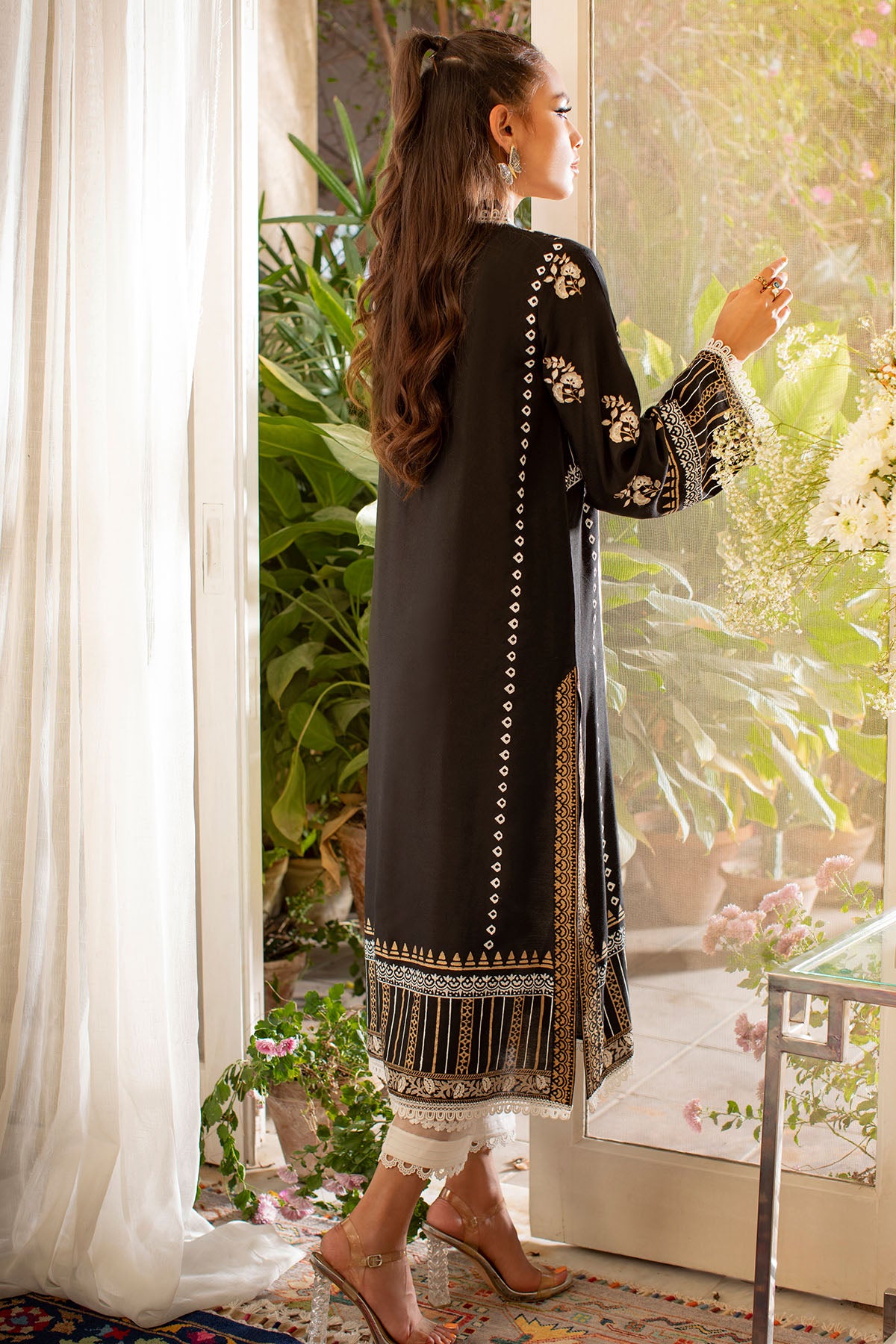 Long silhouette cotton net shirt on black canvas featuring hand block printed details in gold, silver and whites which are further enhanced with crochet laces and gota details.