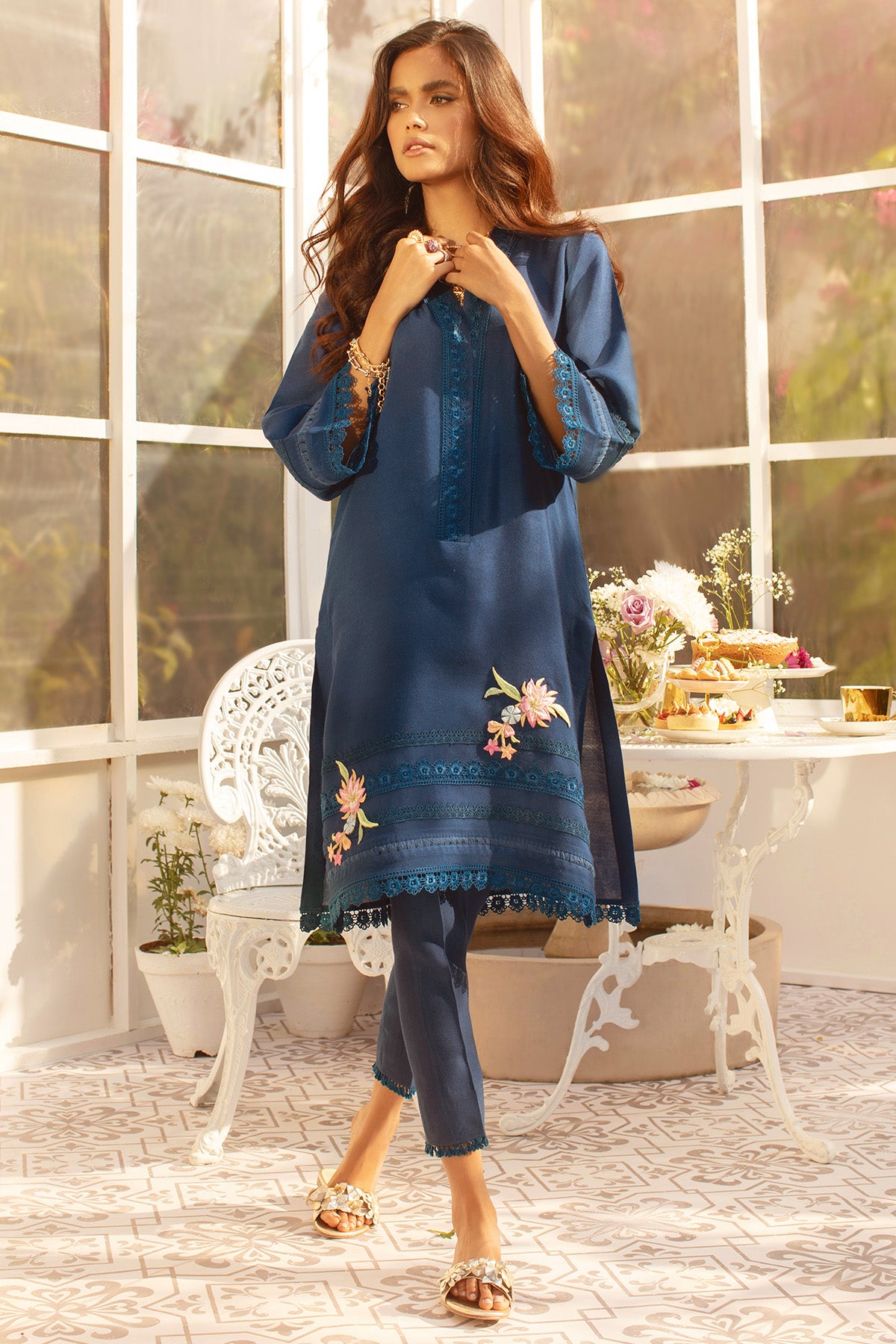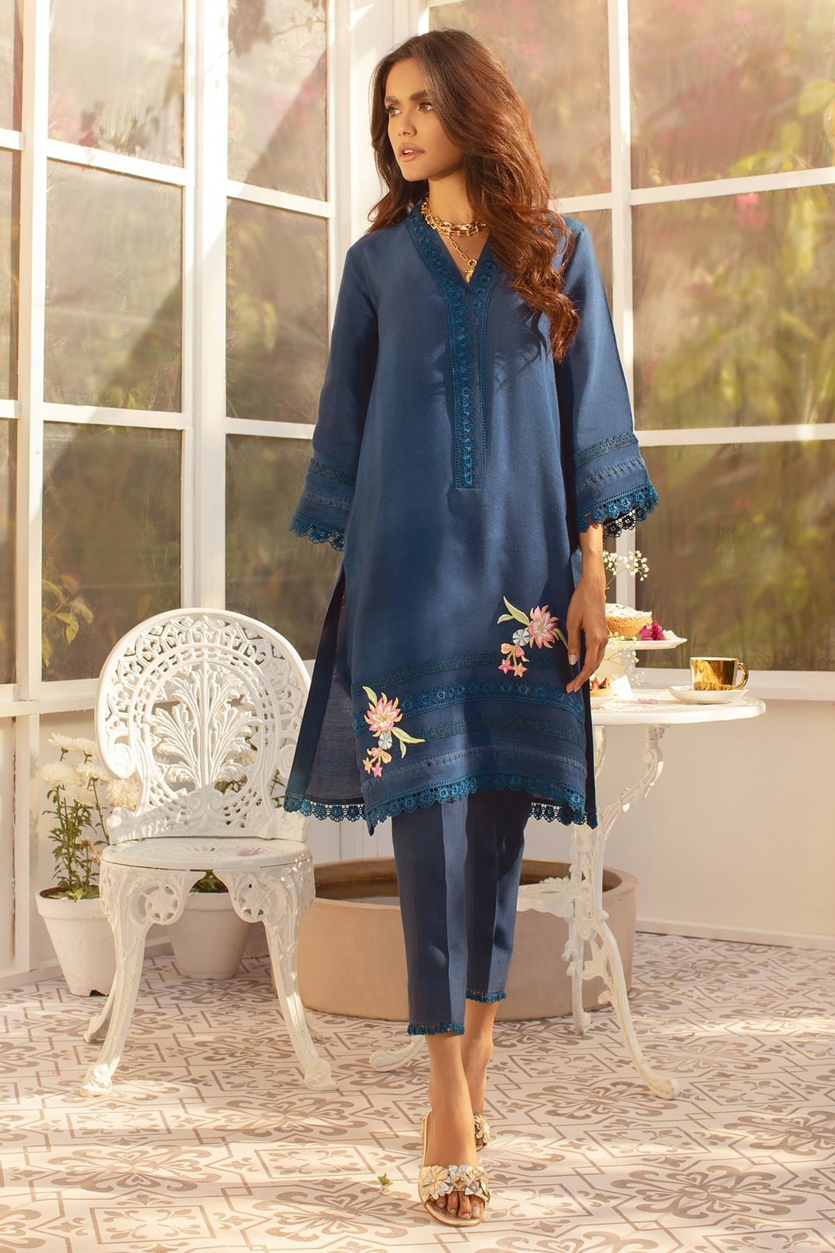 Long straight silhouette berry blue cotton net shirt with details on the neckline. The front of the shirt is enhanced with different types of laces and silk thread floral details.