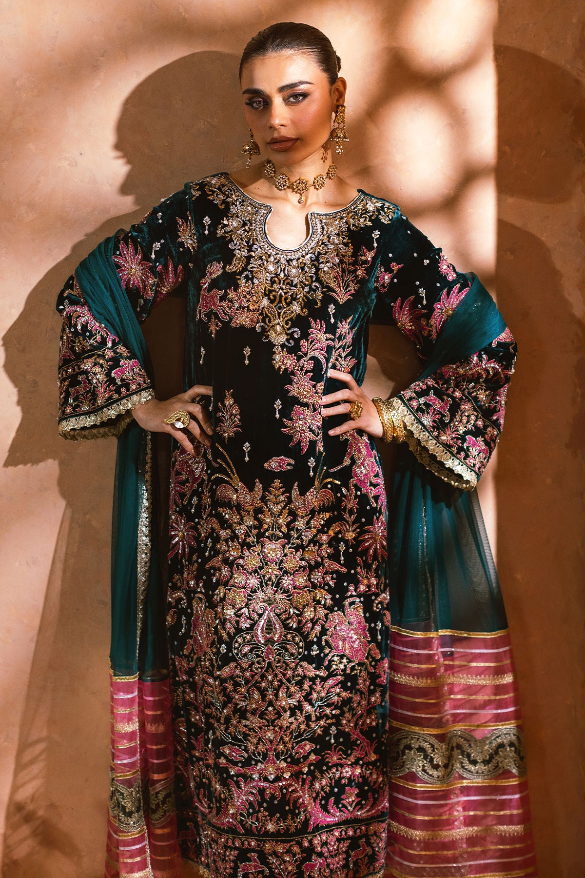 Long silhouette shirt in an exquisite two-tone emerald green, embellished with screen-printed details in a striking pink. The printed elements are enhanced with light-reflecting sequins and zardozi in gold, silver, and antique finishes. This ensemble is accompanied by a net color-blocked dupatta featuring intricate gota manipulation and embossed organza zari panels. The outfit includes straight matching pants, culminating in a refined festive appearance.