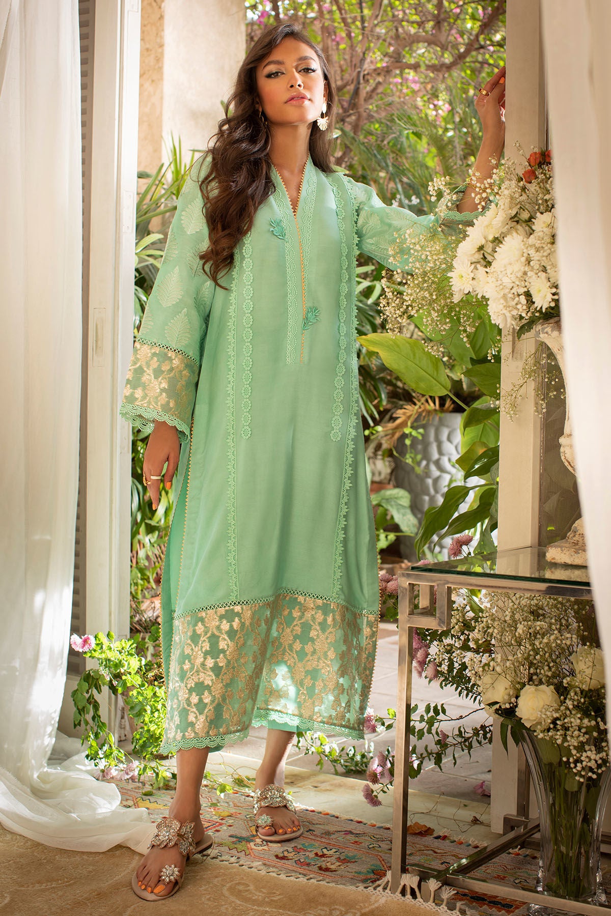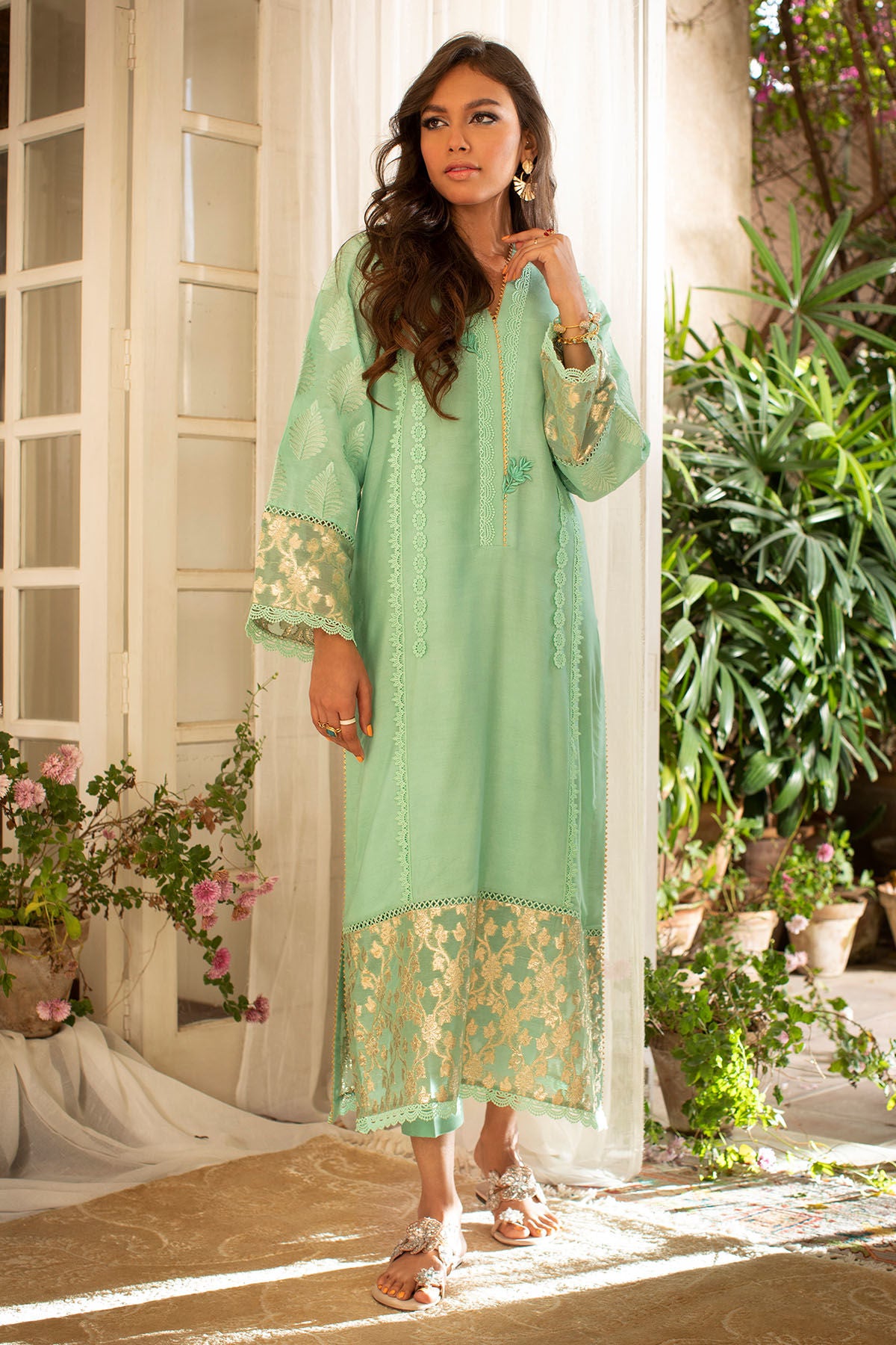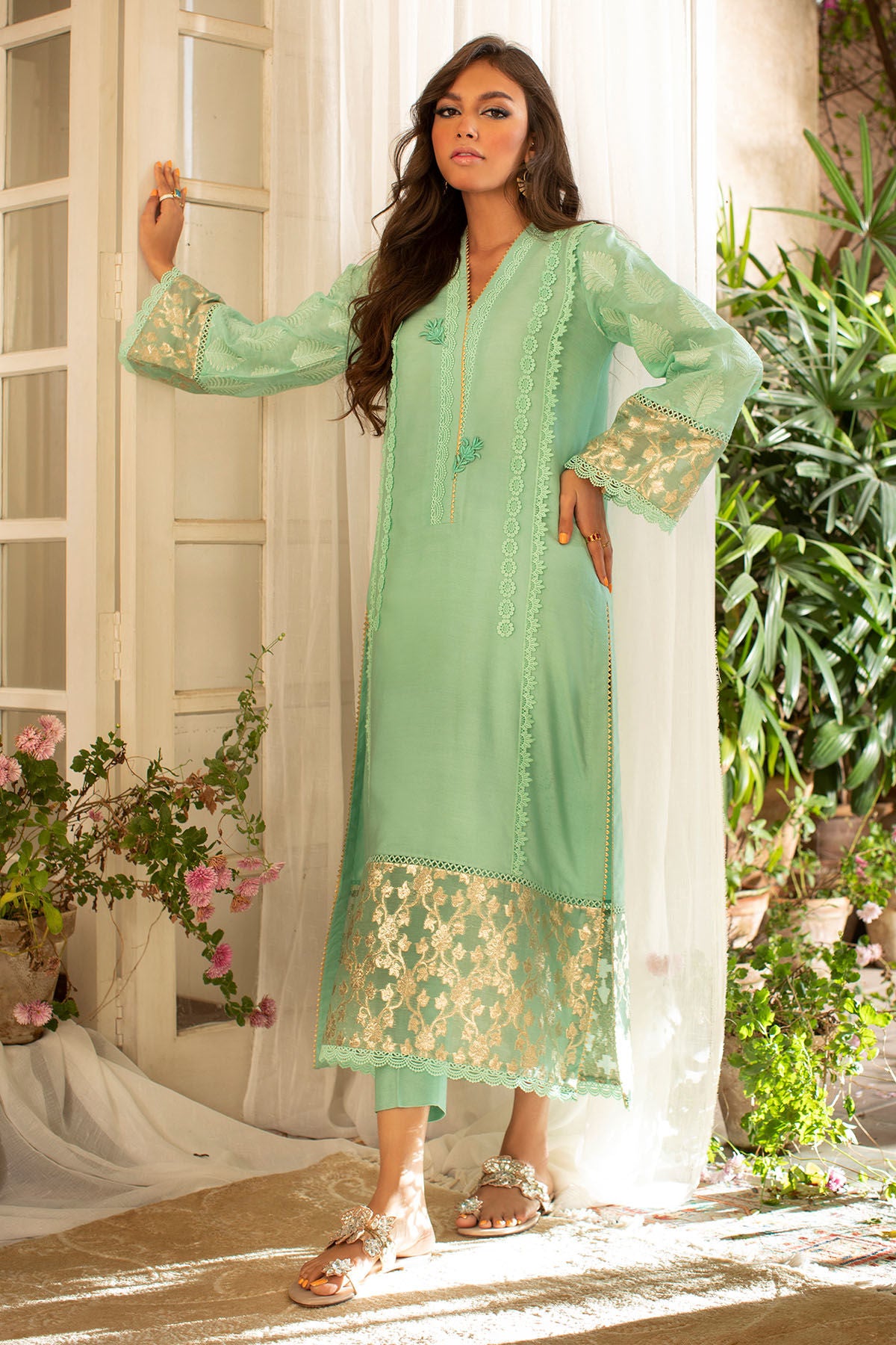 Long silhouette cotton net shirt featuring crochet lace details on front which is further adorned with zari lorex fabric on hemline. The sleeves are created with self zari embroidered raw silk.