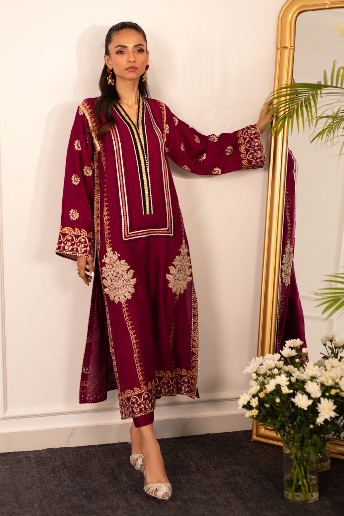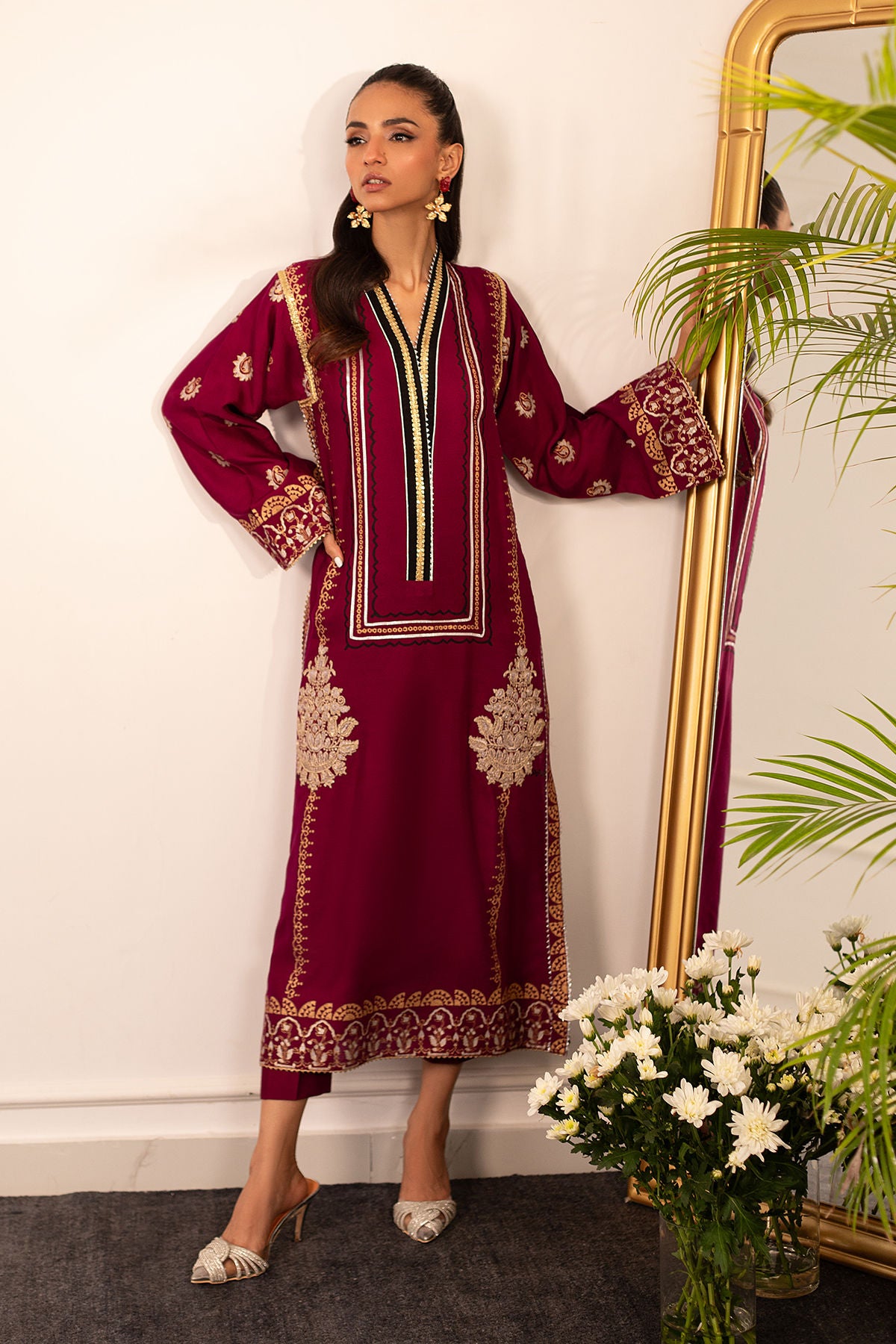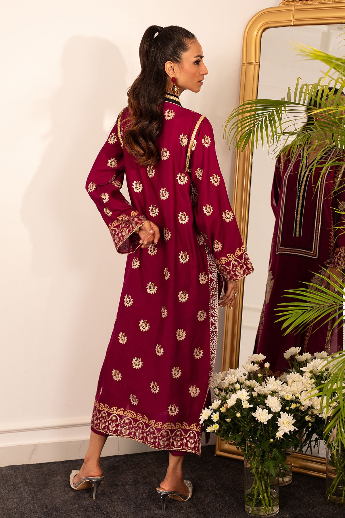 Long silhouette cotton net shirt in deep crimson shade featuring contrasting neckline adorned with gota details. The shirt is adorned with hand block printed details in silver and gold and further adorned with zari appliqué motifs. The shirt is paired with matching cotton net pants.