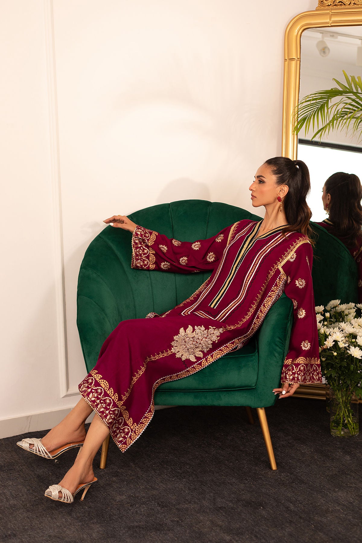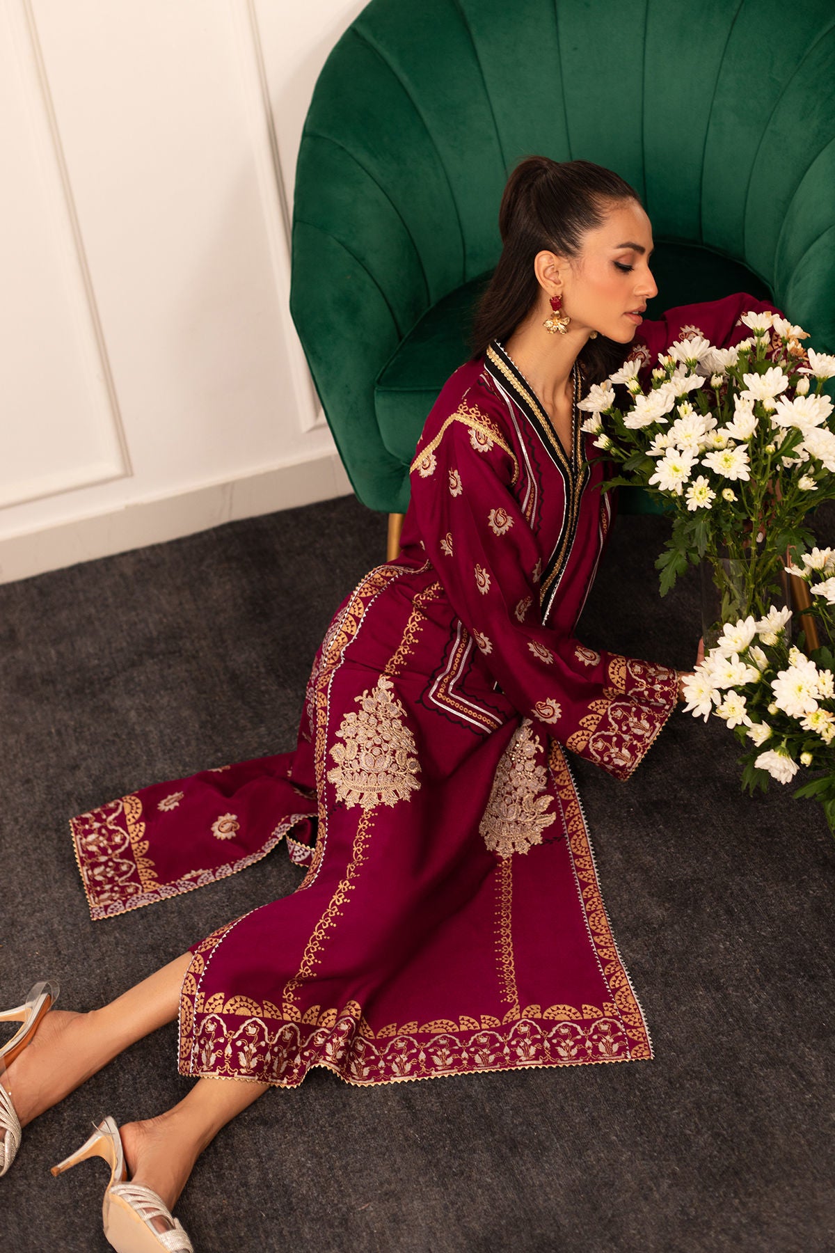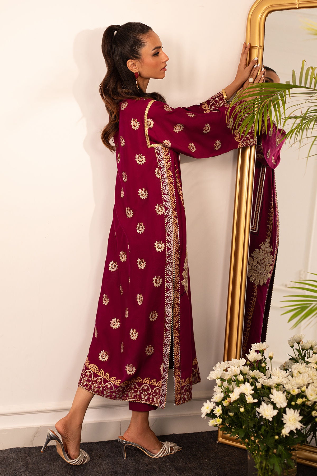Long silhouette cotton net shirt in deep crimson shade featuring contrasting neckline adorned with gota details. The shirt is adorned with hand block printed details in silver and gold and further adorned with zari appliqué motifs. The shirt is paired with matching cotton net pants.