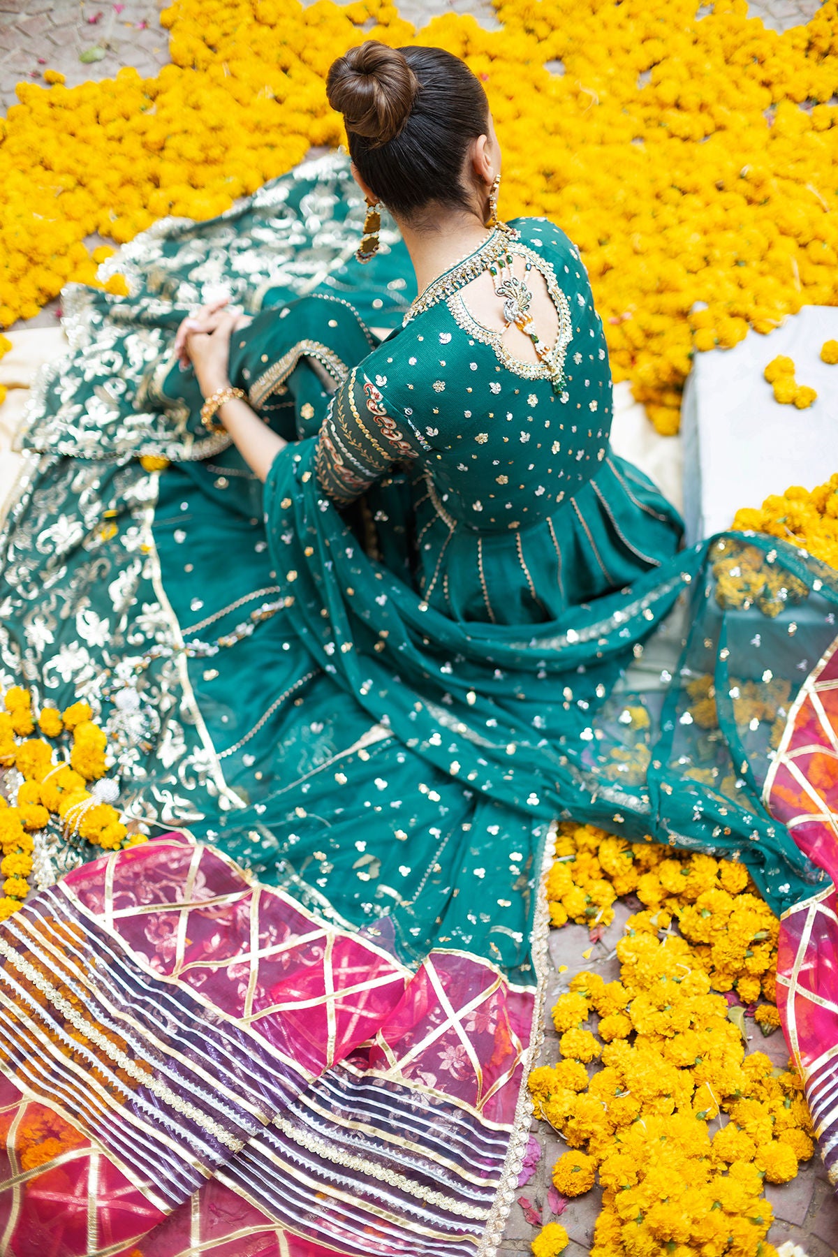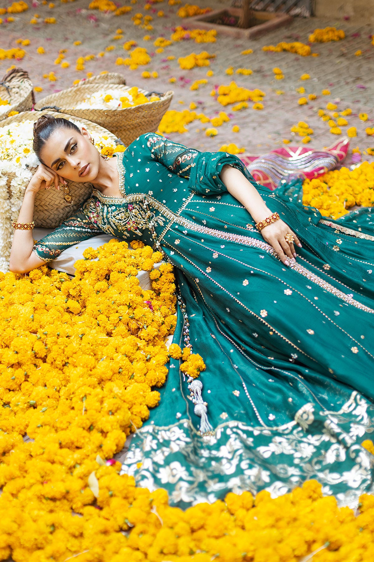 Long silhouette kalidar featuring subtle silk thread and zardozi floral details on bodice. The subtle panels on pure zari in shades of mint and peaches are enhanced with hand block printed details. The hand block printed canvas is further adorned with sequins spray and the hemline is adorned with gota details. The kalidar can be paired with gold damask dhaka and hand block printed organza dupatta in mint shade featuring sequins details.