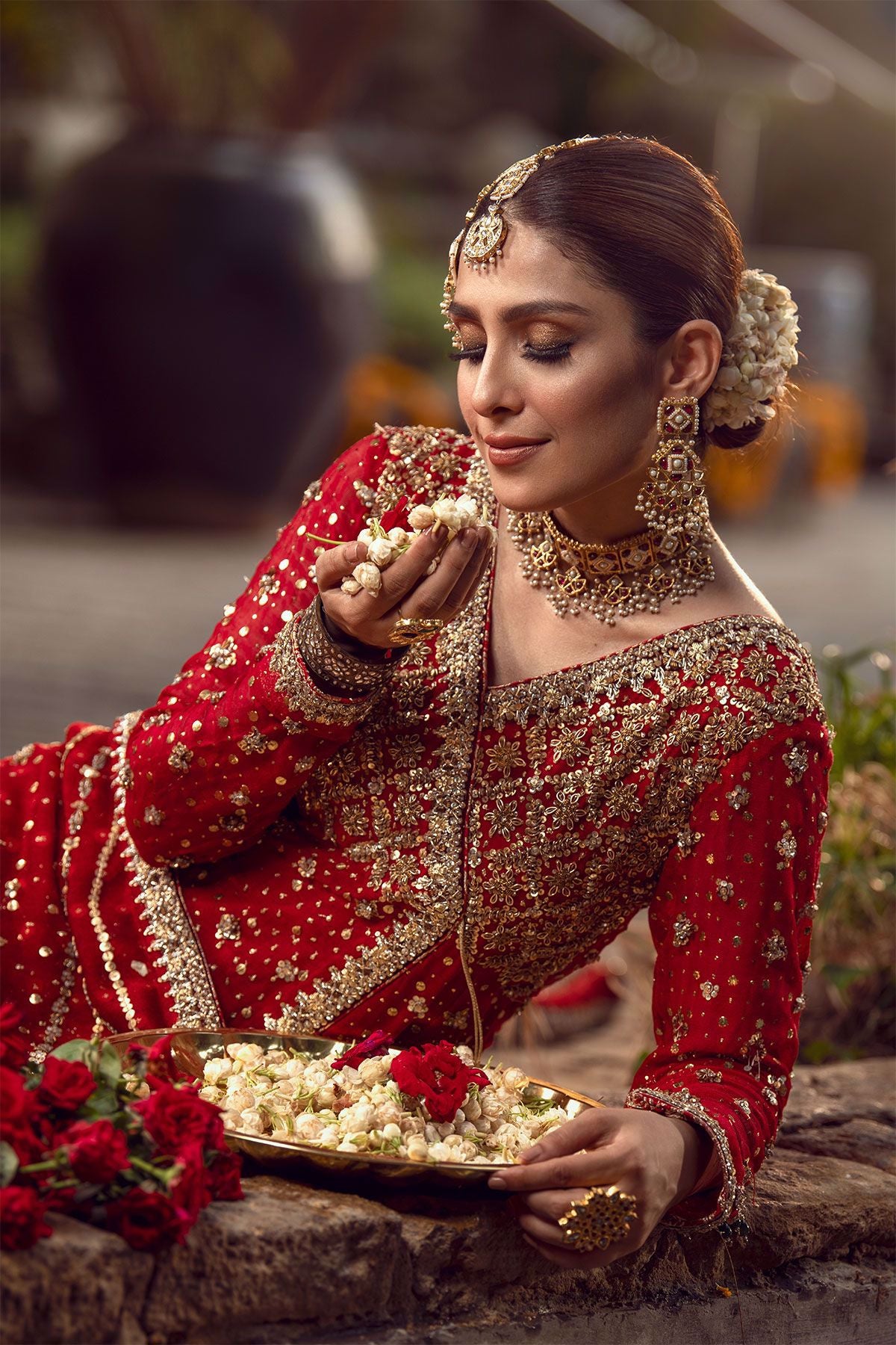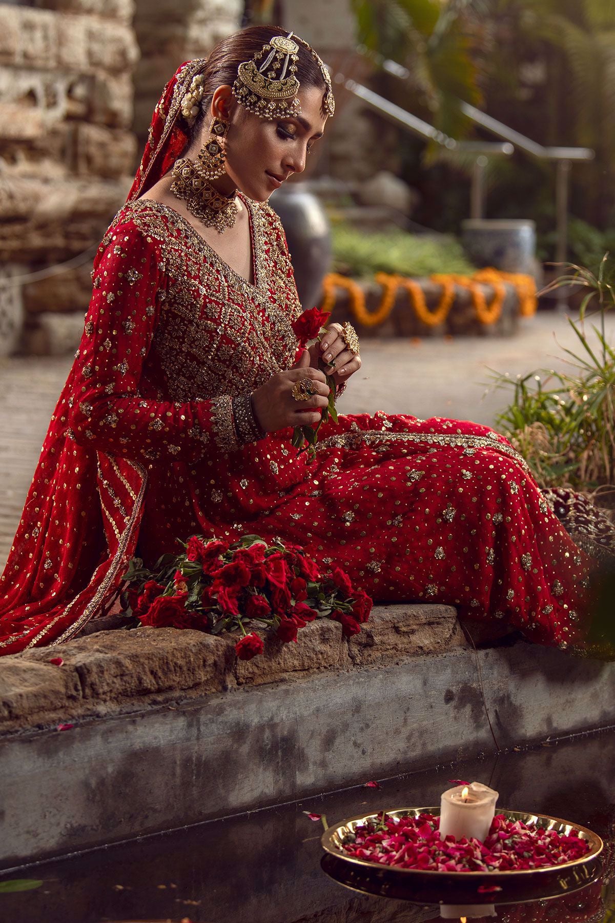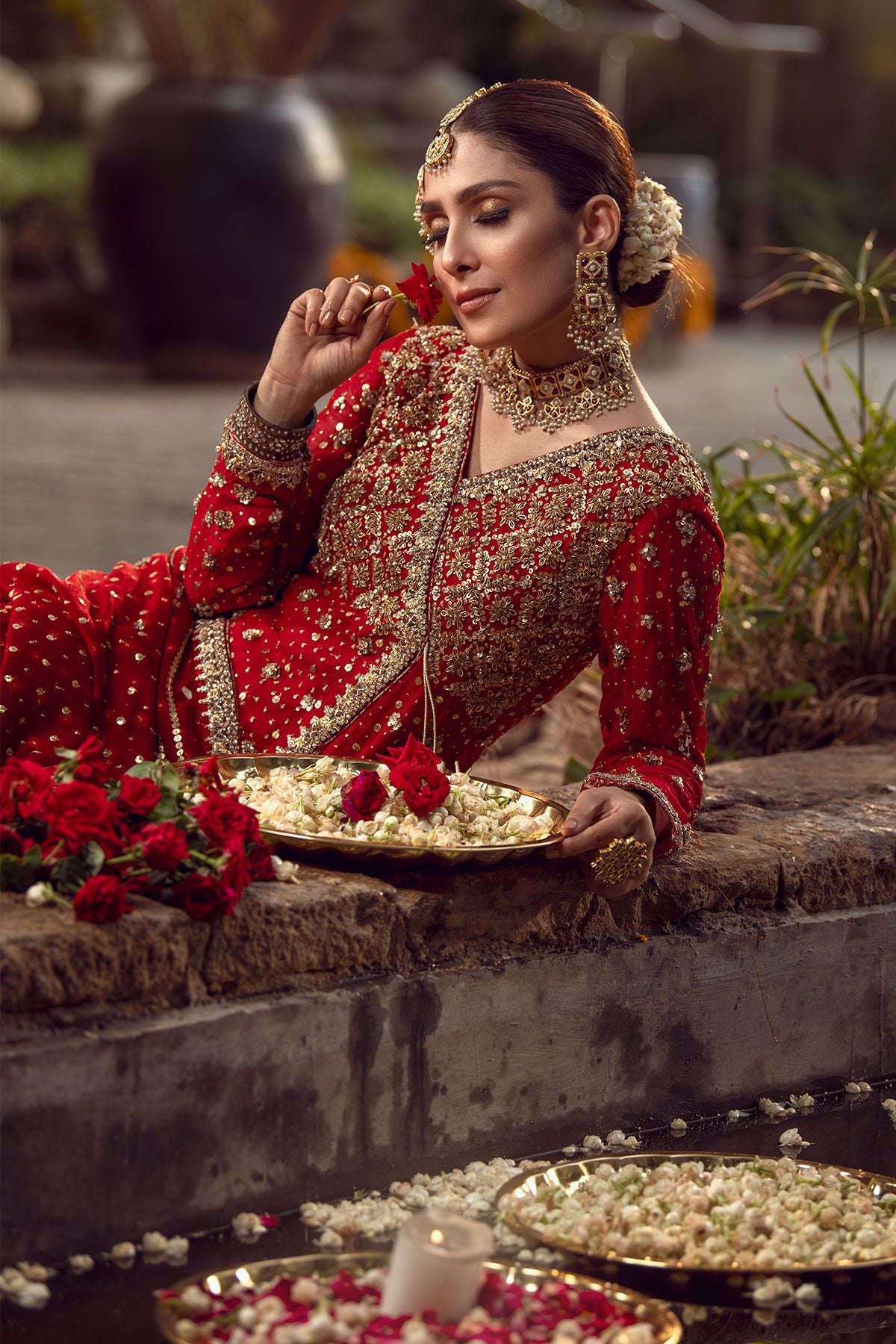 An elegant ode to tradition, a silk net angharka in deep crimson shade with striking gold hand embroidered details on scattered kaamdani canvas. The angharka is paired with deep maroon two legged dhaka pajama with gota and sequins details. The stunning angharka is paired with long four yards’ dupatta with velvet appliqué border and light catching sequins.