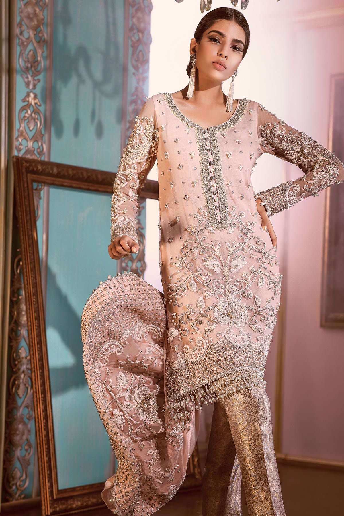 This stunning extreme high-low from Escapade is epitome of elegance. If Escapade was highly glamorous lady going to make head turns in an event, She would wear "Peach Beryl". This head turning design is made on light net with silk thread embroidery mixed with off white anchor thread. The floral embroidery is further adorned with pearls,sequins and light catching crystal. The danglings tassels on the hemline and trouser complete the look, making this outfit even gorgeous.
