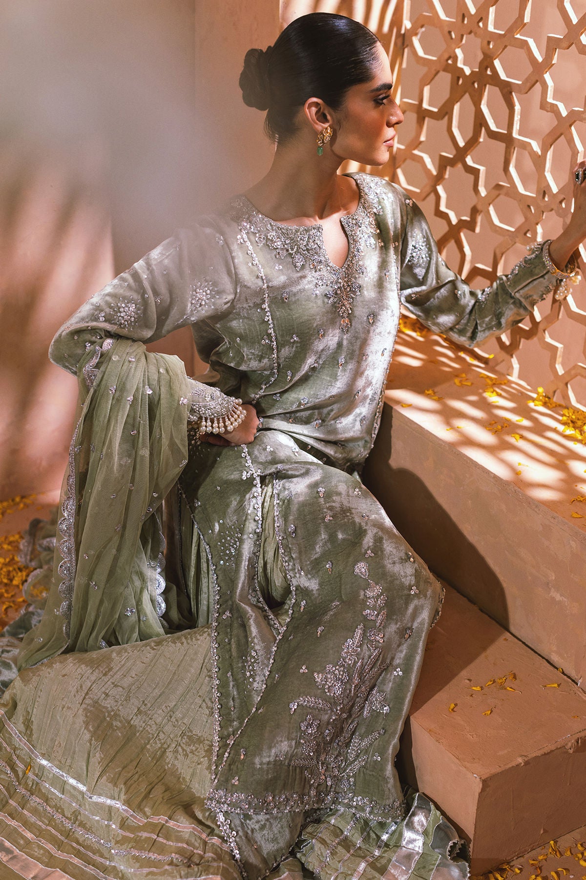 Discover the stunning long silhouette shirt in a soothing mint shade, crafted on luxurious velvet canvas and embellished with exquisite silver zardozi details. The center front showcases an elegant open silhouette that beautifully accentuates your style. Adorned with charming dangling tassels and intricate zardozi work, the sleeves add an enchanting touch to your ensemble. Elevate your look further with the accompanying crushed cotton silk sharara, featuring delicate gota accents along the hemline that exude grace and sophistication. Complete your outfit with a mesmerizing net dupatta, adorned with light-catching scattered sequins and finished with exquisite lace details.