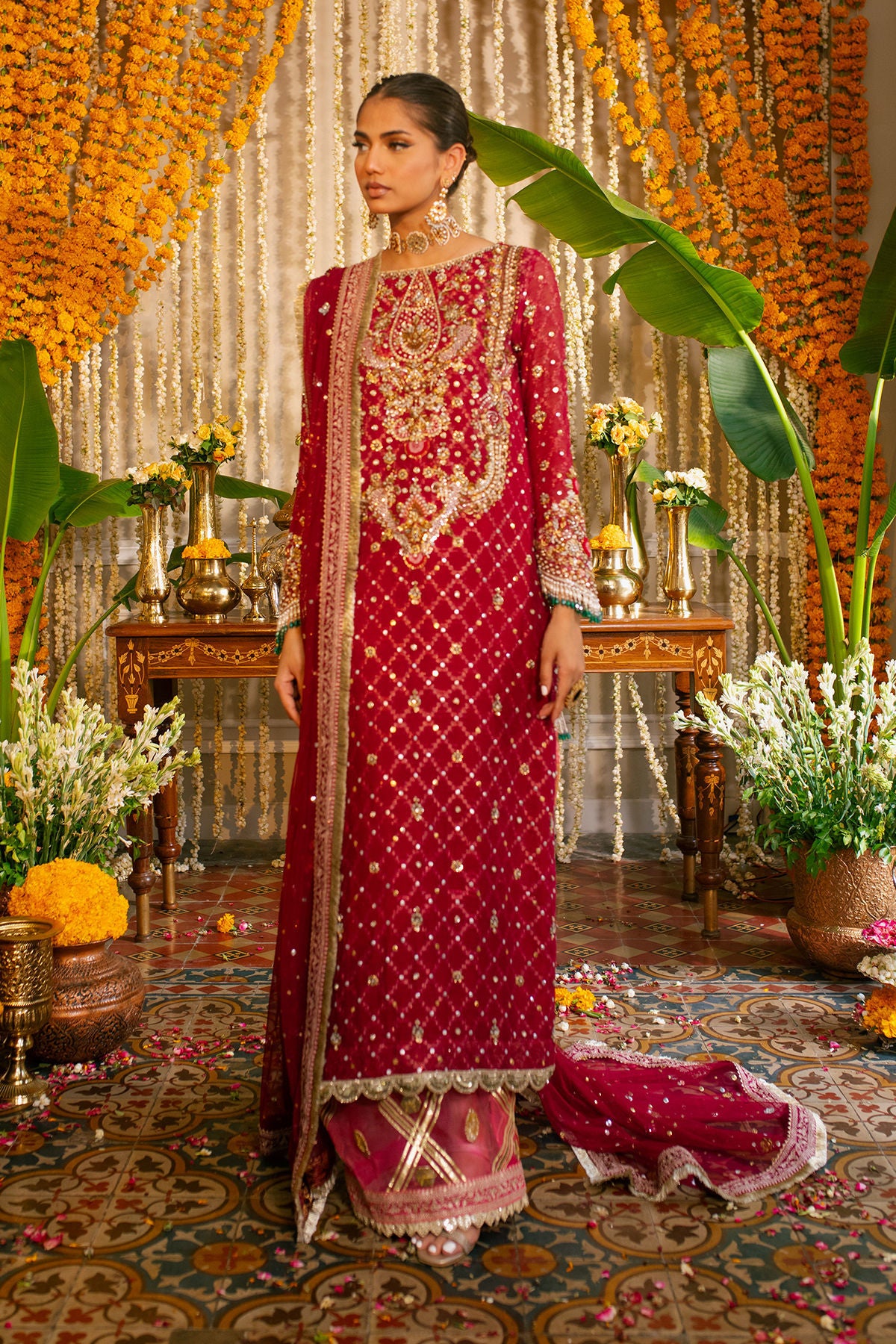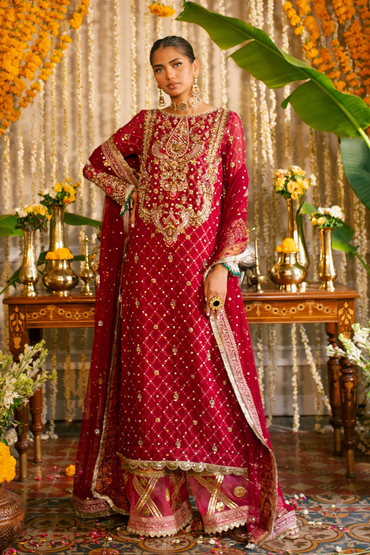 Long silhouette shirt in cherry red shade on pure zari silk net featuring old school zardozi details in silver gold and antique incorporated with resham french knots. The shirt is enhanced with dangling tassels on side slits and is paired with watermelon pink damask izaar featuring gota details. The outfit is paired with net dupatta featuring scattered sequins, zari embroidered border and fringe details.