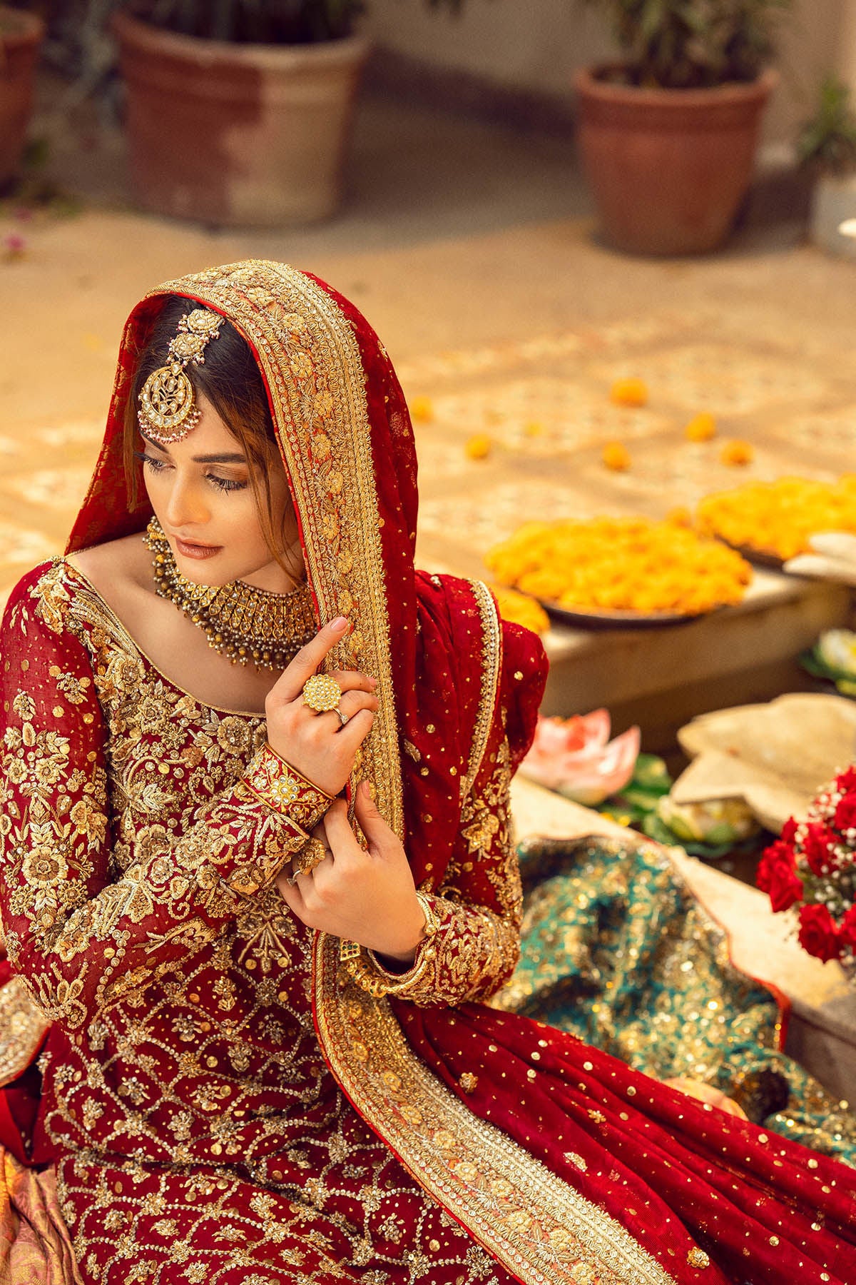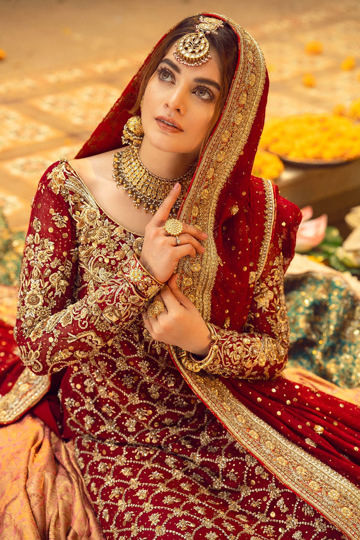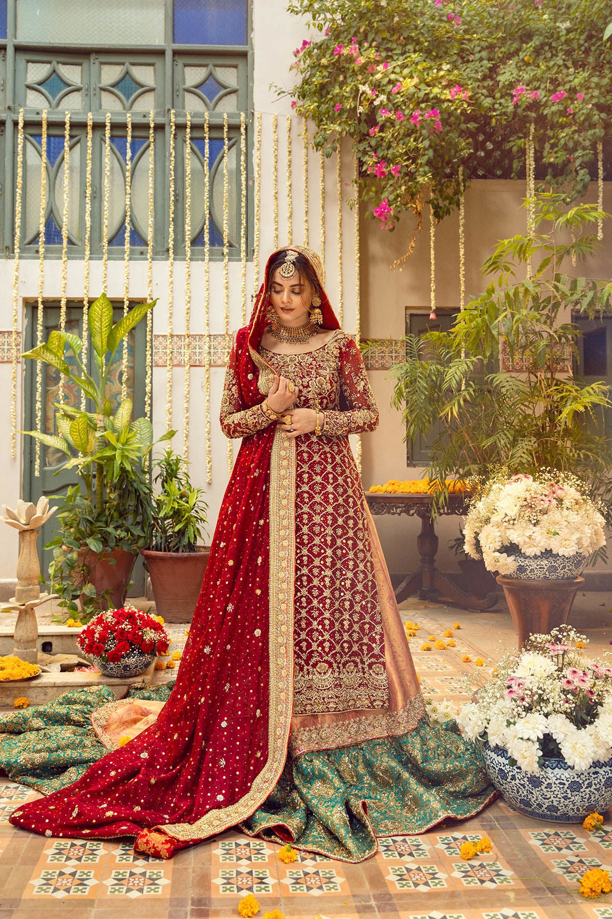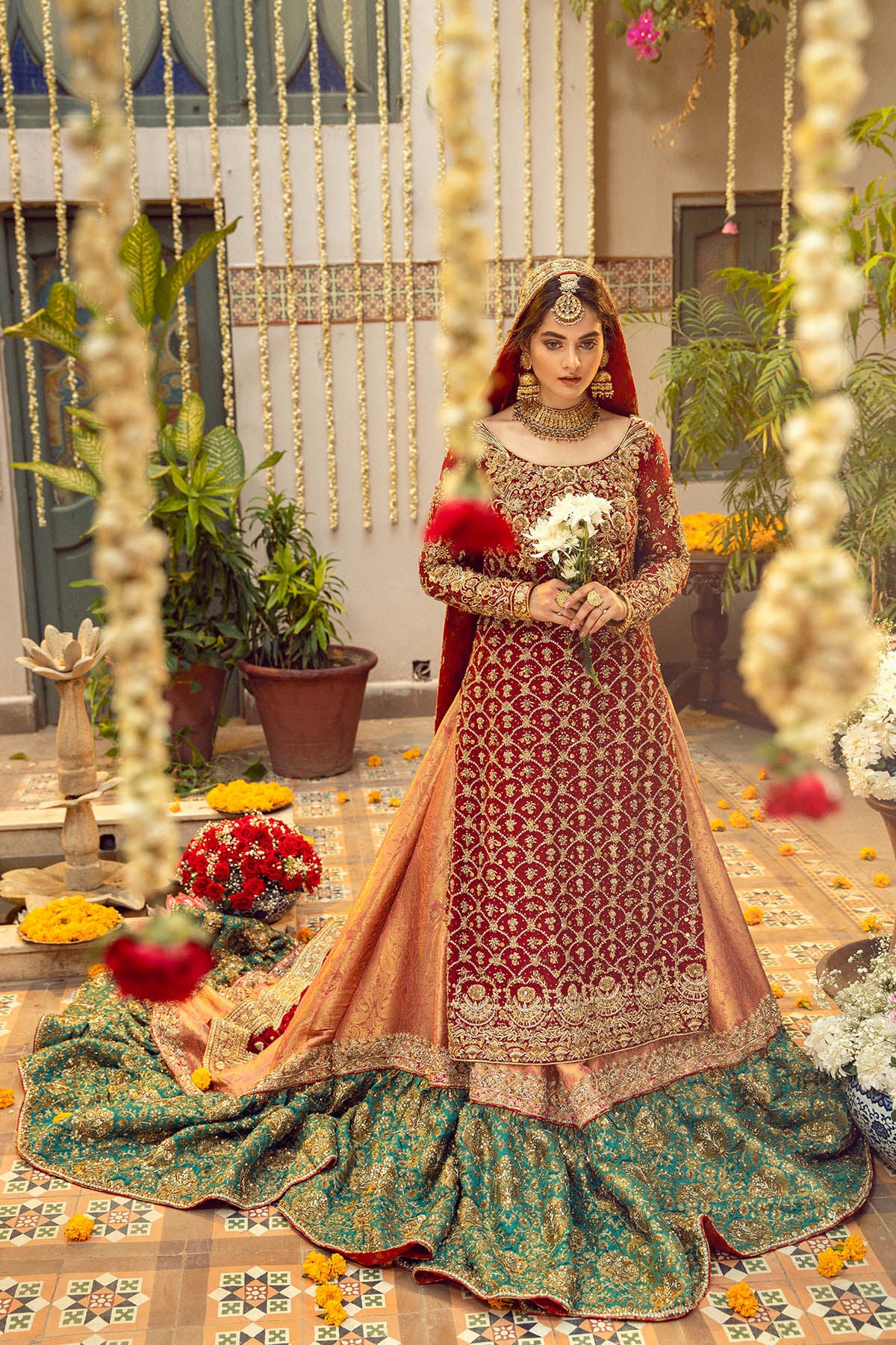 Old school hand embroidered zardozi details on a gorgeous shade of maroon pure silk net A-line shirt. The zardozi details are further adorned with light catching crystals, sequins and kaamdani. The shirt is paired with farshi sharara in peach and electric green, which is further adorned with zardozi details. Deep crimson dupatta with intricate hand embroidered zardozi details enhanced with kaamdani and light catching botis makes this bridal head turning.