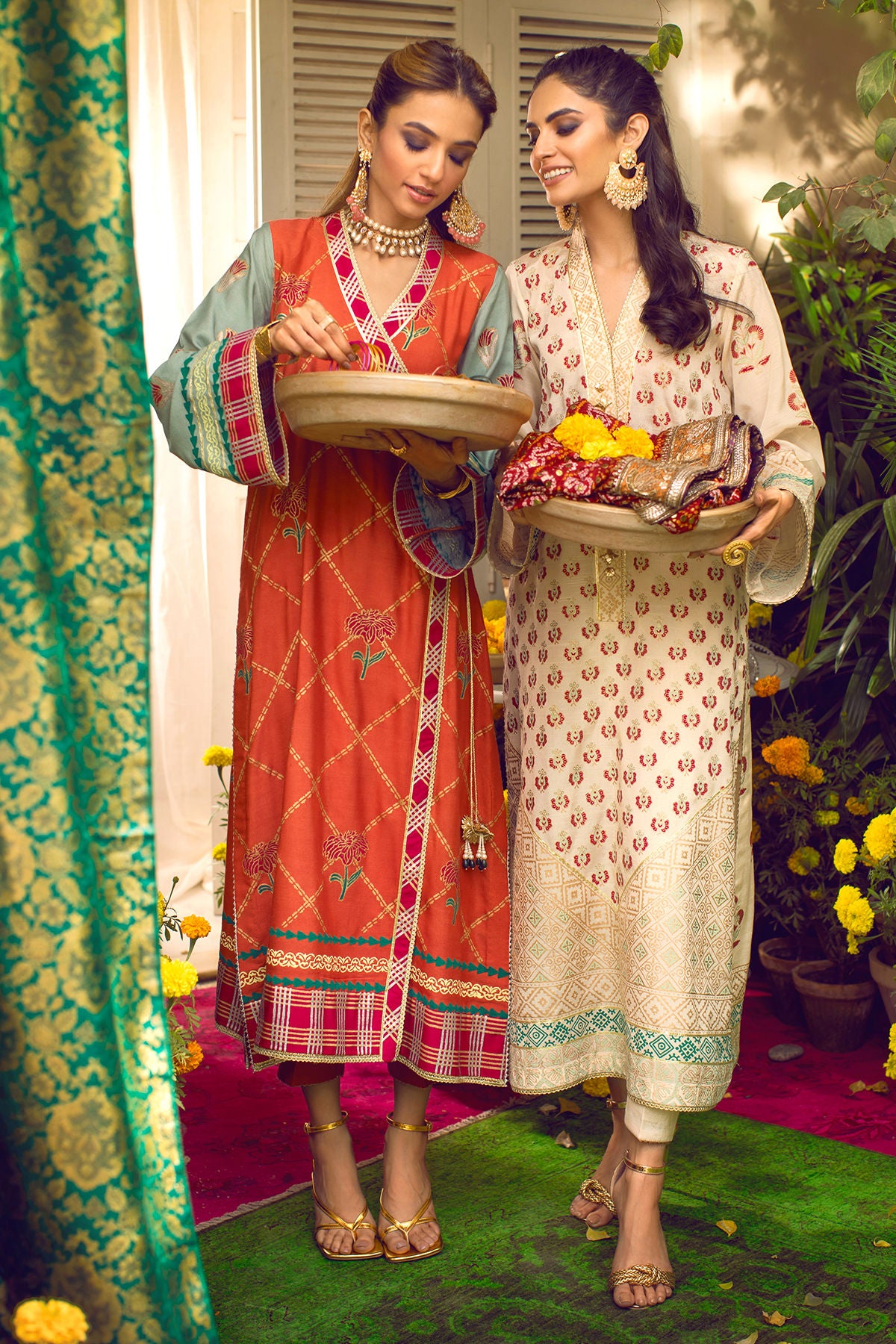 Long silhouette color blocked angharka on cotton net canvas featuring hand block printed details in striking shades. The angharka is enhanced with handcrafted tassels, it comes with straight pants featuring gota on the hem.