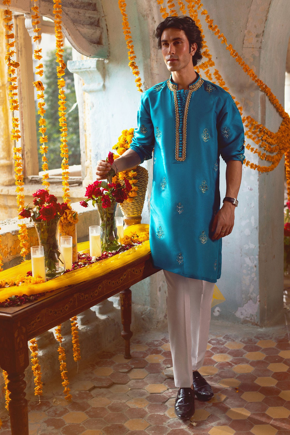 Razib presents a knee-length kurta in a striking aquamarine ferozee shade, crafted from pure raw silk canvas. This exquisite piece features self-embroidered silk thread motifs on the center front and sleeves. The neckline is elegantly adorned with handcrafted zardozi details, further enhanced with loop buttons. The kurta is complemented by white straight pants, completing the distinguished look.