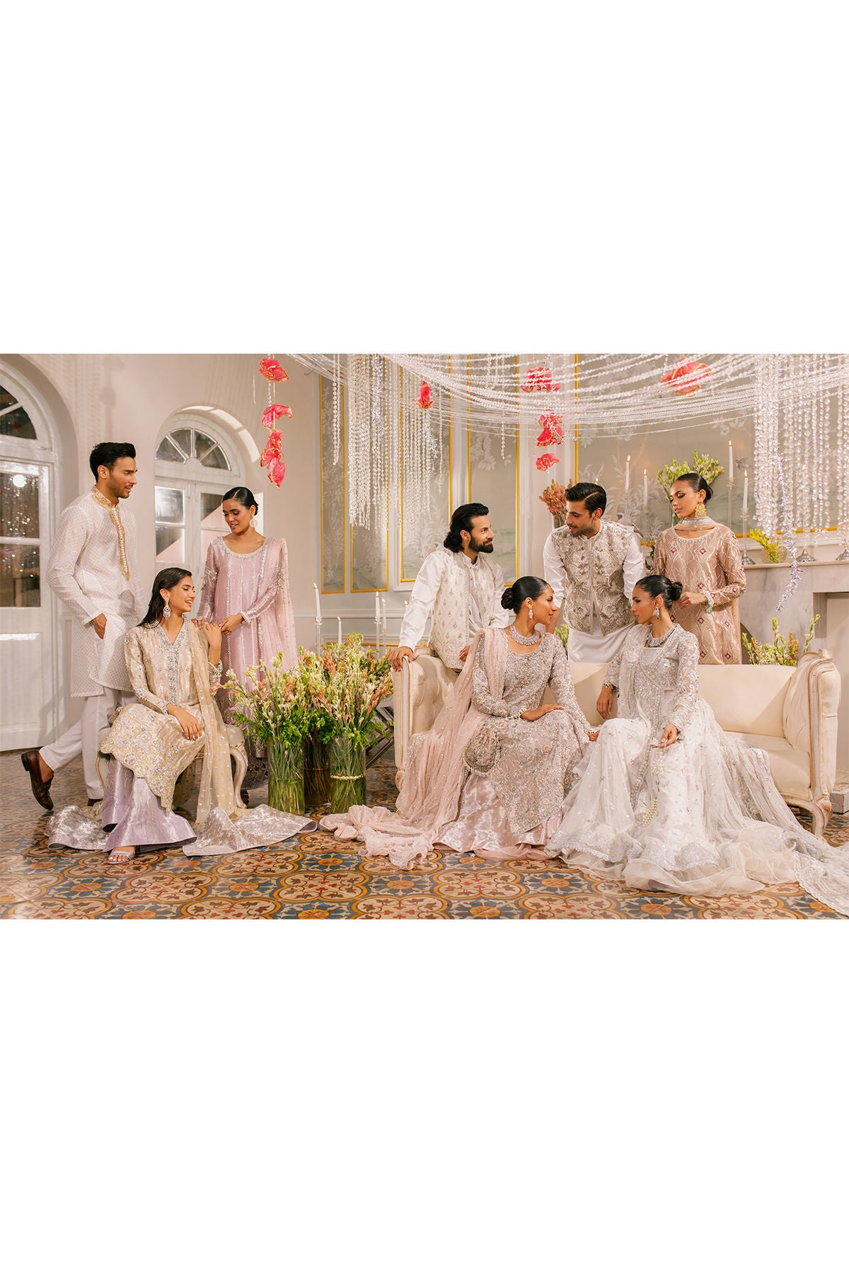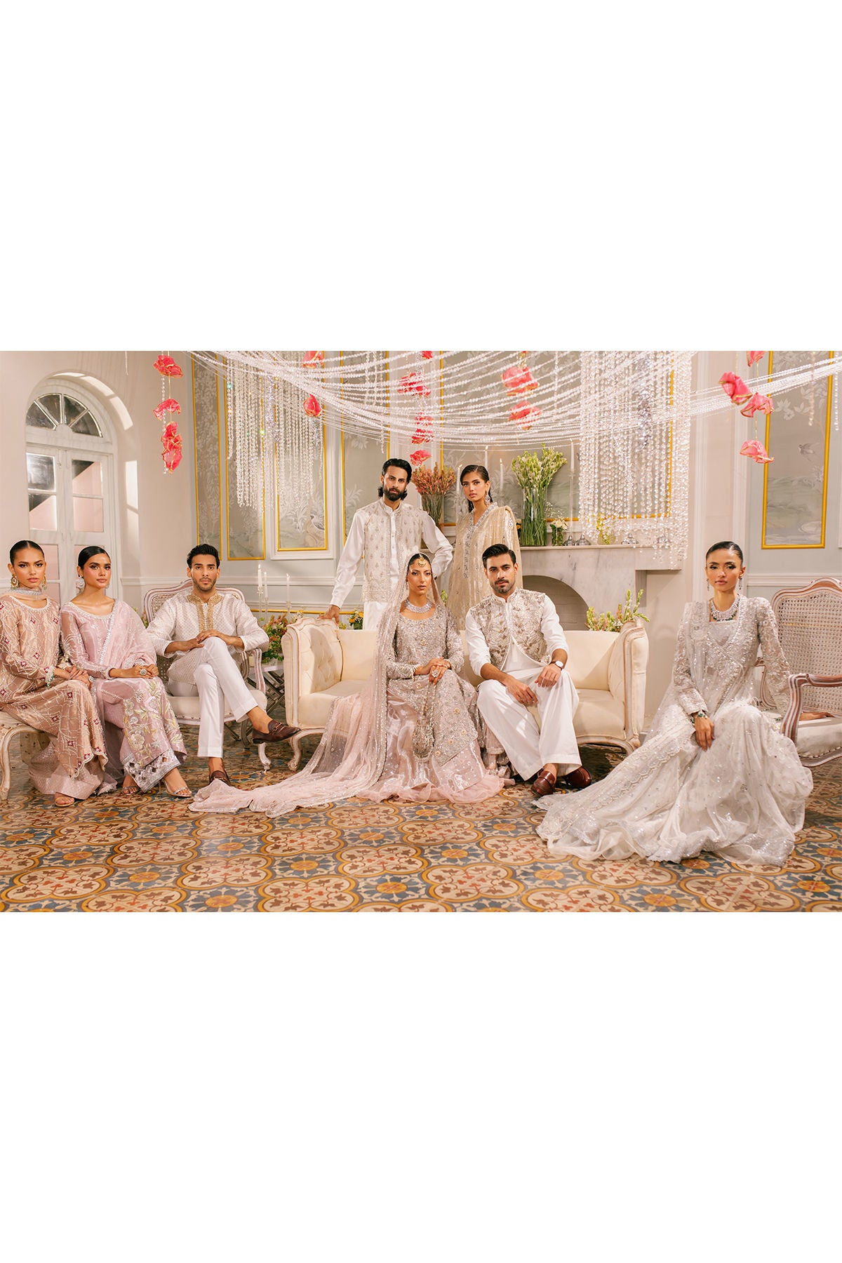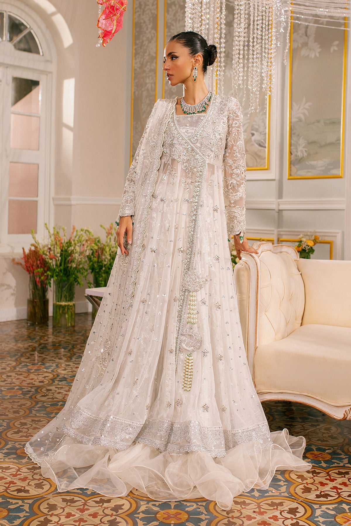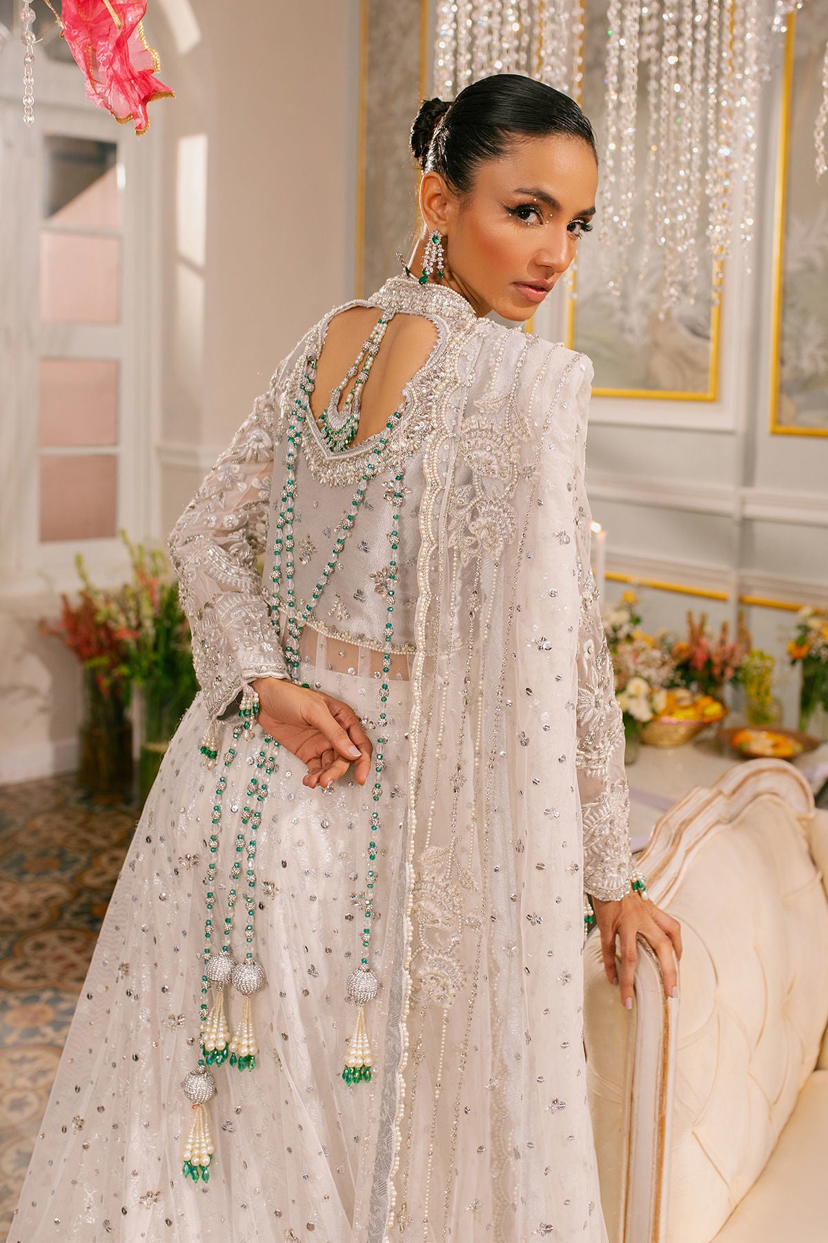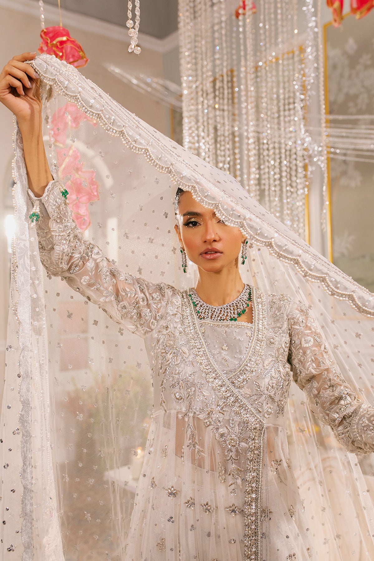 Experience the breathtaking beauty of delicate silk thread rosettes on pure white canvas adorned with radiant light-catching crystals and intricate zardozi work.