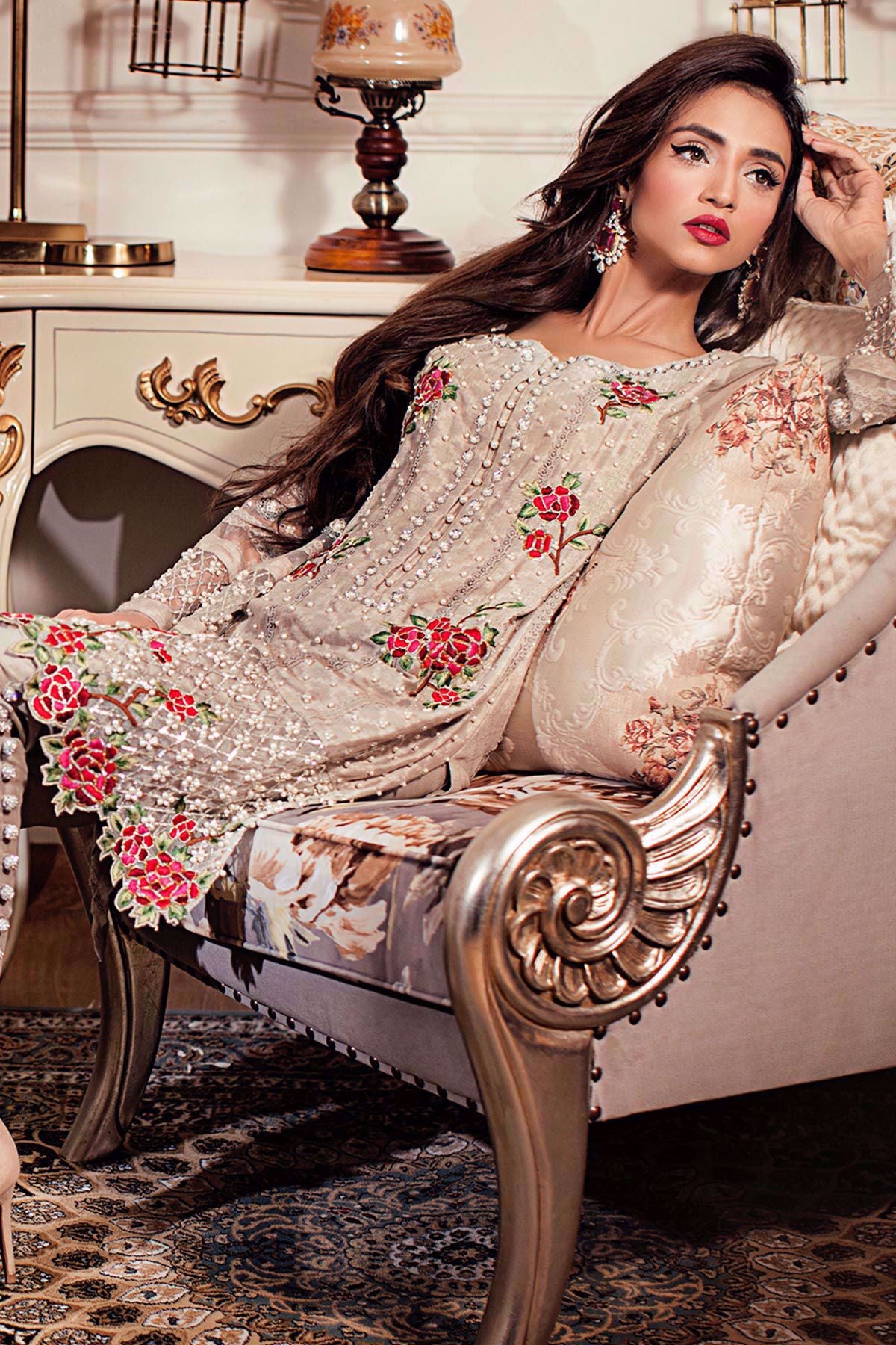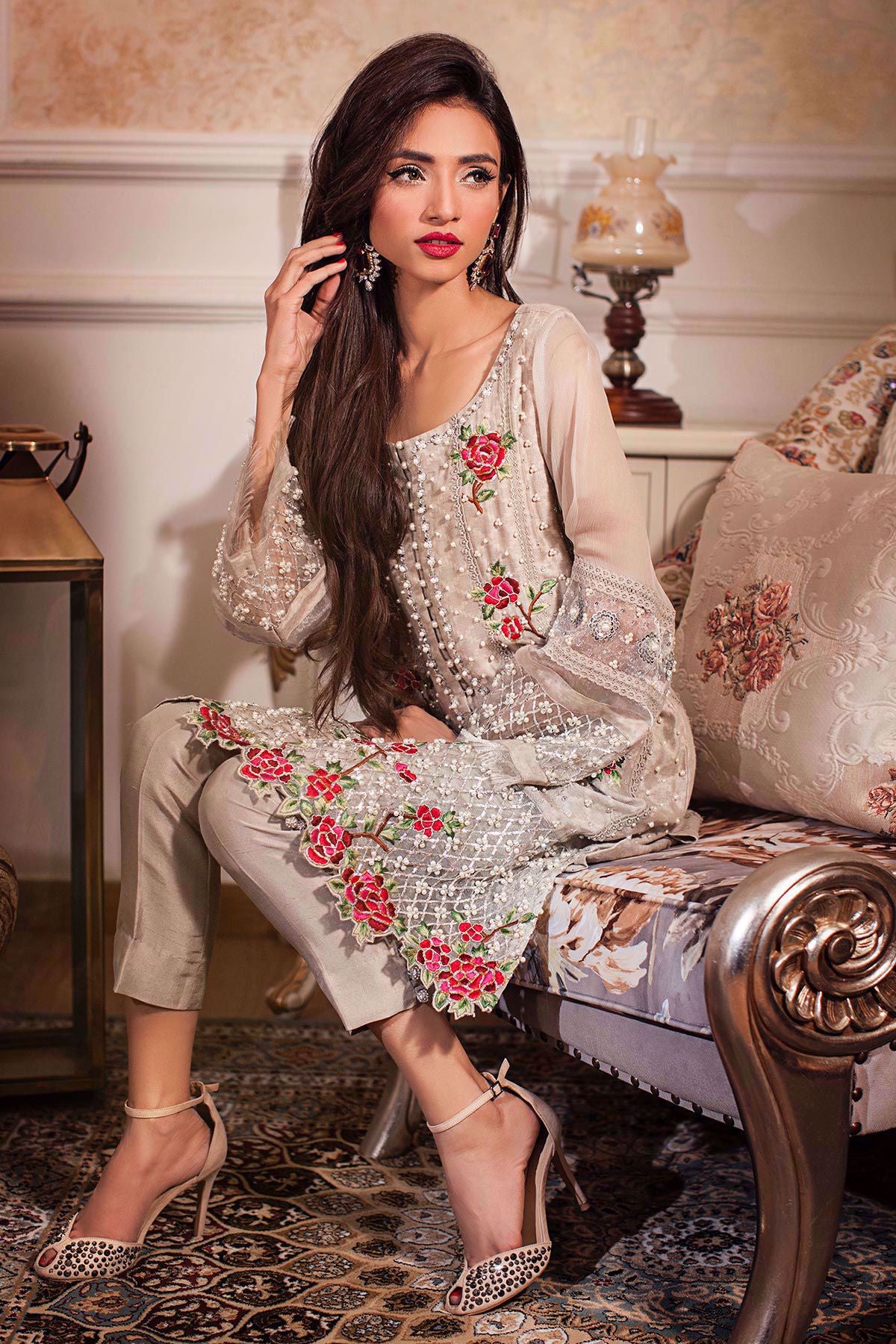 Glamorous and a fantastic way to embrace classical elegance with a modern twist. The ultimate in boudoir chic, in an enchanting Victorian-style pattern of vibrant red roses embroidered in shimmery silk with leaves against a soft and soothing background of Thunder Grey /Black. One of our most strikingly individual designs, it is adorned with an array of iridescence and tactile handwork. Customized and striking work of pearls, stones and sequins on different parts of the outfit while the embroidery is highlighted with pitta and dabka. Perfect choice to add real touch of glamour and elegance for your formal occasions, Regal Diva needs to be seen to be believed. Comes with raw silk studded pants.