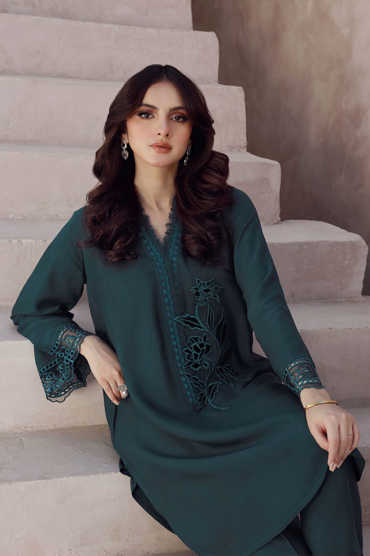 High low co-ord featuring velvet appliqué motifs on center front, the neckline is enhanced with lace and fringe details and the sleeves are adorned with schiffli. The top is paired with matching shalwar for a sleeker look.
