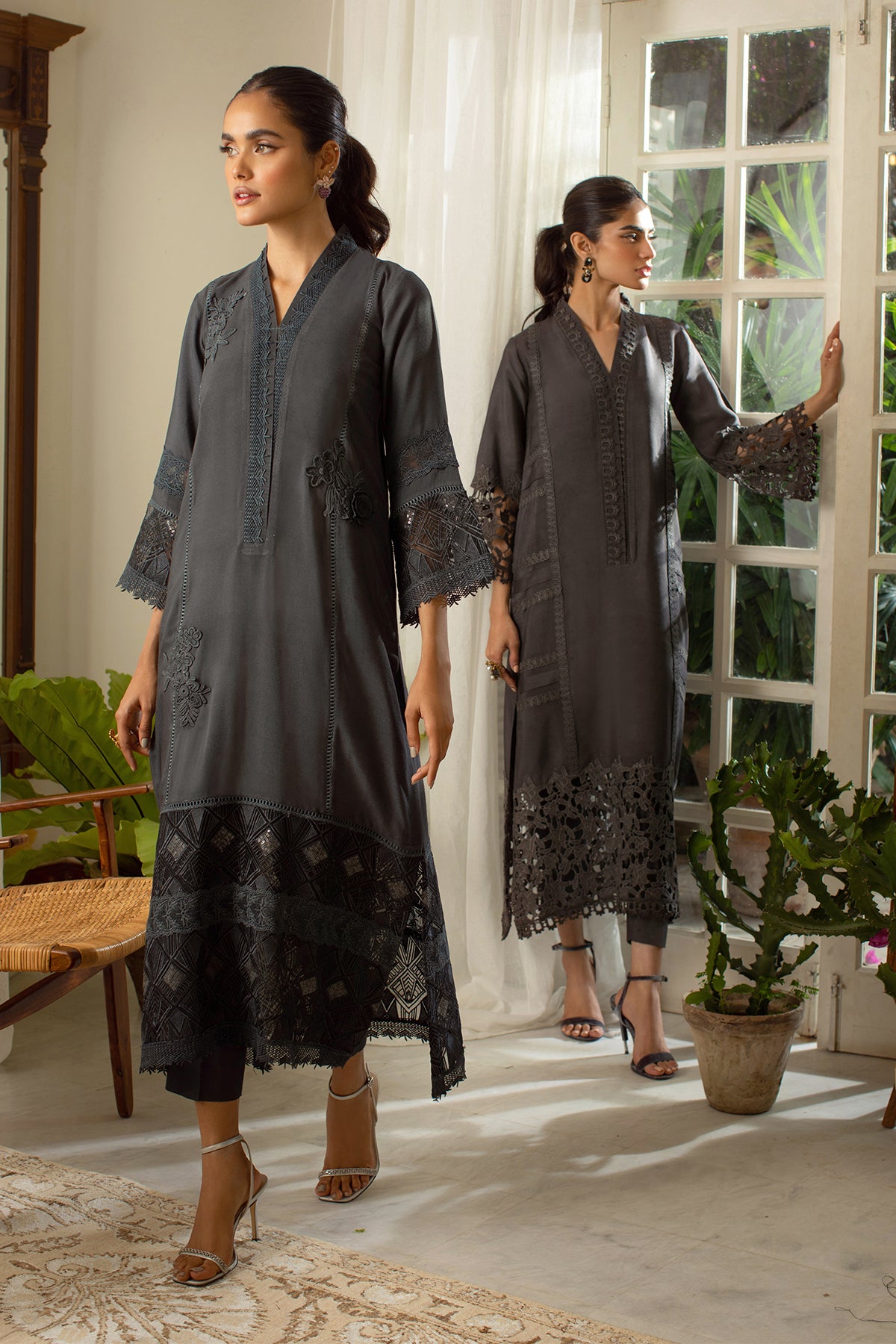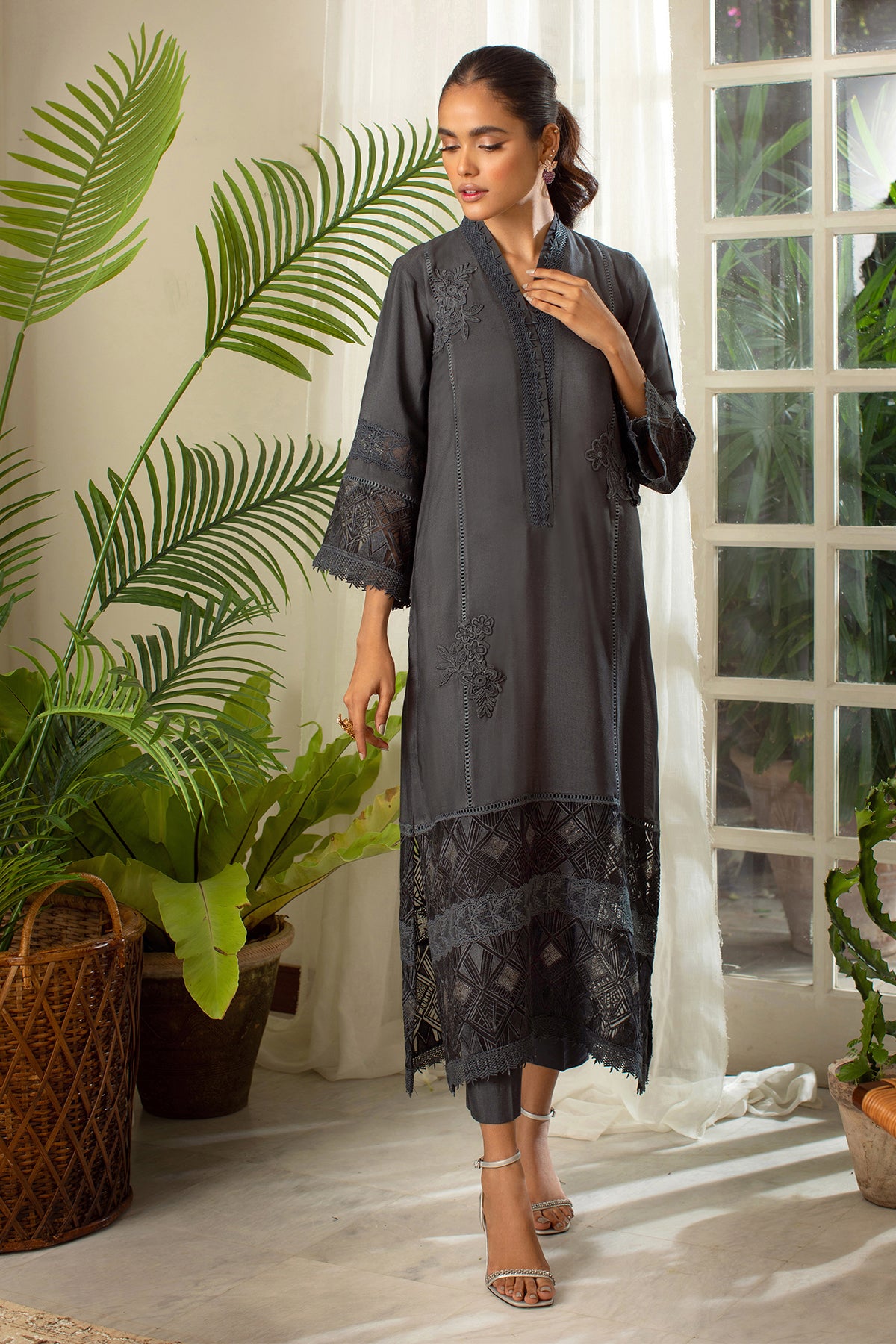 Long silhouette cotton net shirt featuring lace and appliqué bunches on centre front in a head turning Sardine grey shade, the hemline is adorned with embroidered organza and lace details featuring sequins bling. The shirt can be paired with straight matching pants.