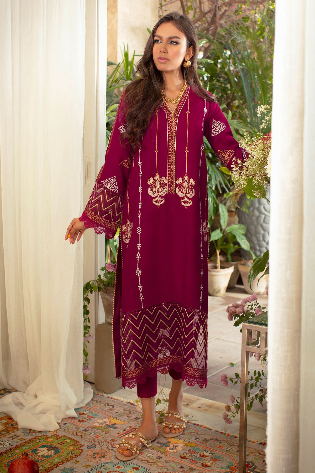 Long silhouette cotton net shirt featuring embroidered organza hemline incorporated with hand block print and gota details. The shirt can be paired with matching straight pants and gota edgings.