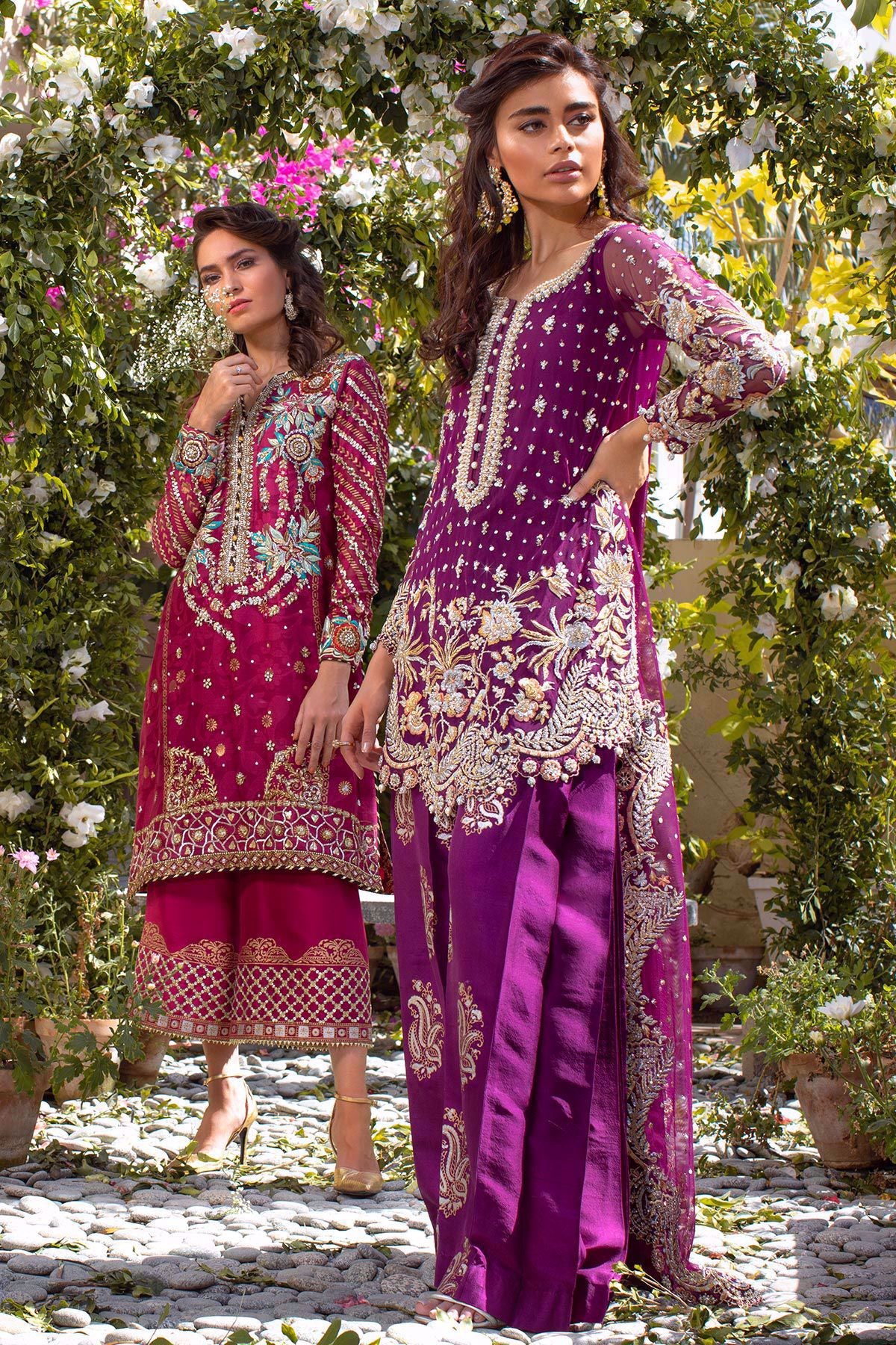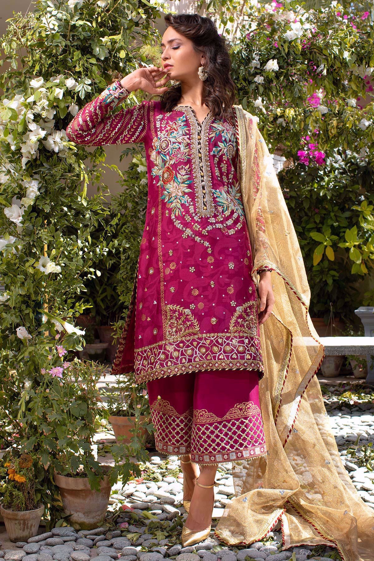 Straight silhouette deep pink shirt with handcrafted silk thread rosettes details on neckline incorporated with dabka, naqshi and stones, the self-patterned pure silk net canvas is further enhanced with hand block printed details. The shirt comes with pure raw silk izaar with block printed details further enhanced with sequins. Gold tissue net dupatta with sequins and laces finishing completes the look.