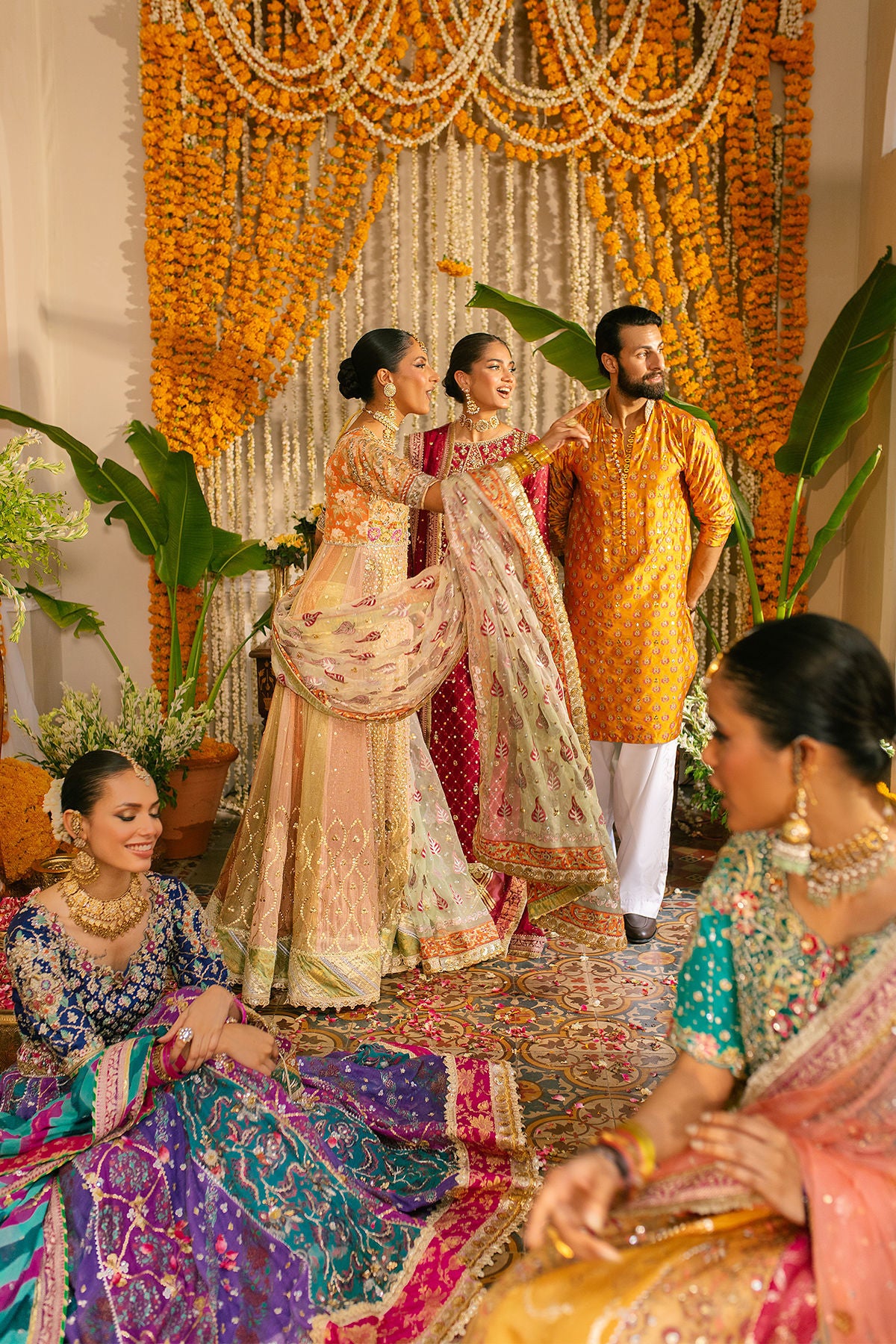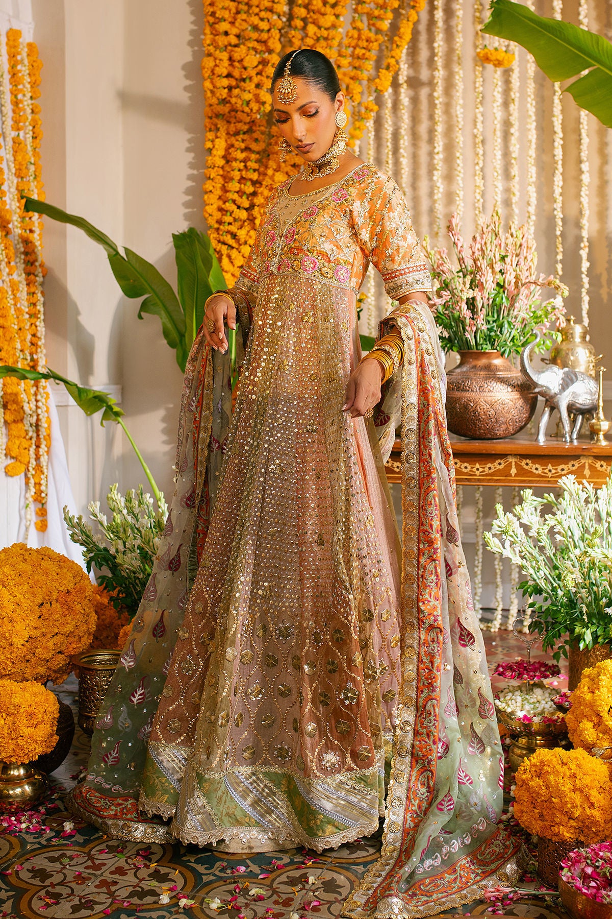 Shimmering accents of light catching sequins on subtle pastel panels rendered with digital printed bodice blended with old school zardozi and gota details.
