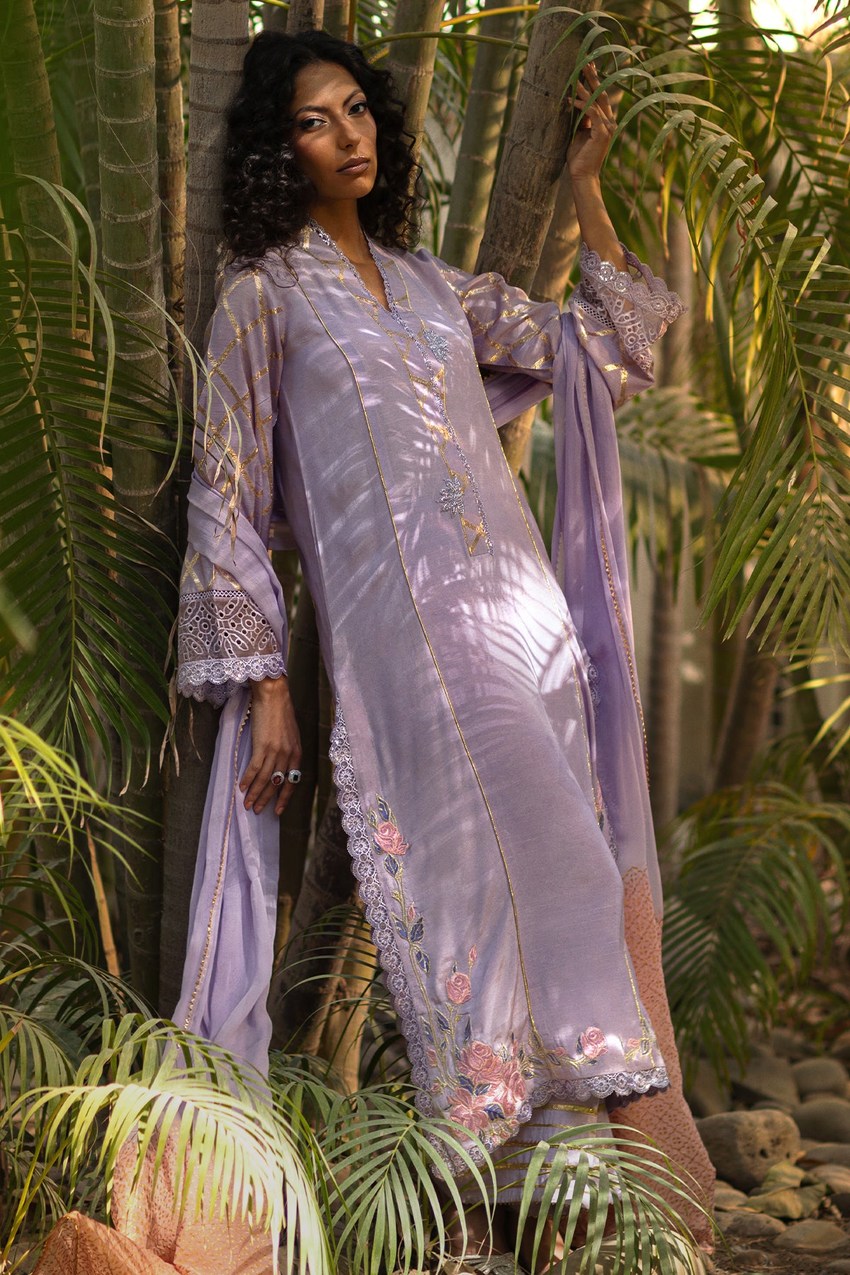 A flowing silhouette shirt in a soft lavender hue, crafted from luxurious silk and adorned with delicate appliqué floral detailing along the hem. The neckline is refined with subtle Lurex accents and elevated with intricately crafted silver zari rosettes. The ensemble is completed with a complimentary ombre chiffon dupatta and a coordinating izaar, finished with graceful gota accents for a refined, elegant finish.