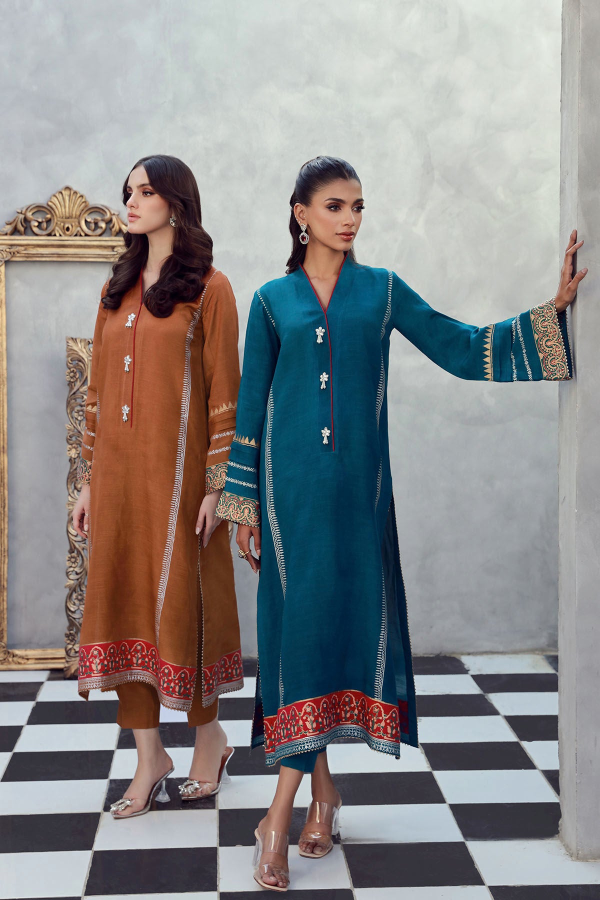Long silhouette shirt on blended raw silk featuring hand block printed details. The neckline is adorned with handcrafted pearl embellishments. The shirt can be paired with matching raw silk pants to create more festive look.