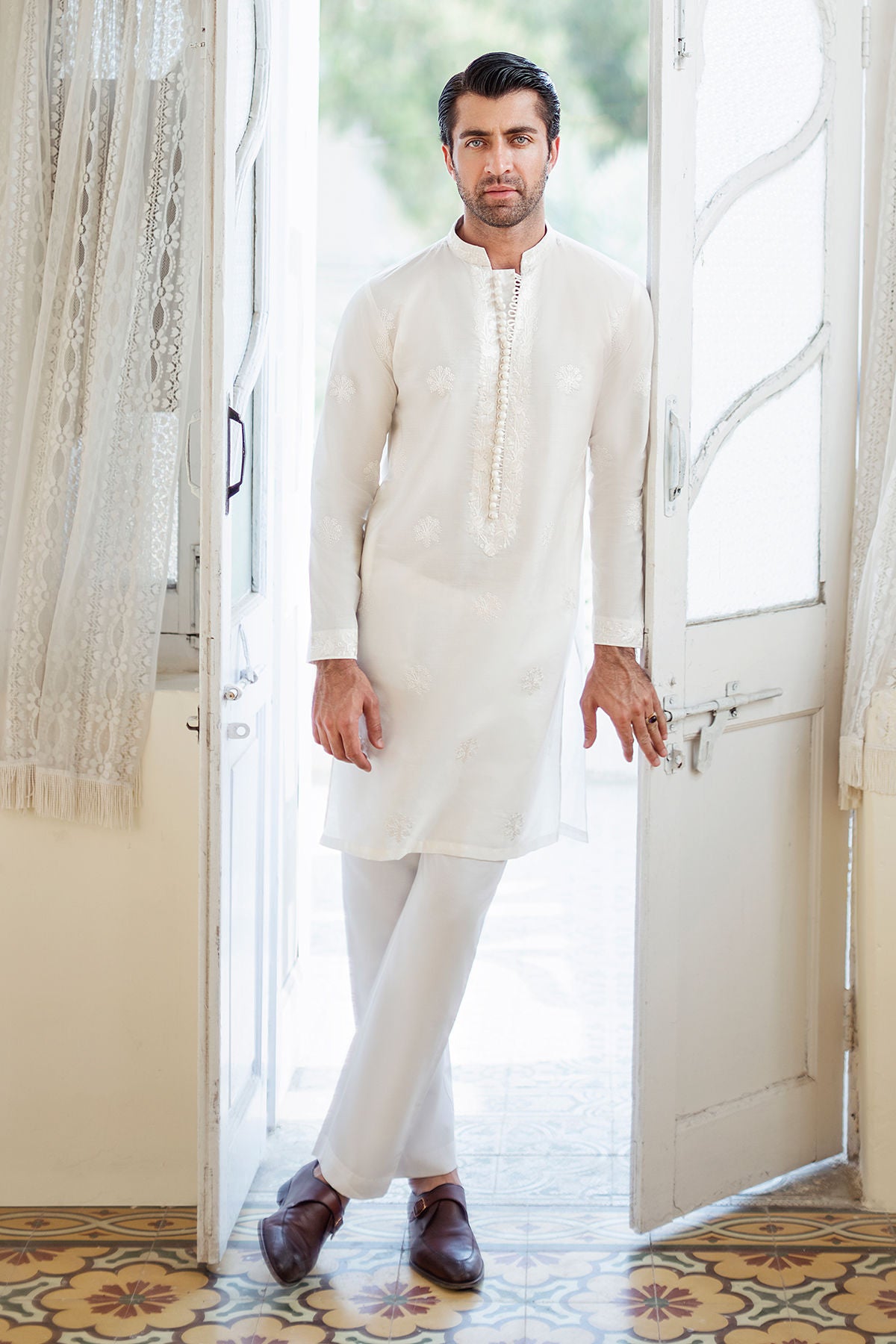 Pristine white kurta featuring floral embroidered details on neckline and miniature motifs all over. The kurta can be paired with white cotton pants.