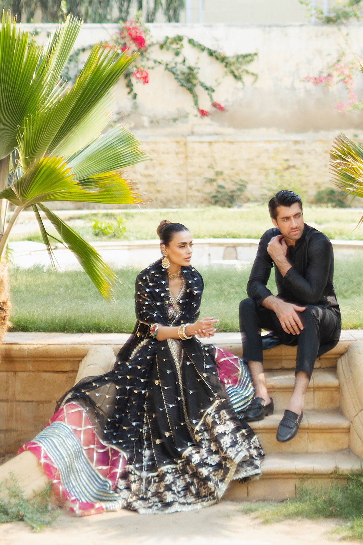 Pristine black kurta featuring self embroidered details on neckline and hem . The neckline of the kurta is adorned with loops and handcrafted buttons. The kurta can be paired with straight cotton pants.