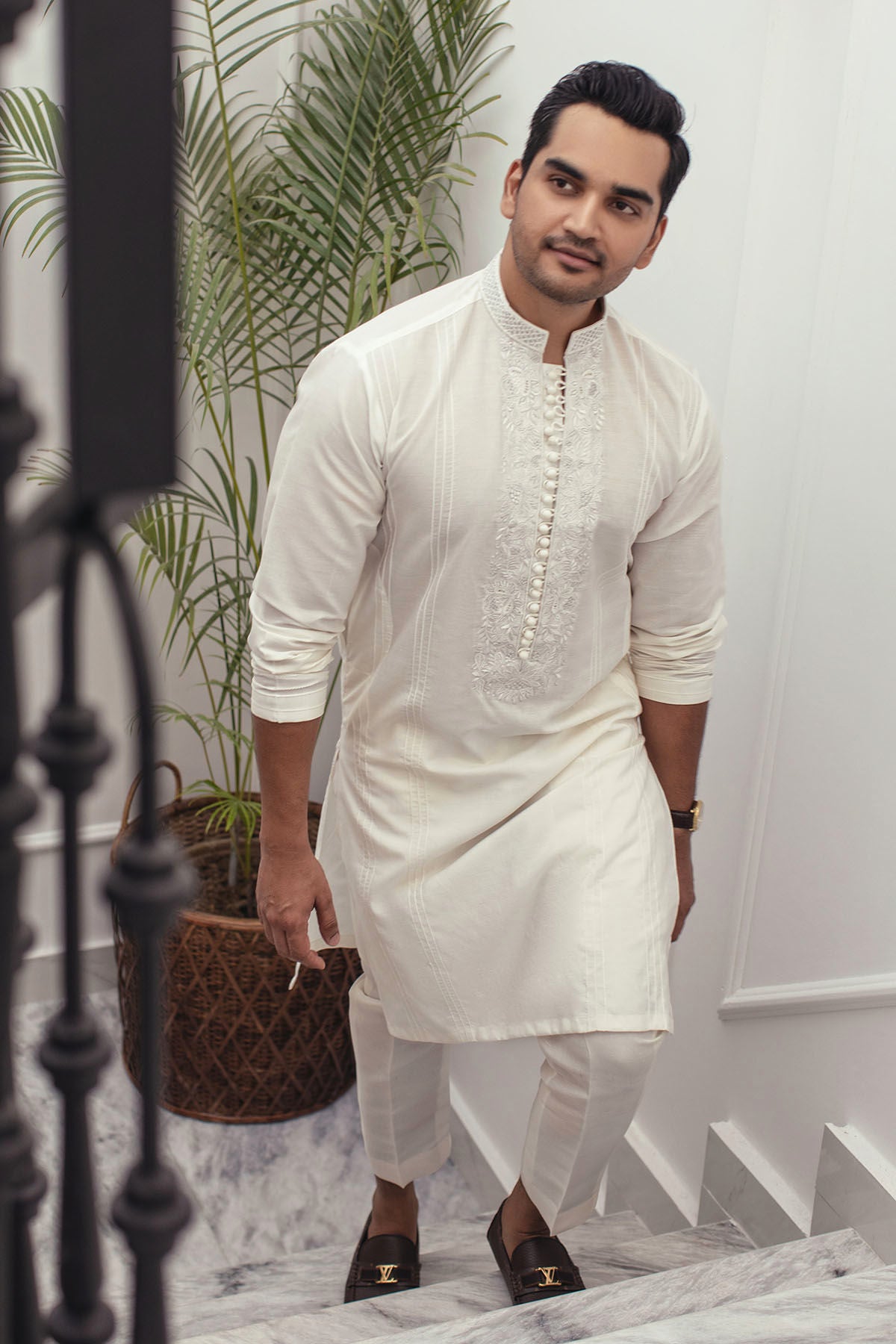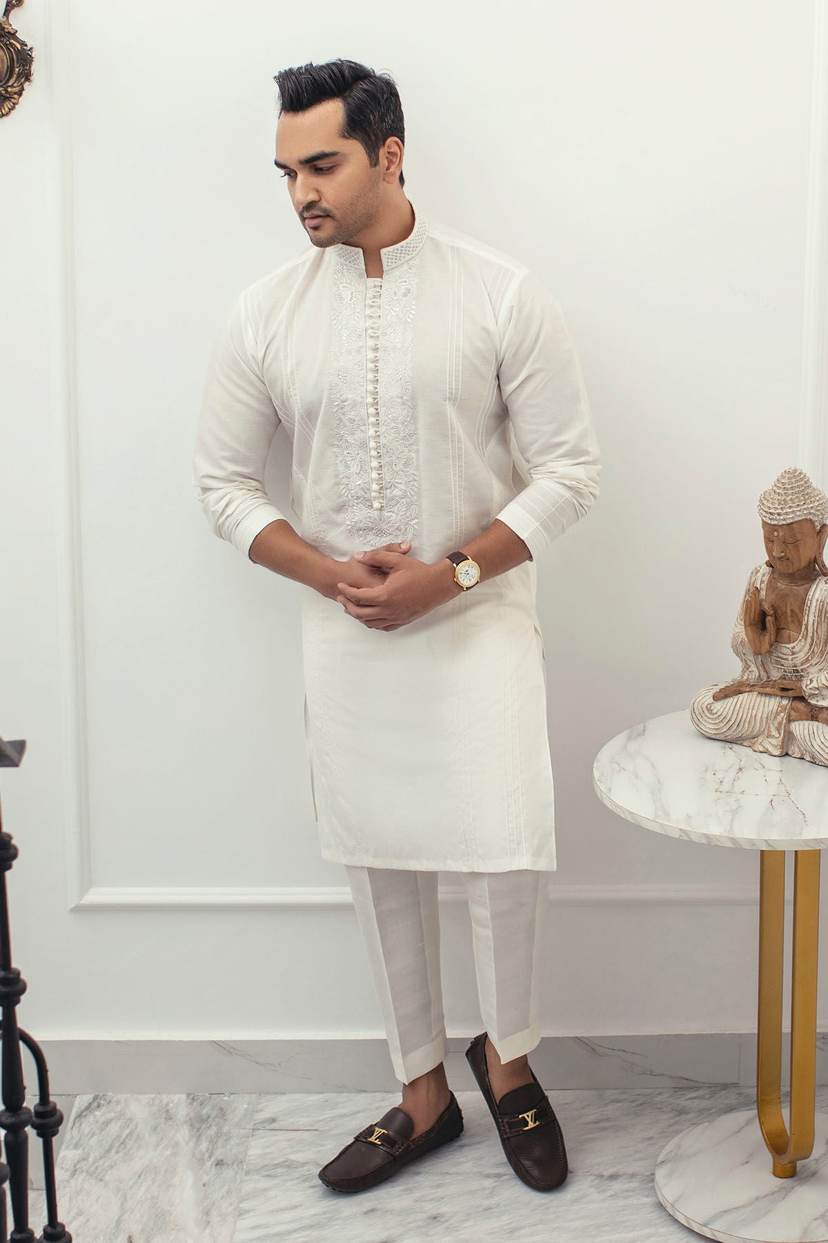 Ox silk kurta on opulent white canvas featuring pin tucks details on centre front. The neckline is adorned with silk thread resham details which are enhanced with cutwork and silver shimmering zari. The kurta can be paired with straight cotton matching pants.