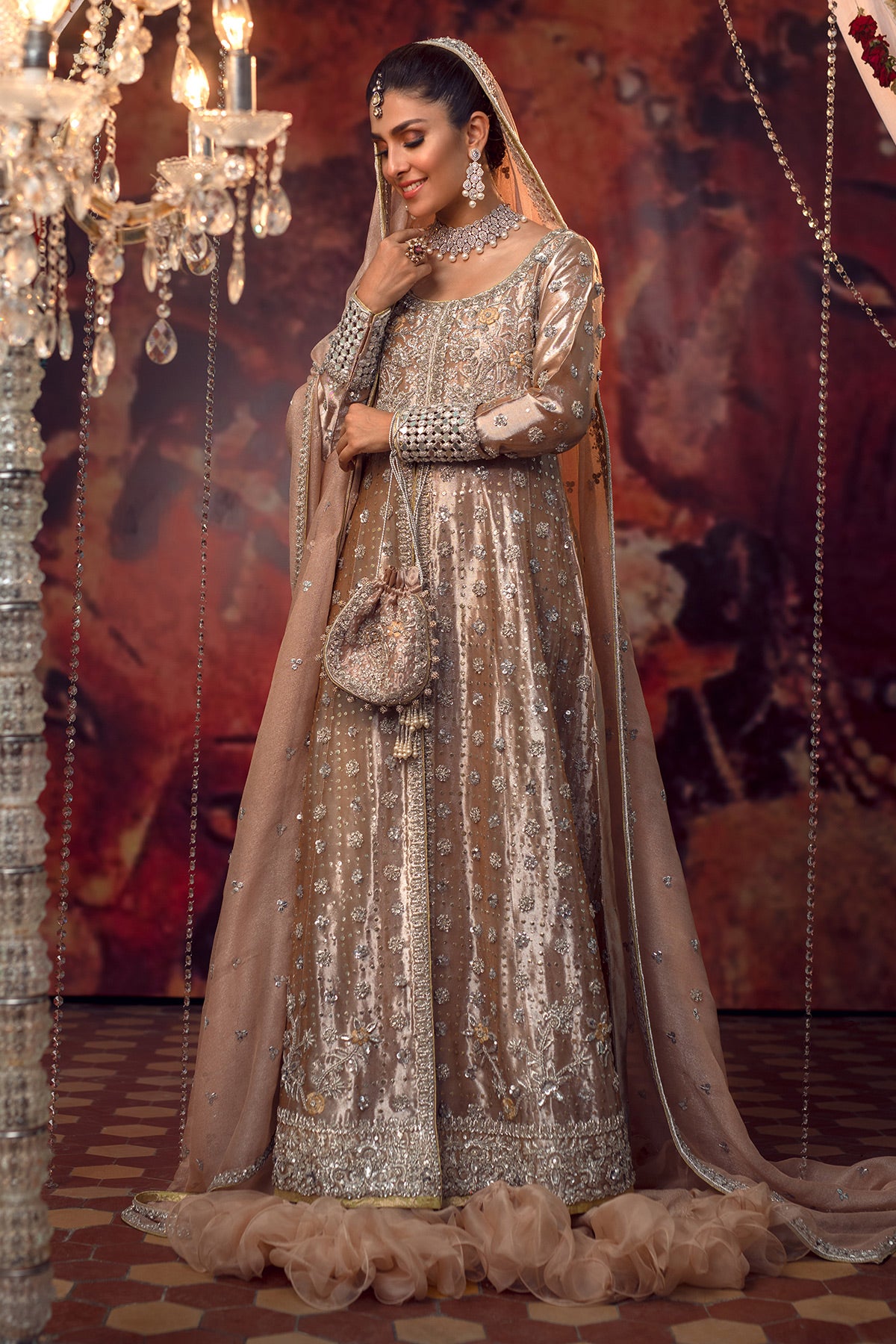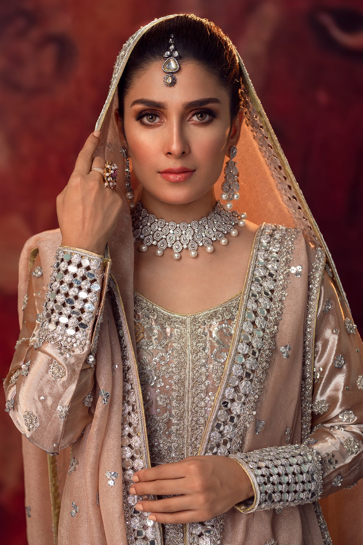 Rose gold floor-length A-line shirt with meticulous hand embroidered details in all silver on Lamé canvas incorporated with peach and gold silk thread rosettes, the shirt is layered over two-legged organza ruffled lehnga and cutwork mirror dupatta.