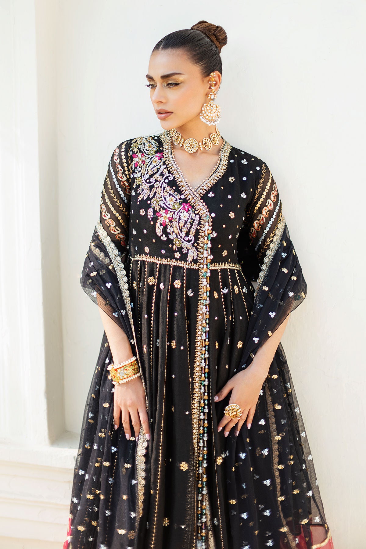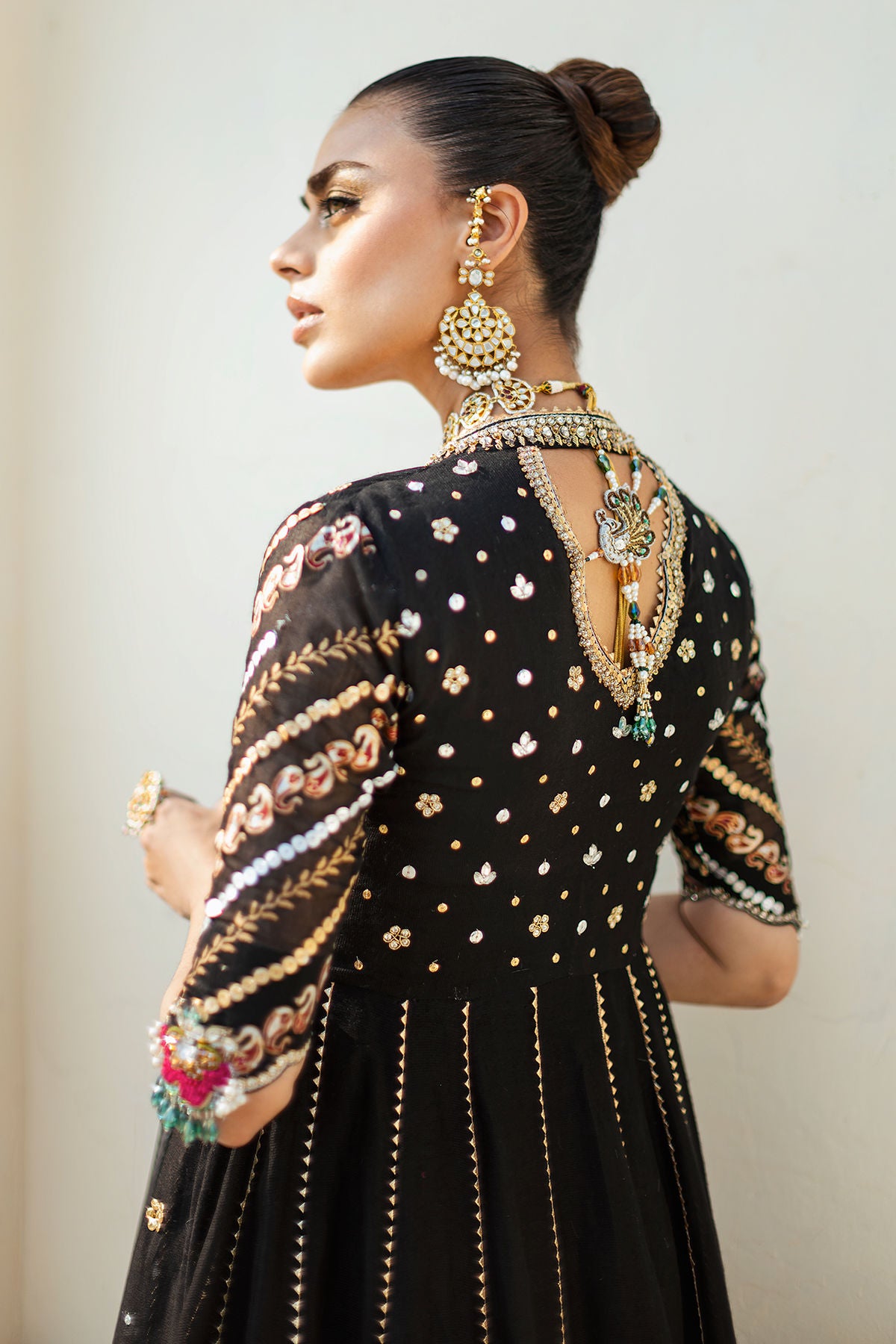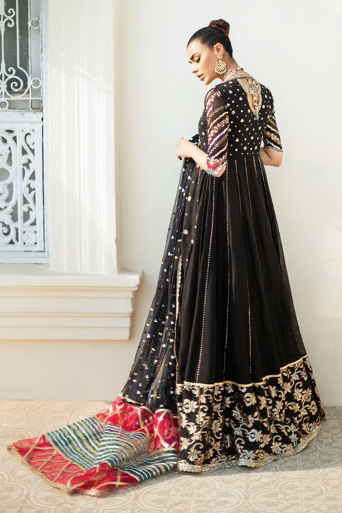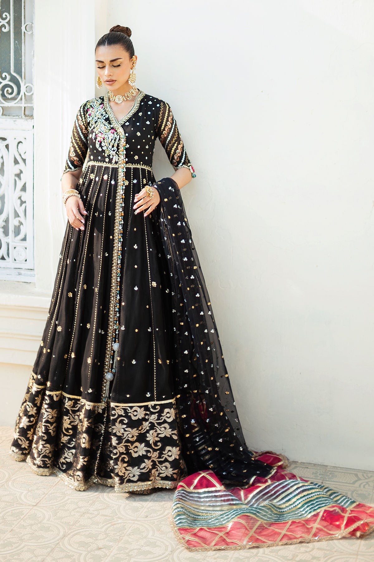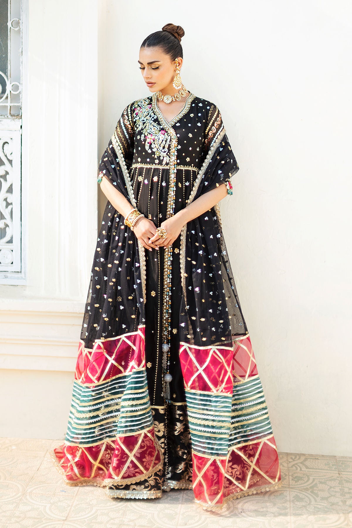 Floor length Kalidar Angharka in deep black shade on striped organza canvas featuring zardozi and resham details on bodice. The hemline is adorned with Lamé panel and sequins all over. The centre front is adorned with handcrafted tassels. The head turning back keyhole features handcrafted peacock tassel. The Kalidar is paired with dhaka pajama and can be paired with color blocked organza dupatta featuring sequins and old school gota finishing.