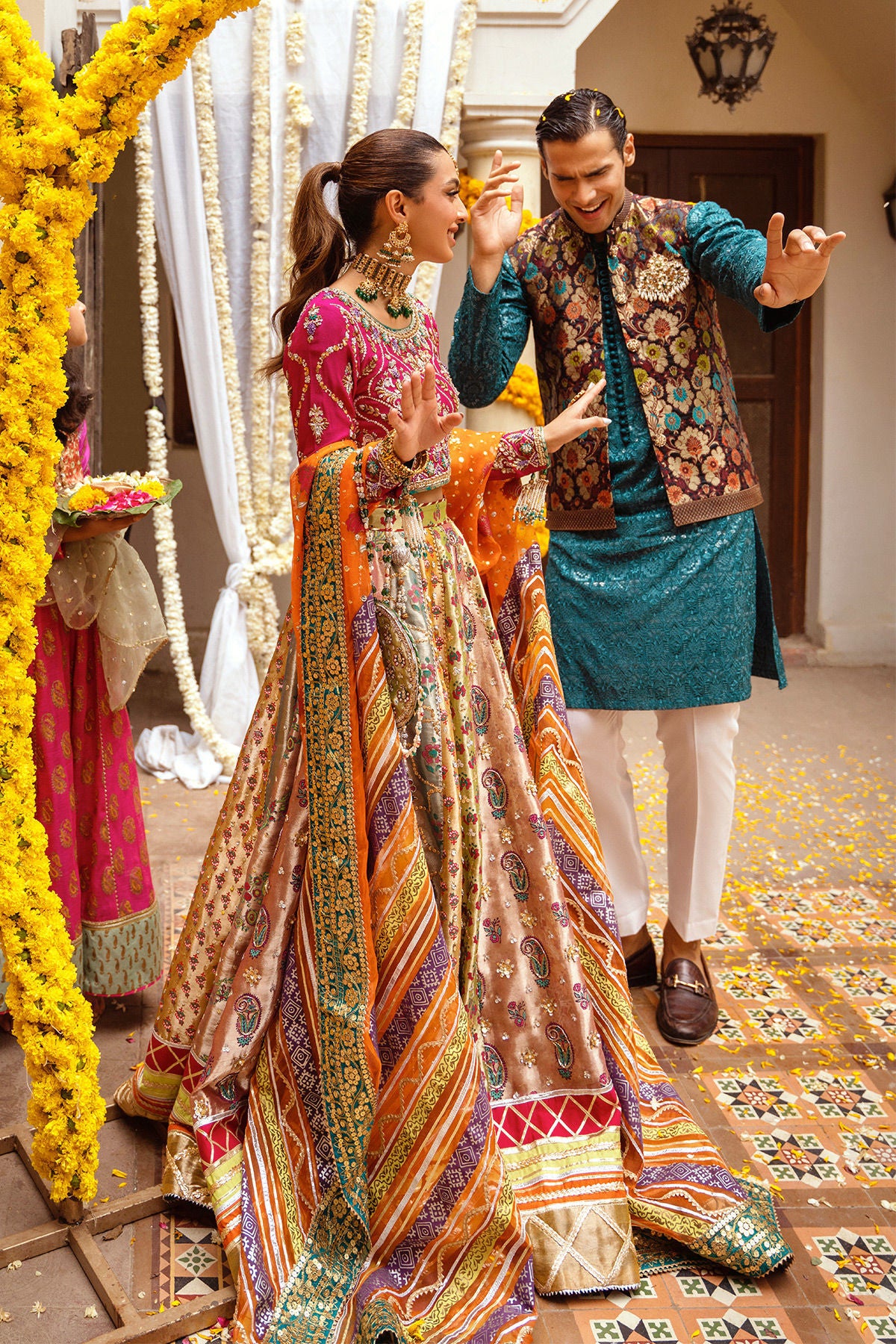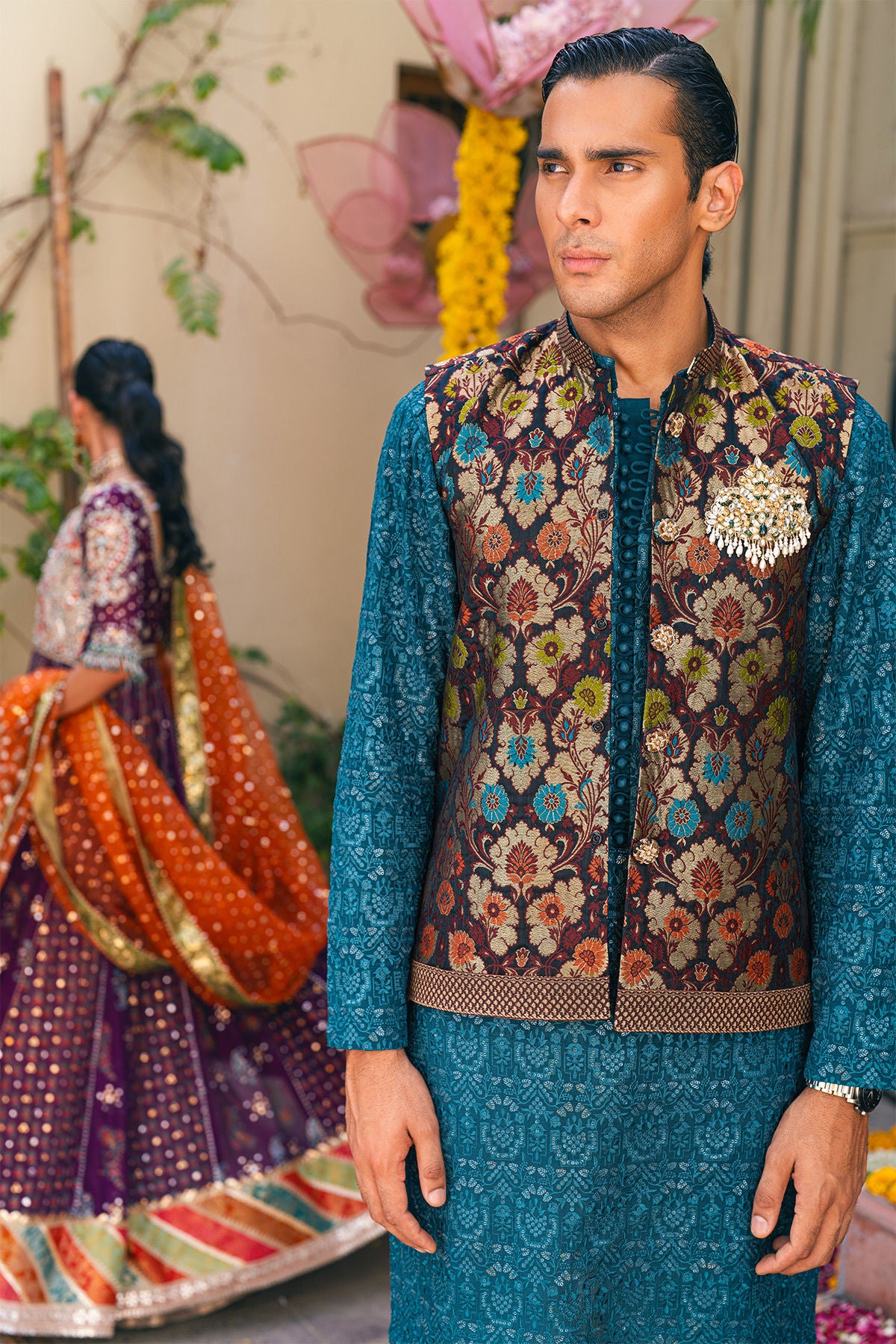 Pure damask waistcoat featuring pop of silk thread multicolored motifs adorned with handcrafted bejeweled embellishments paired with light-catching sequins kurta in deep aquamarine shade.