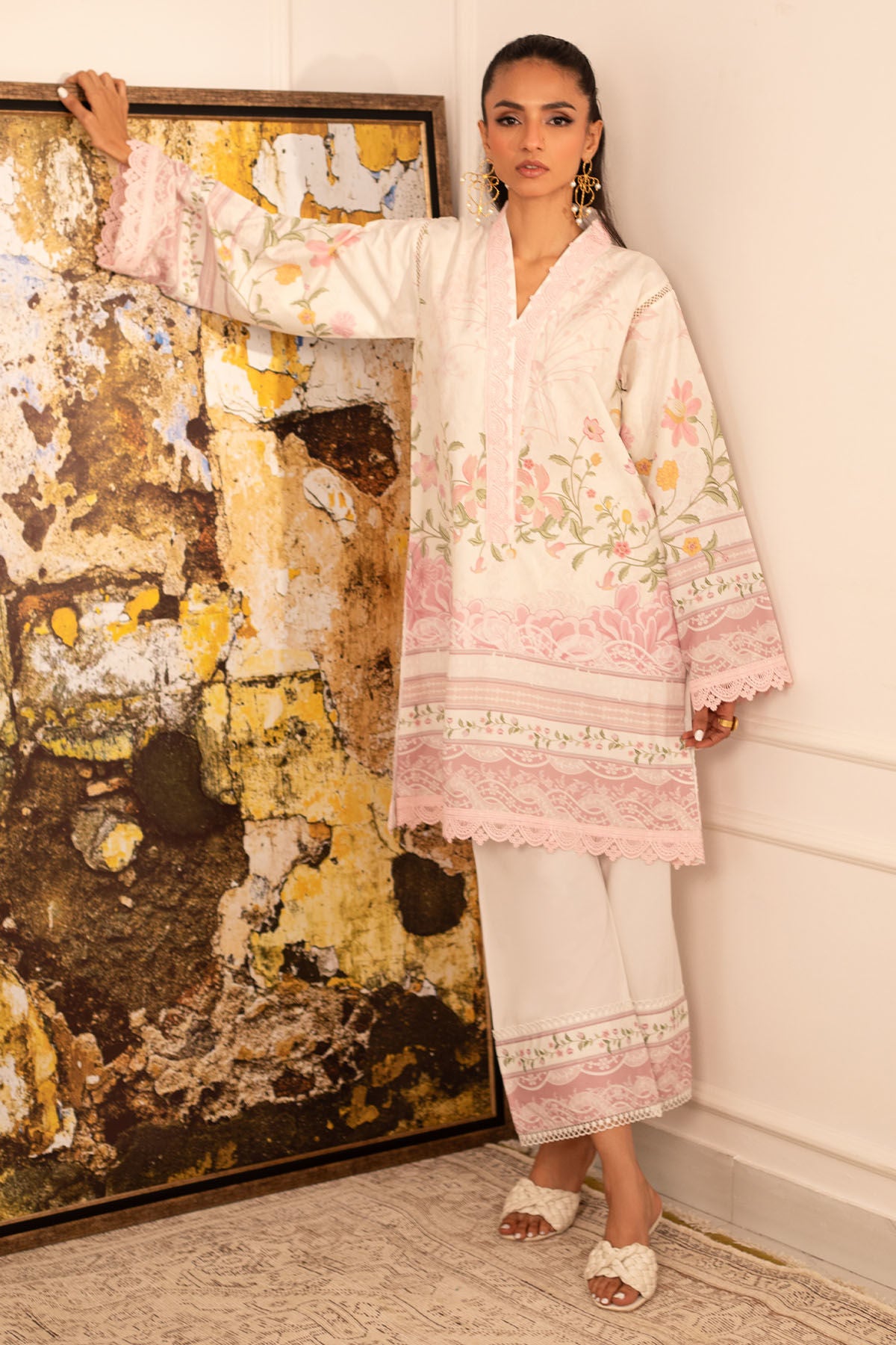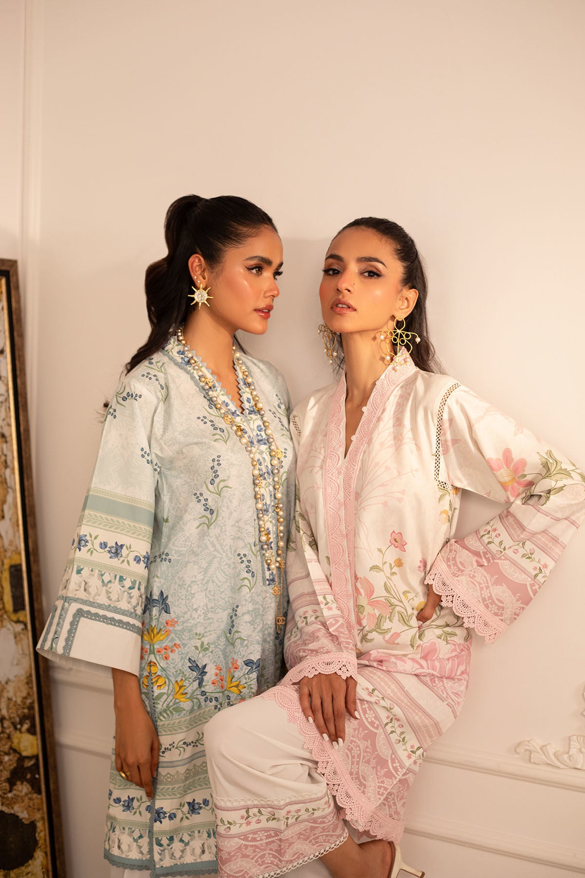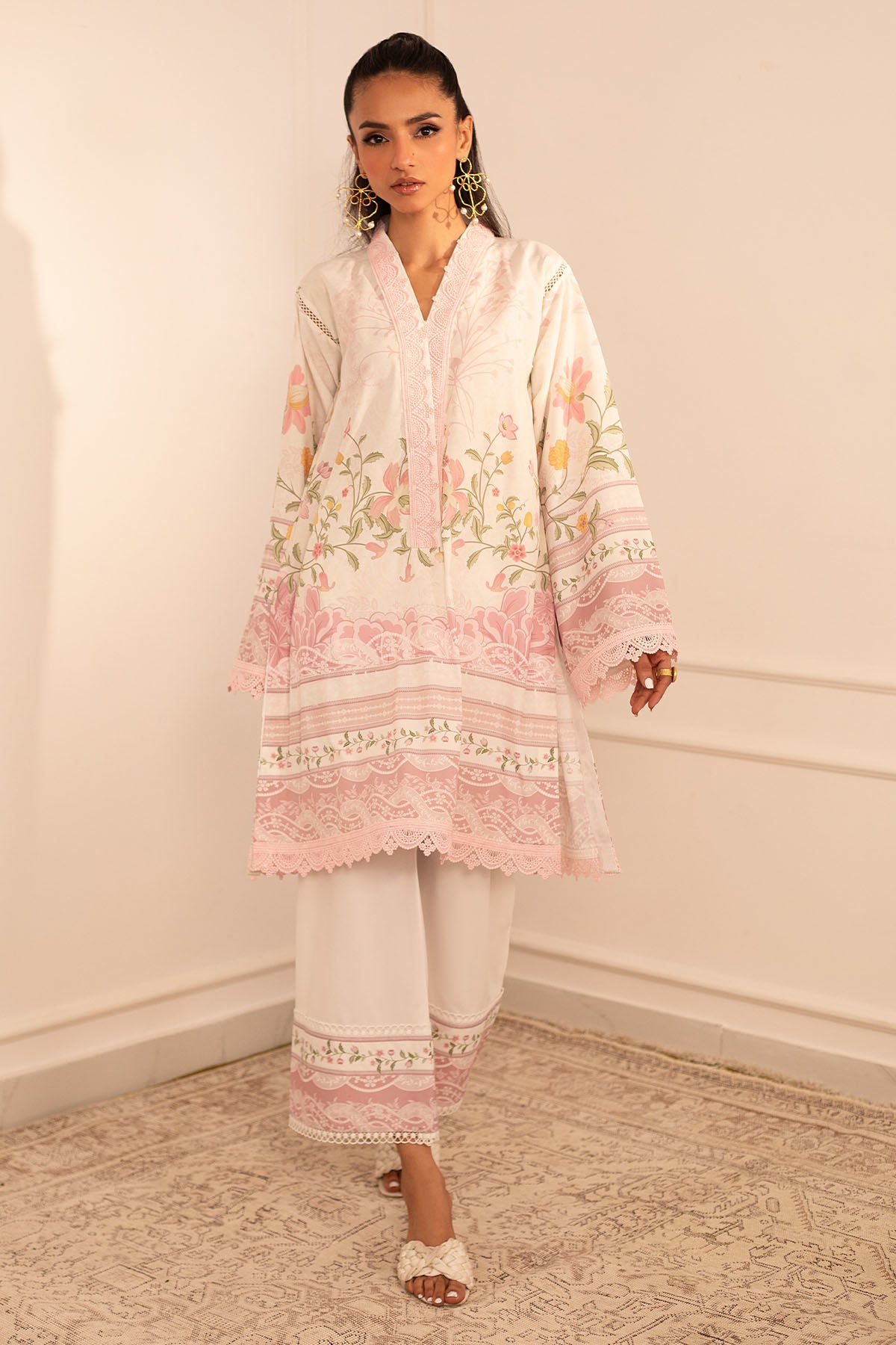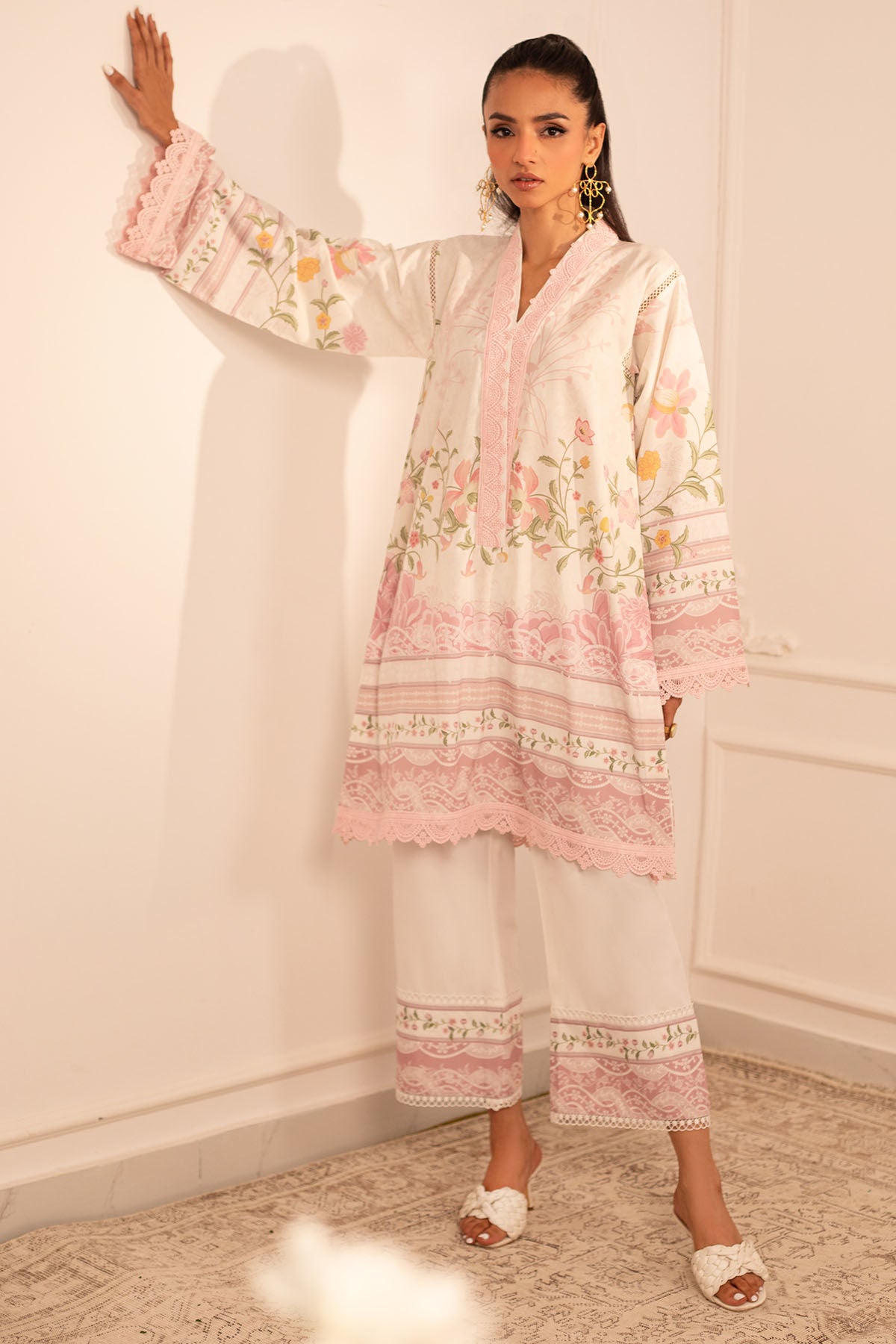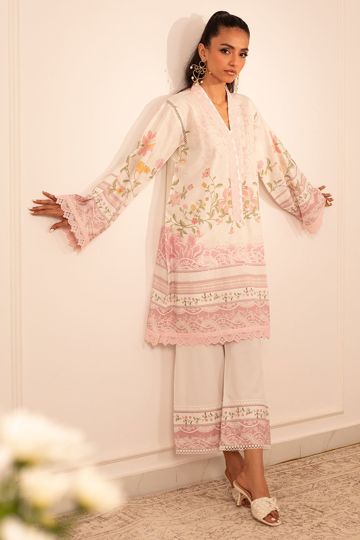 Quirky, trendy yet elegant co-ord set on crepe silk featuring balanced and carefully crafted prints, enhanced with lace details, is a must-have in your closet this summer.