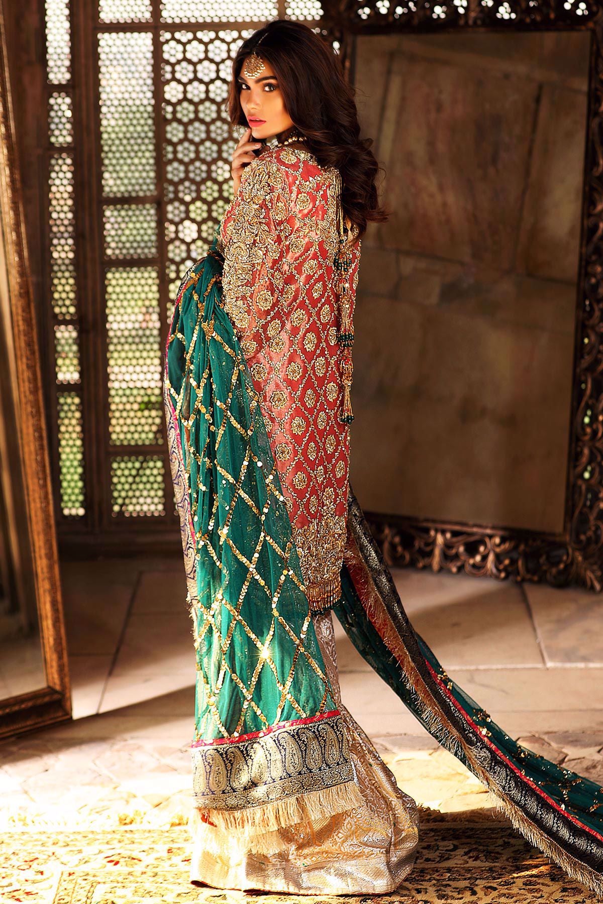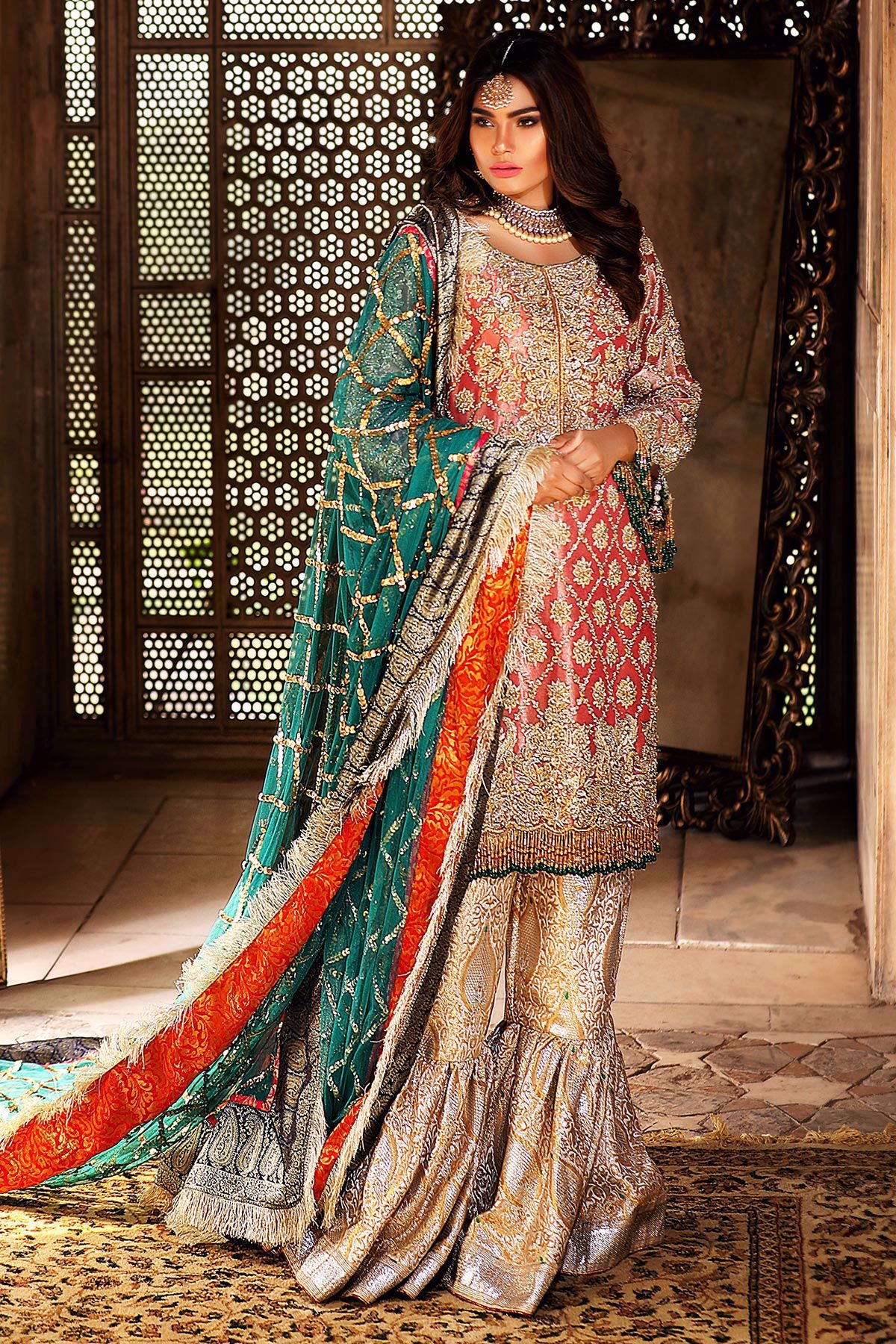 This super stunning deep pink Lamé shirt is heavily worked with zardoze embroidery on the neckline and hemline. The shirt has straight silhouette and the hemline is further enhanced with handmade tassels. The shirt comes with damask gharara and a contrasting heavy chan dupatta.