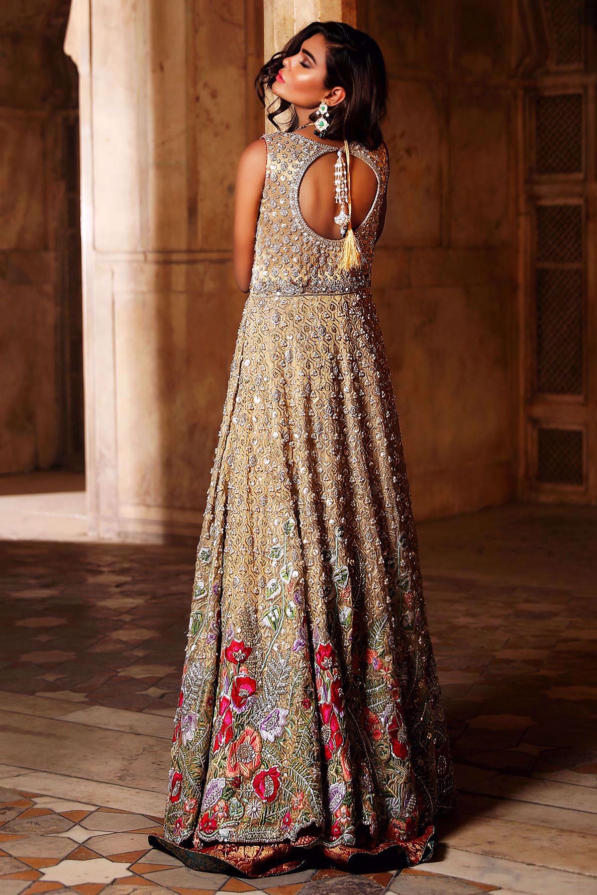 This super stunning Lamé jacket from shehnaai is sure to set you apart. The hemline of the jacket is made of opulent floral embroidery which is further enhanced with dabka, zari and light catching crystals. The bodice is heavily hand embroidered with naqshi, kora and dabka with pearls and sequins.