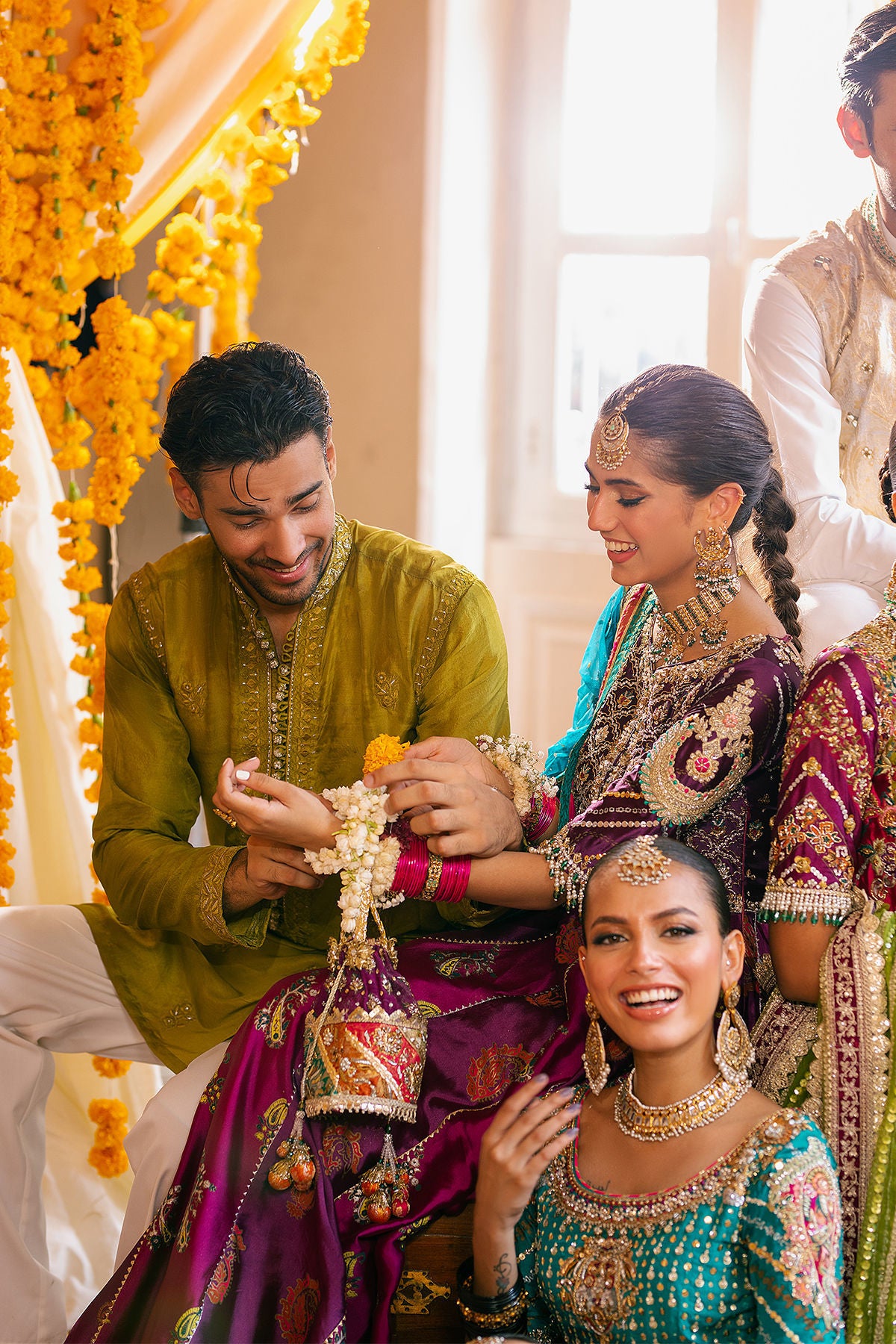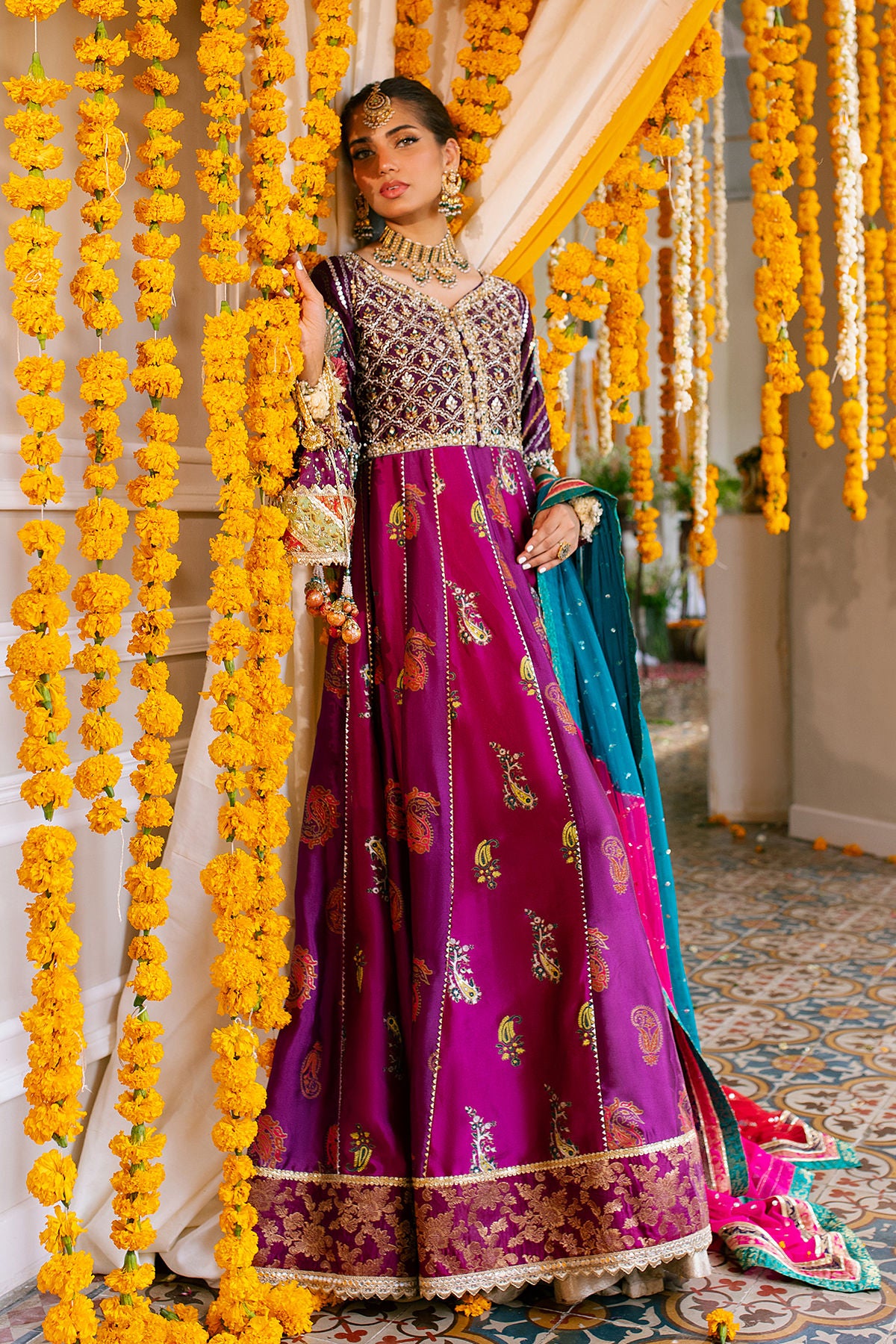Floor length kalidar featuring old school zardozi details on bodice in gorgeous shades of deep plum and magenta. The multi coloured silk panels are adorned with block printed details and sewn to perfection with gota details. The Kalidar is paired with colour blocked net dupatta in shades of electric green and fuchsia. The outfit can be paired with damask dhaka to create a festive look.