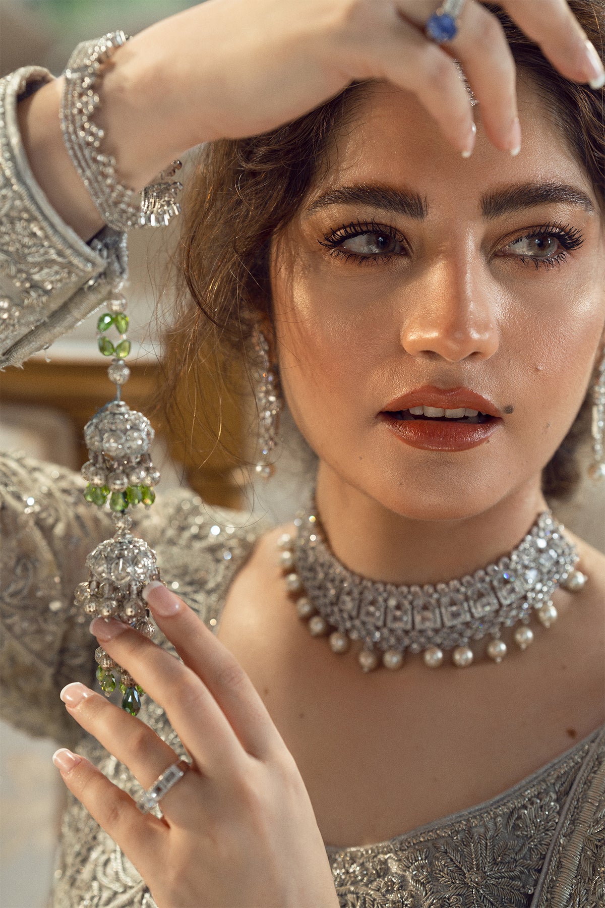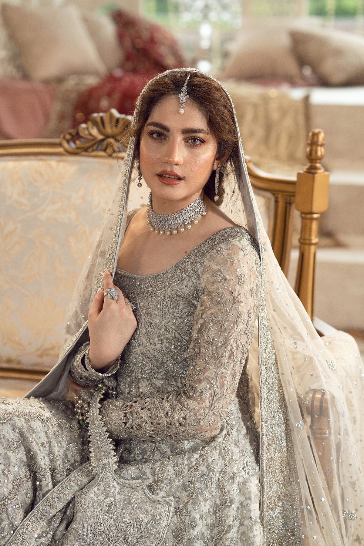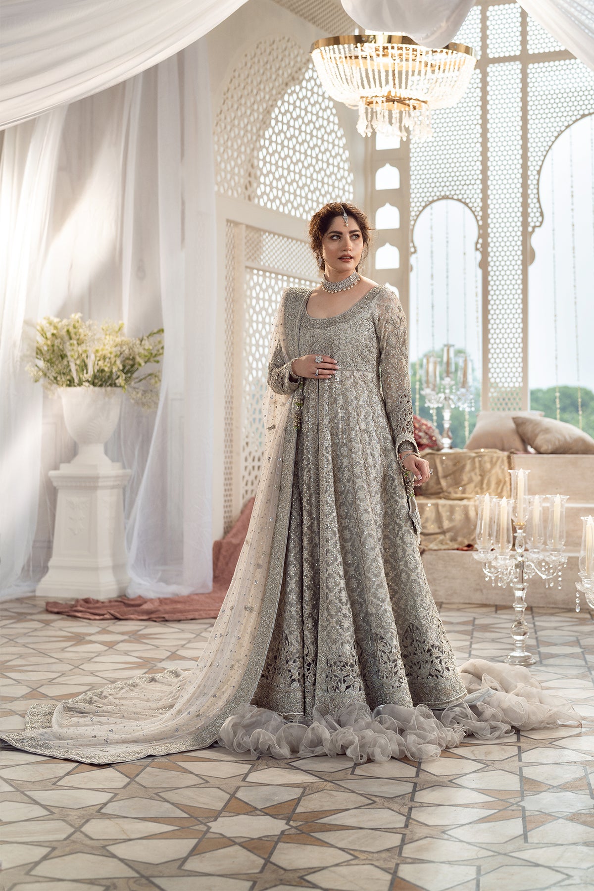 Floor length pishwas featuring dainty zardozi details in all silver on a glistening embossed lame zari canvas featuring cutwork details on hemline.