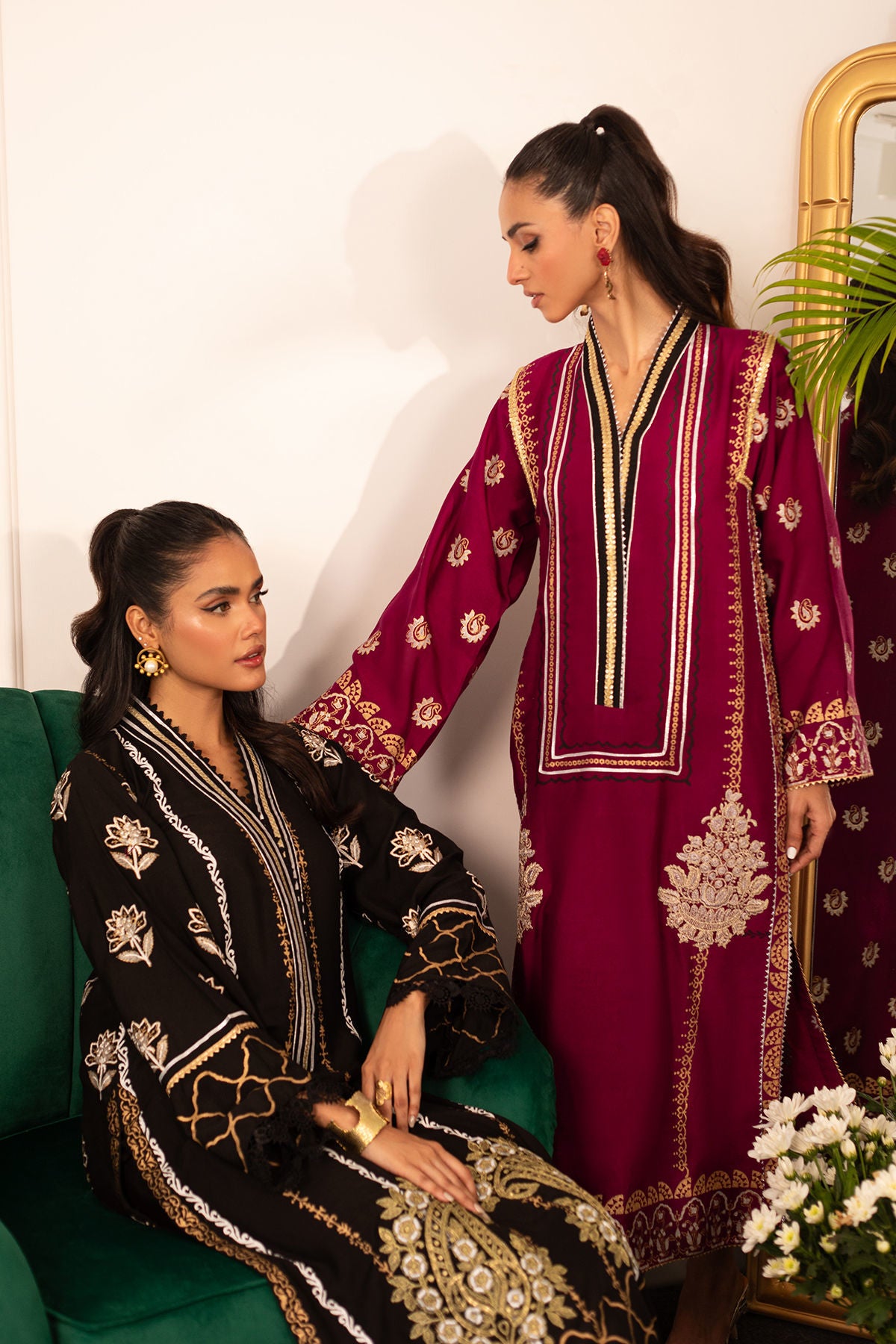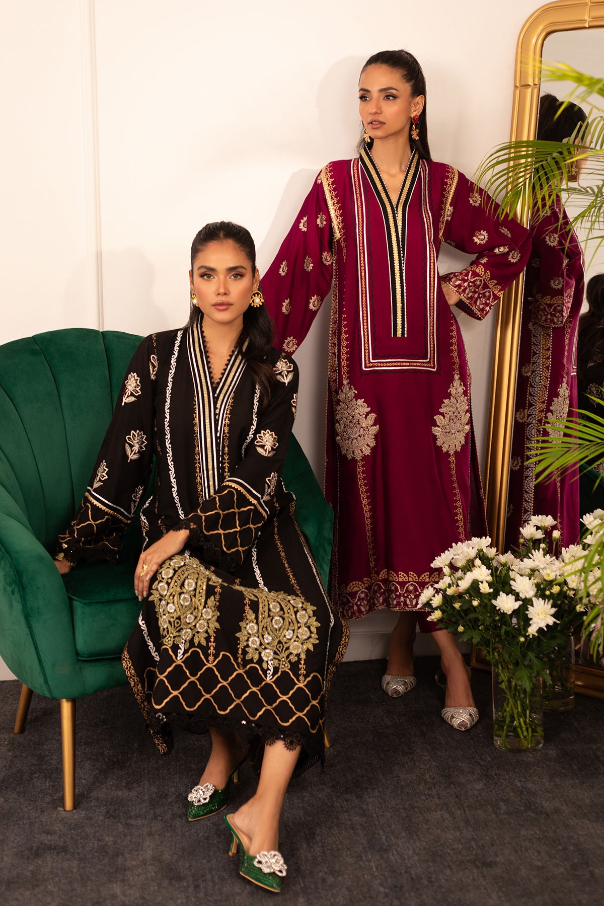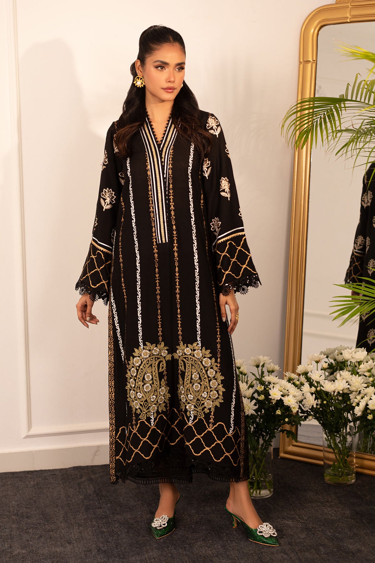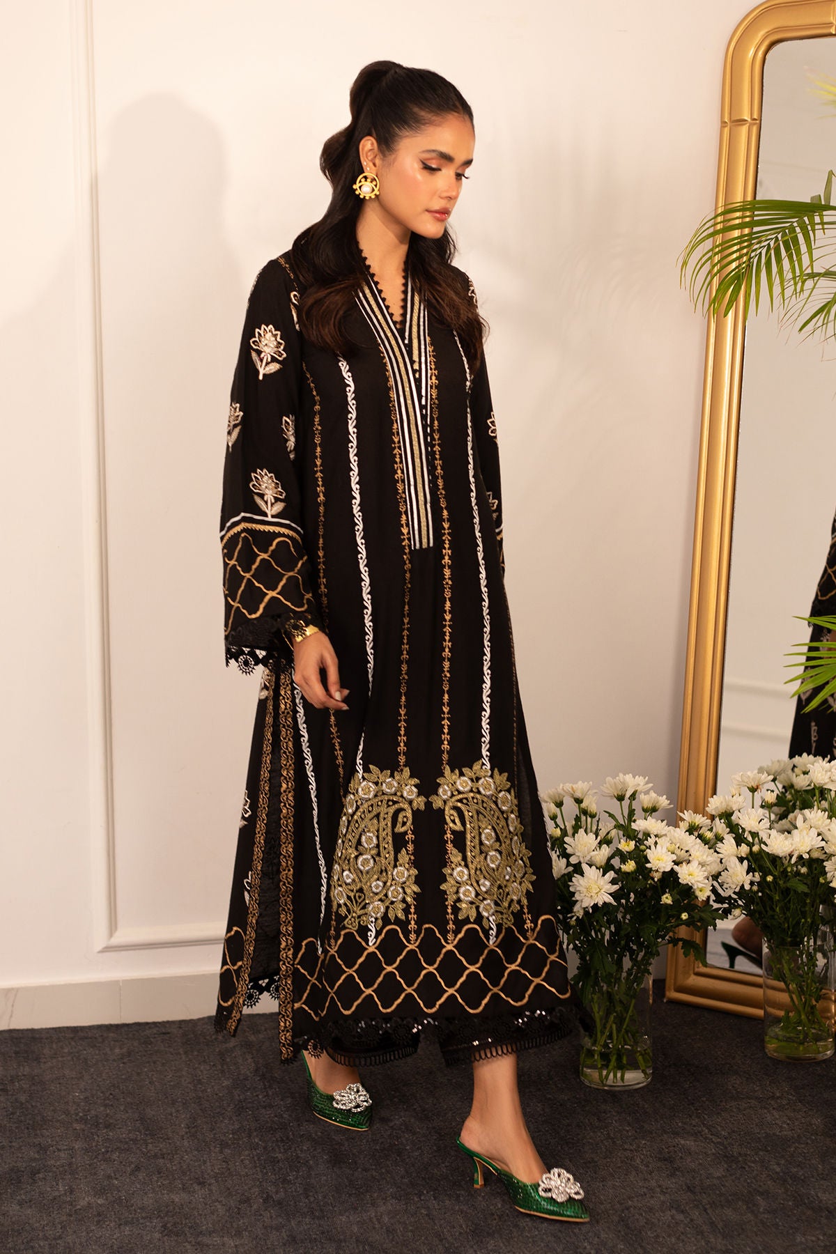 Long silhouette cotton net shirt on head turning black canvas featuring hand block printed details on centre front, the daman of the shirt is carefully crafted with appliqué details in gold and silver zari featuring paisley motifs. The neckline is adorned with gota details while the hem is finished with light catching crochet lace details. The shirt can be paired with matching Sumza izaar featuring embroidered organza and lace details.