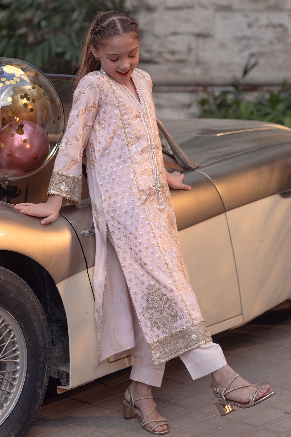 A long-silhouette A-line shirt in a graceful Rose Tyrien hue, crafted from silk and Lurex canvas and enhanced with a subtle, luminous sheen. Intricate detailing enriches the design, while the hem is adorned with delicate zari appliqué motifs, finished with an elegant gota border. The center front is highlighted with meticulously handcrafted zardozi tassels. The ensemble is completed with straight pants and a chiffon dupatta, refined with gold and silver gota detailing for a graceful, cohesive finish.