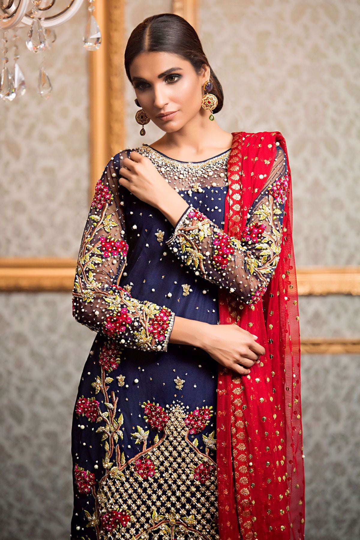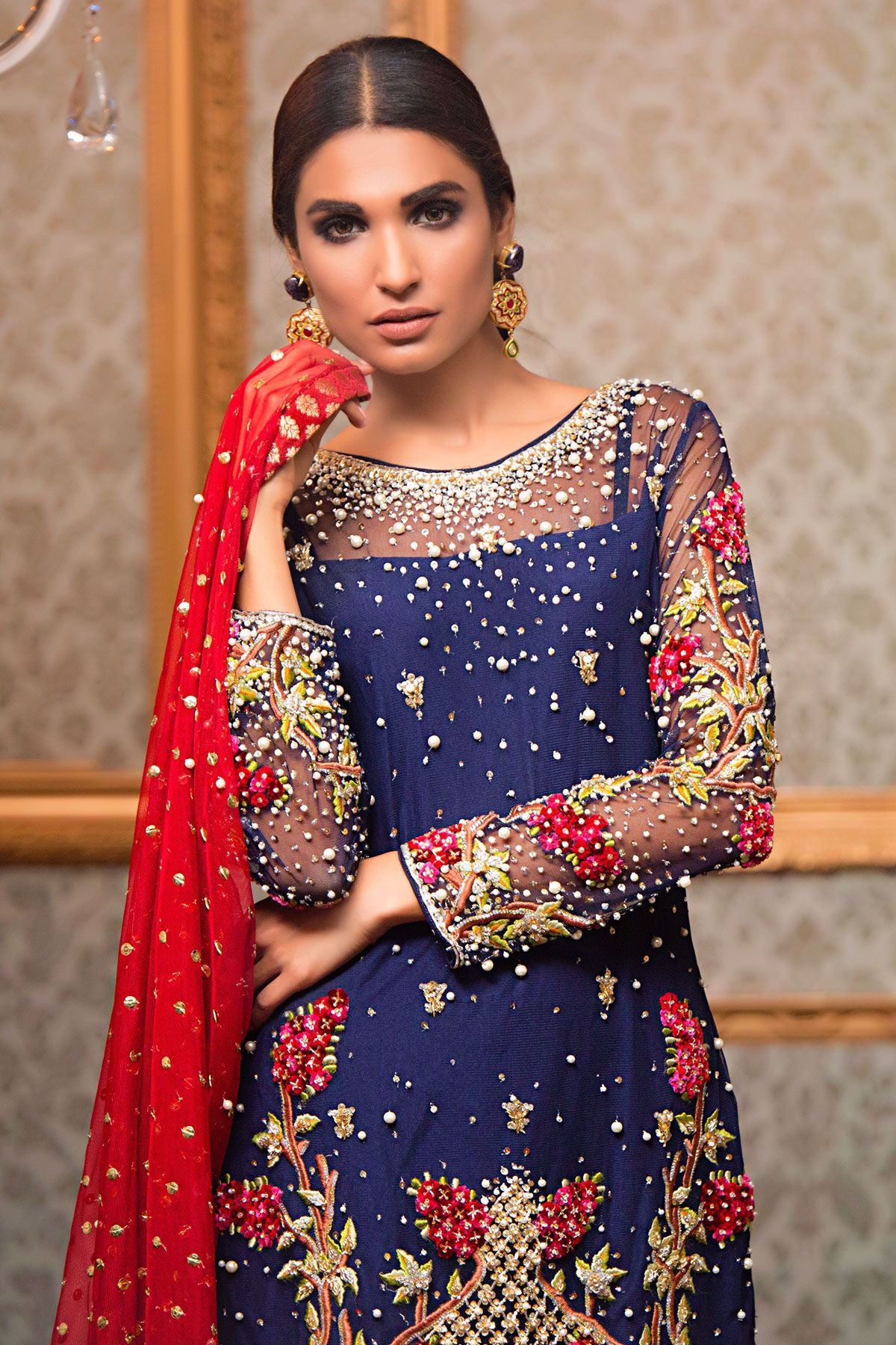 Straight net shirt with delicate neckline of pearls, kora and dabka incorporated with light catching crystals. The hemline is adorned with silk thread motifs which are enhanced with nakhsi and single thread technique. The shirt comes with straight damask pants and dupatta with pearls and sequins chann incorporated with damask finishings.