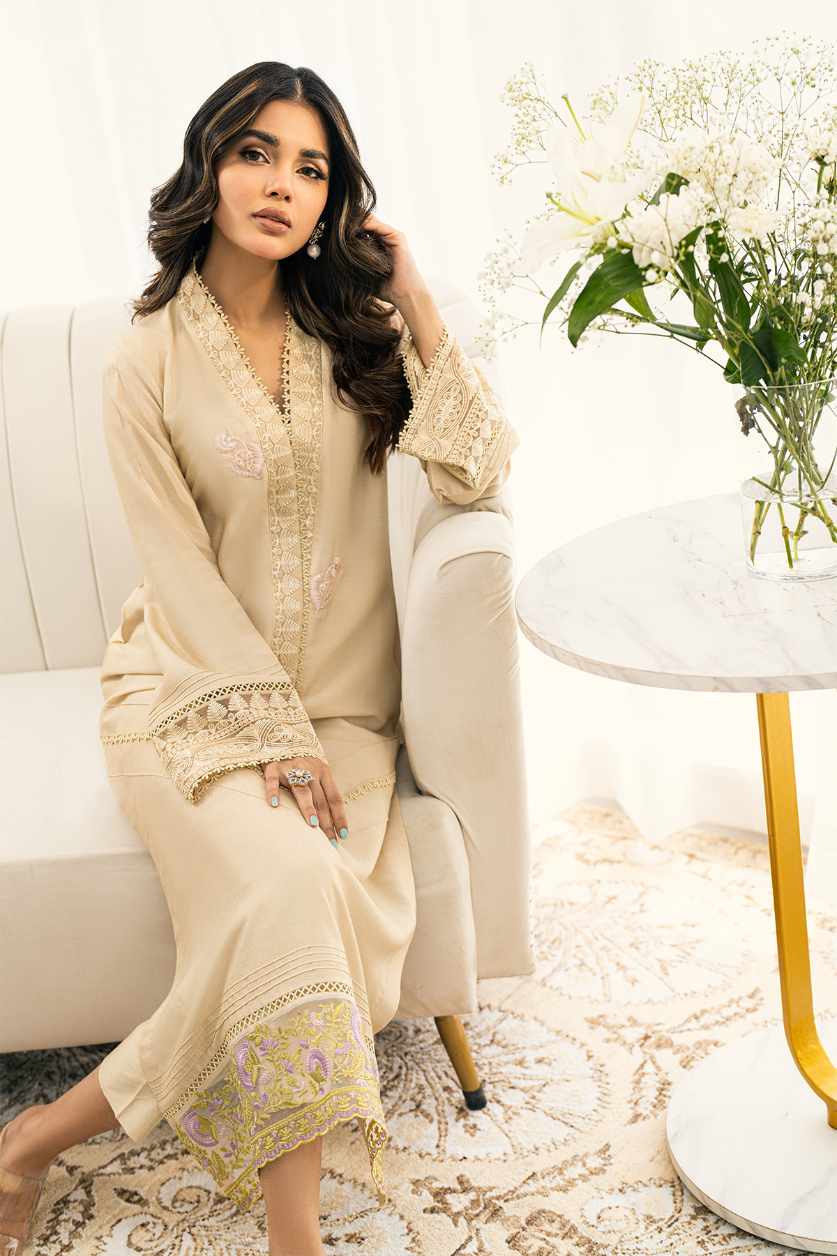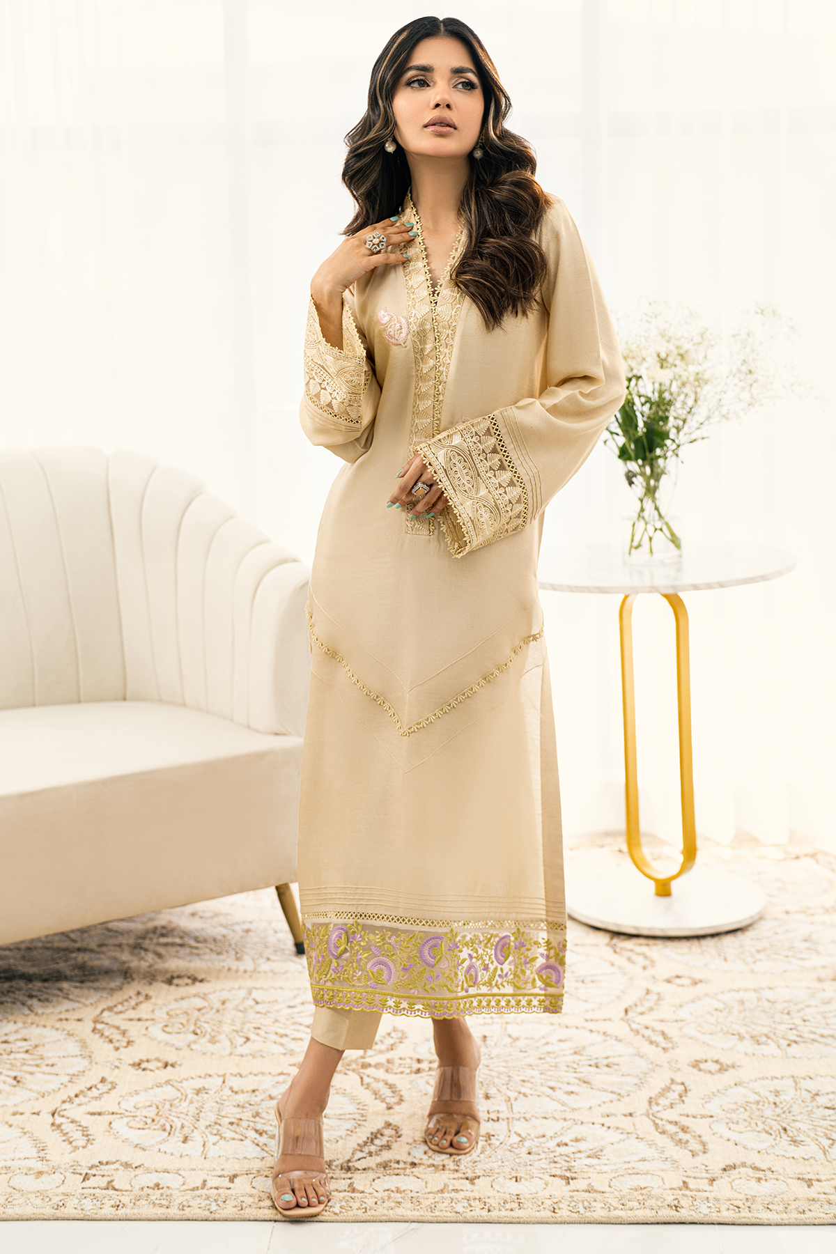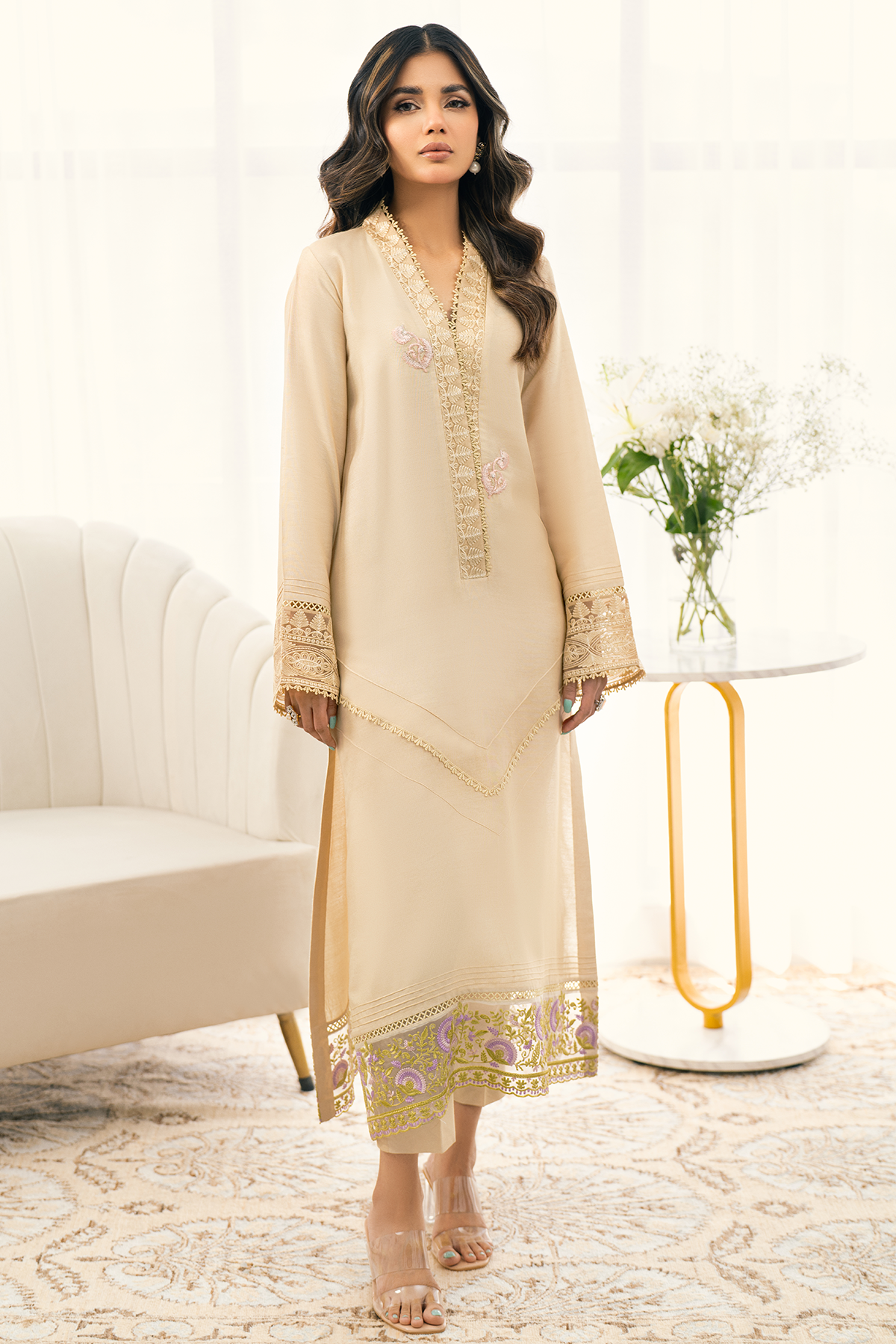 Long silhouette shirt in sublime beige shade featuring embroidered organza details on the neckline which is further adorned with lace details. The centre front is enhanced with lace and pin tucks details and the hemline is enhanced with embroidered organza panel featuring floral details in pretty shades of peach, lilacs and subtle green. The neckline is adorned with floral rosettes in pretty shade of pink. The shirt can be paired with straight matching pants.