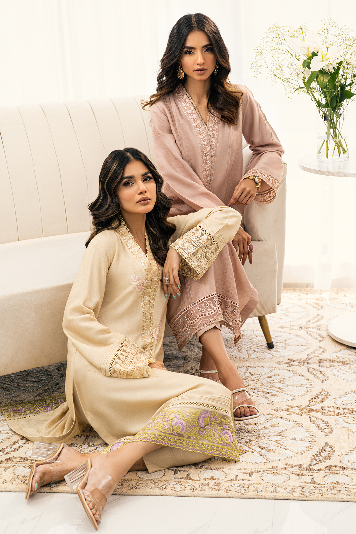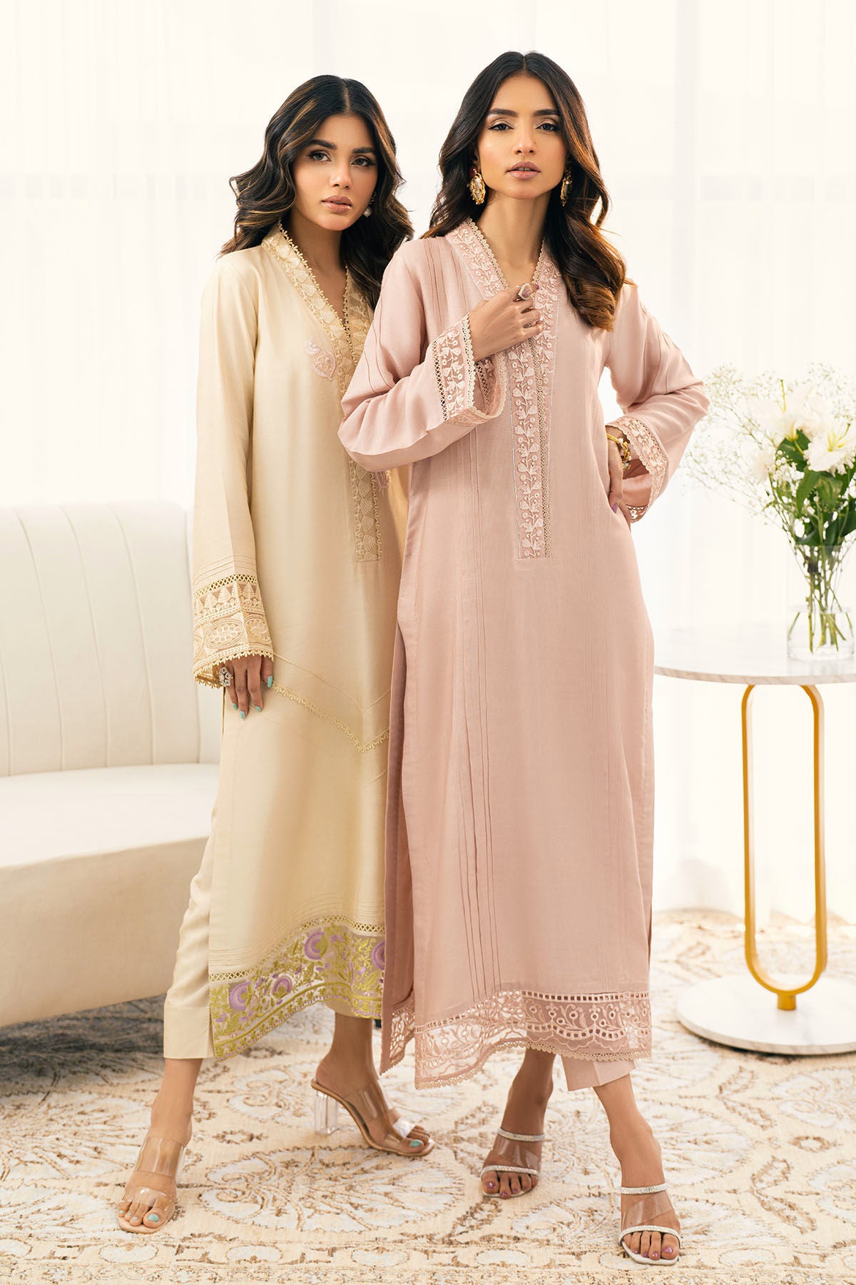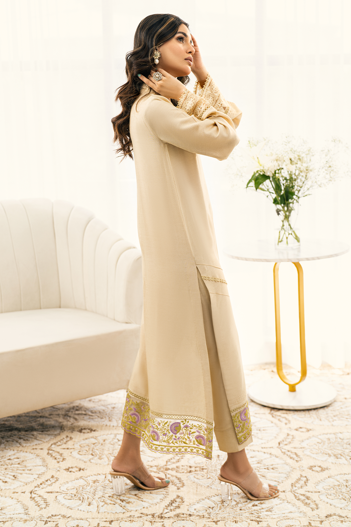 Long silhouette shirt in sublime beige shade featuring embroidered organza details on the neckline which is further adorned with lace details. The centre front is enhanced with lace and pin tucks details and the hemline is enhanced with embroidered organza panel featuring floral details in pretty shades of peach, lilacs and subtle green. The neckline is adorned with floral rosettes in pretty shade of pink. The shirt can be paired with straight matching pants.