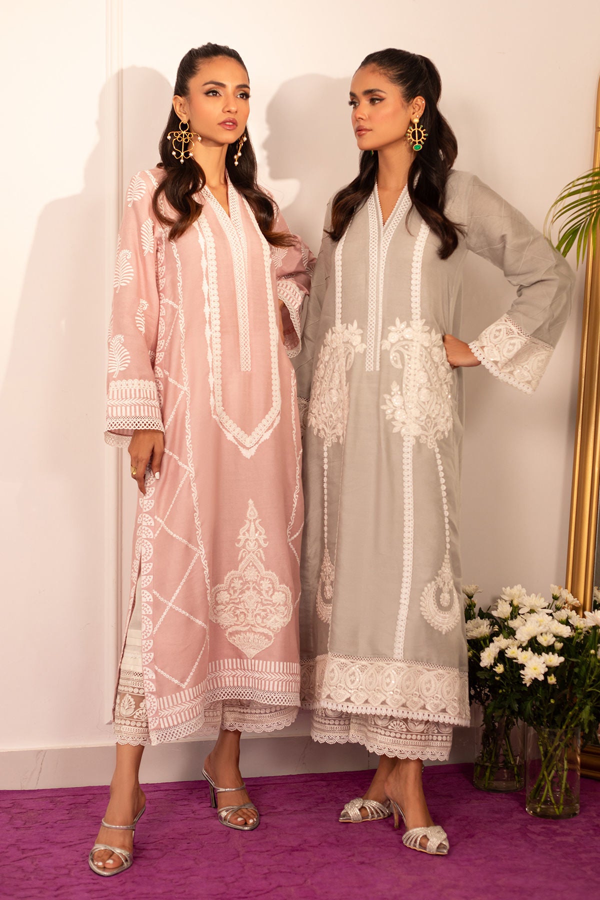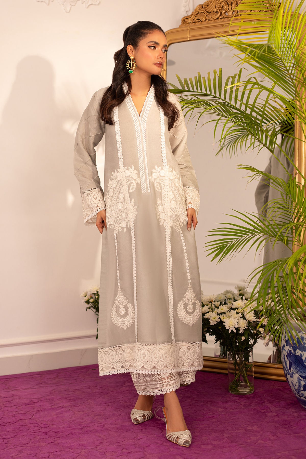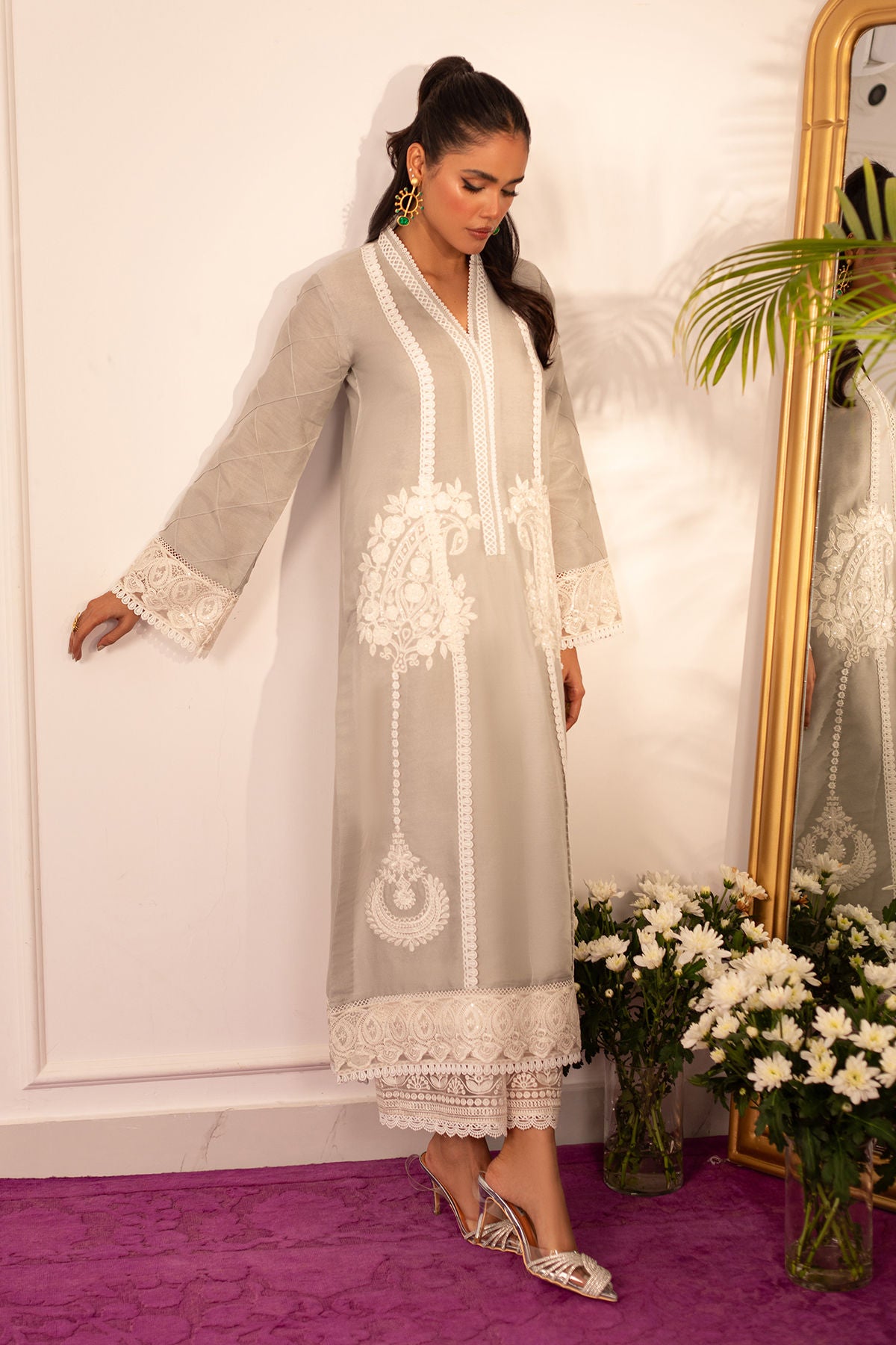 Long silhouette cotton net shirt on a dreamy grey canvas featuring appliqué paisley and chand bali motif details, the hem is adorned with light catching embroidered organza panel and lace details. The shirt can be paired Celina izaar featuring embroidered organza and crochet details.