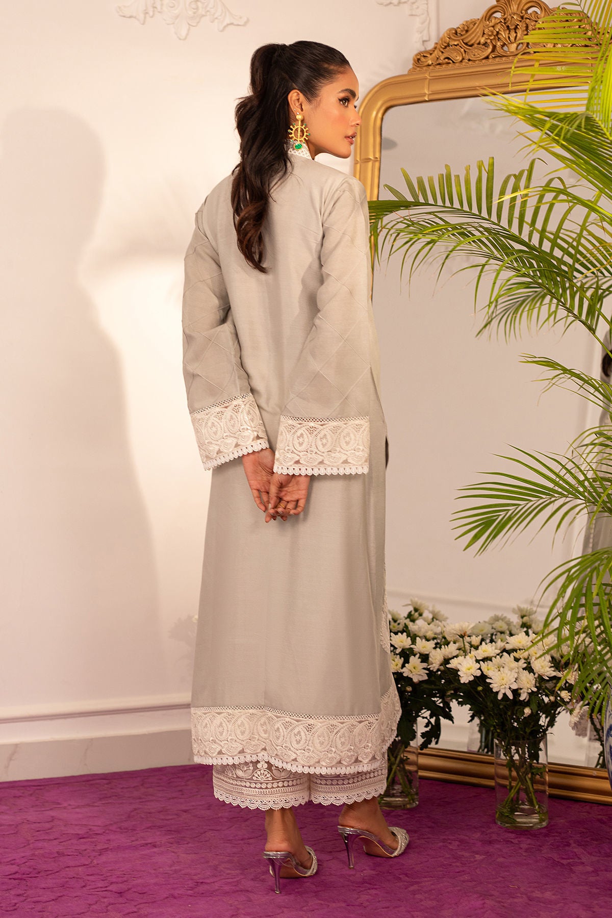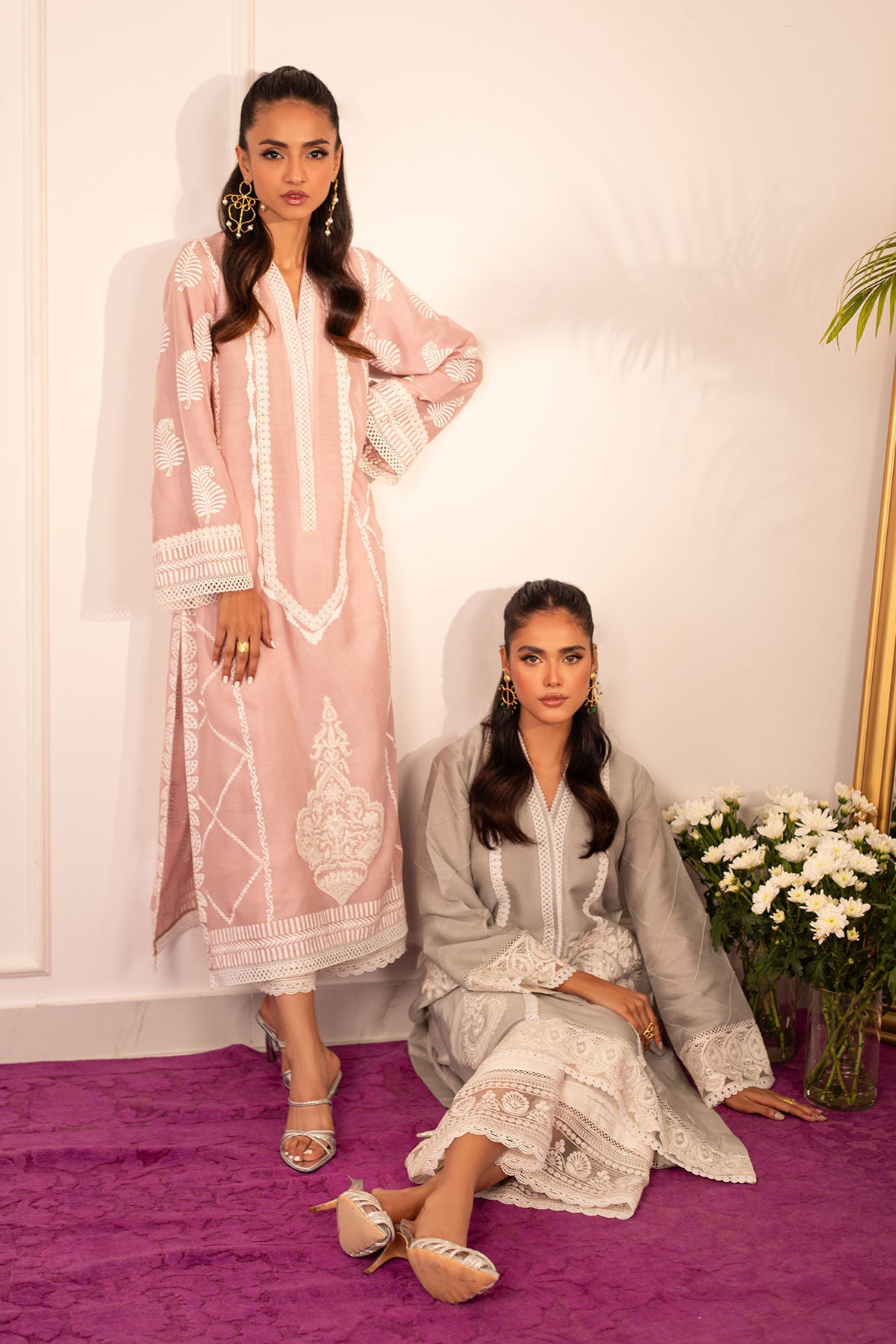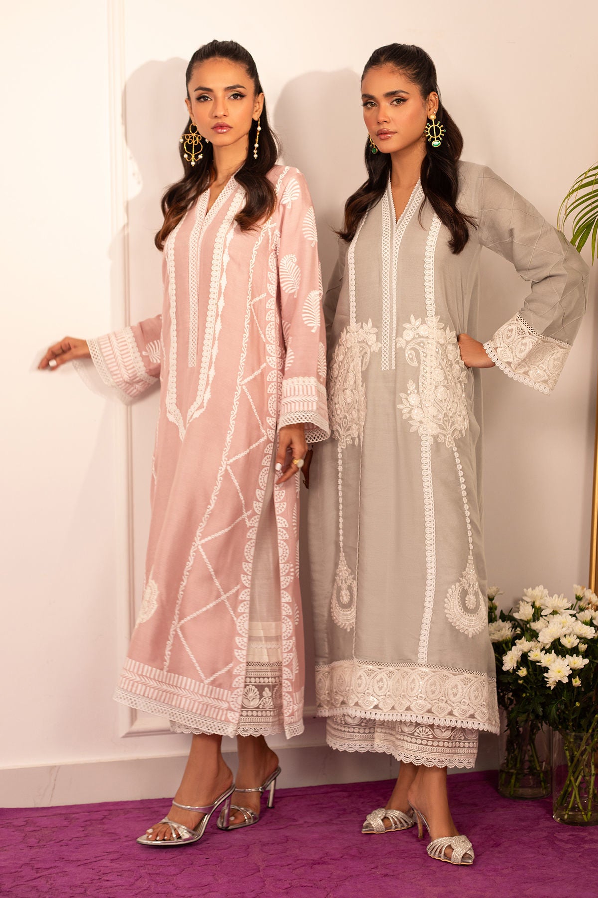 Long silhouette cotton net shirt on a dreamy grey canvas featuring appliqué paisley and chand bali motif details, the hem is adorned with light catching embroidered organza panel and lace details. The shirt can be paired Celina izaar featuring embroidered organza and crochet details.