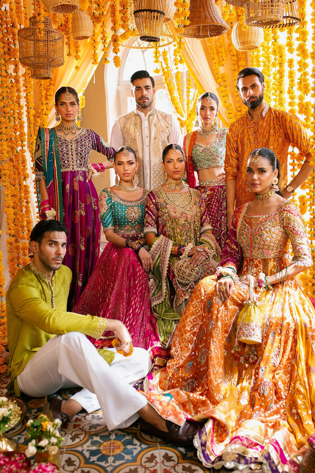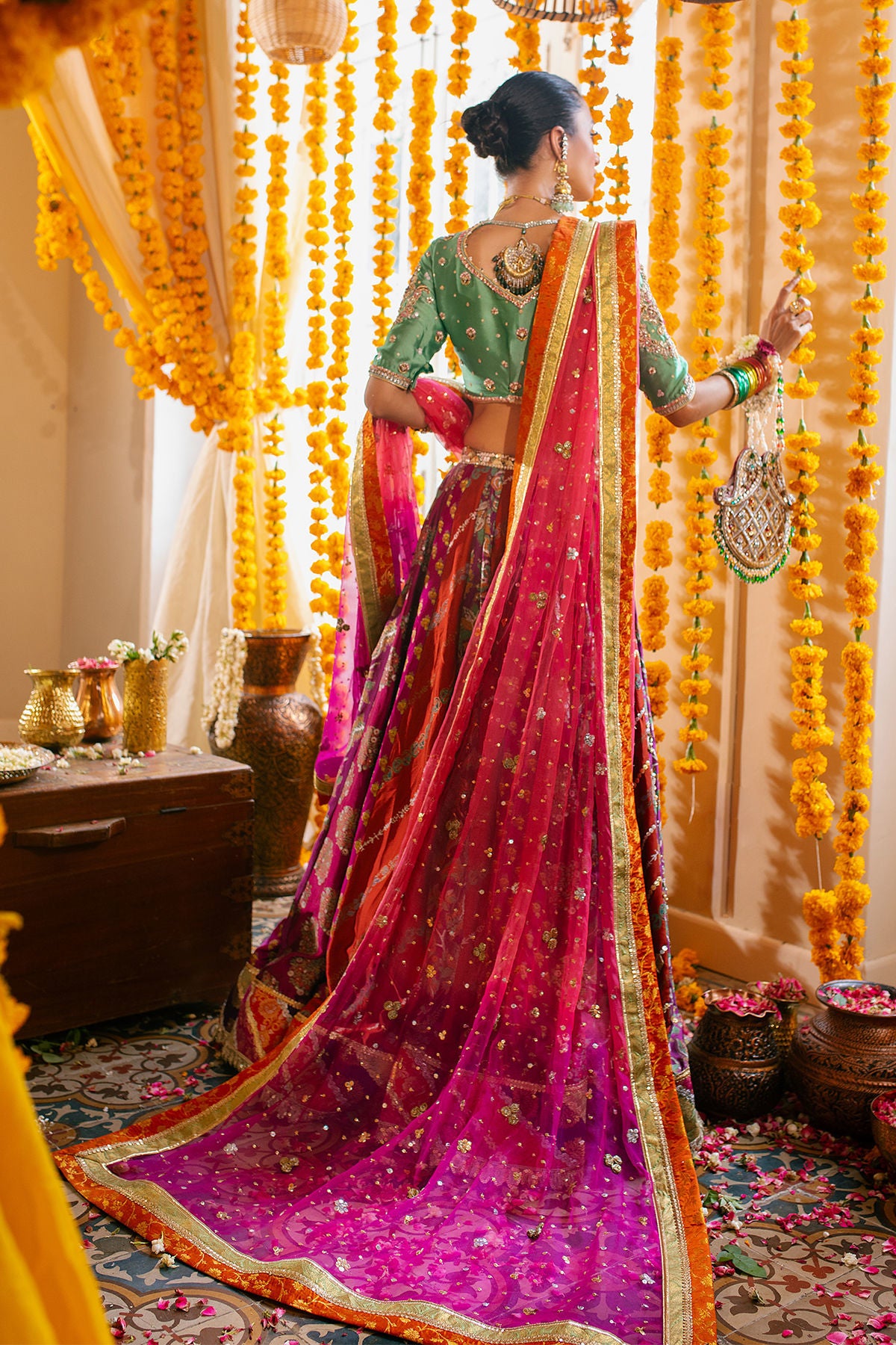 Old school choli in gorgeous sage mint on pure silk canvas featuring zardozi details with a pop of single dhaga resham knots. The choli can be paired with multicoloured block printed lehnga featuring gota and sequins details on each panel. The centre front is adorned with handcrafted tassels and the hem is enhanced with old school chatta patti details. The outfit can be paired with ombre organza dupatta in bubblegum pink and magenta featuring gota and sequins details to create a head turning festive look.