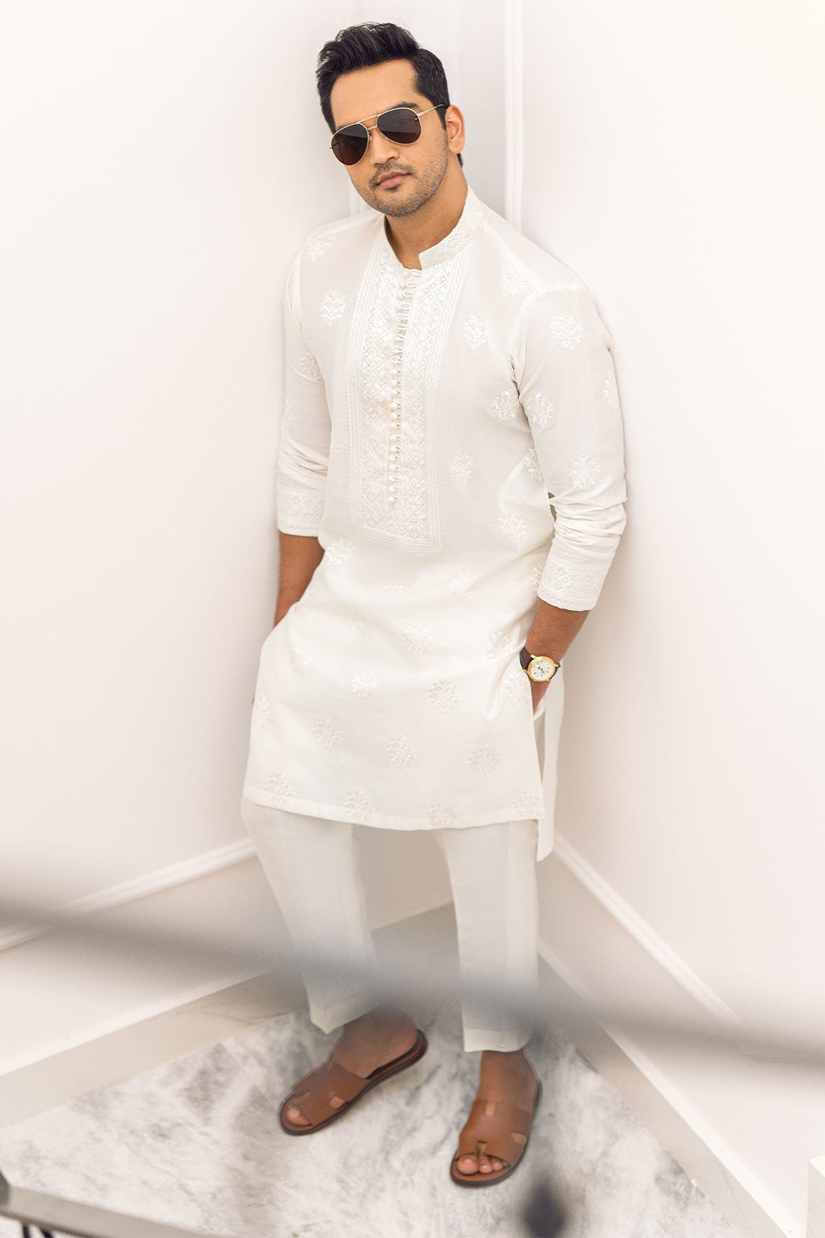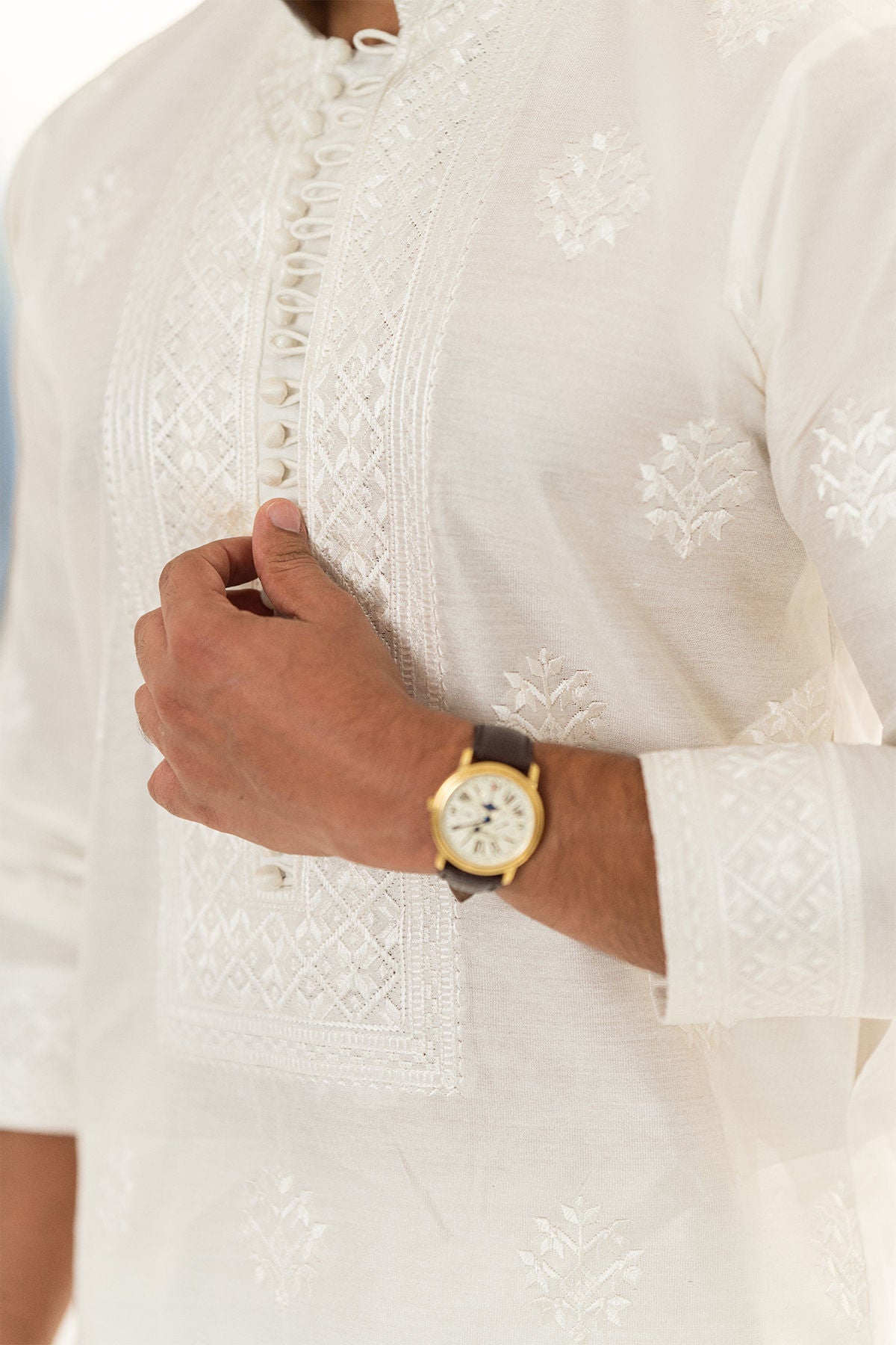 Pristine white kurta featuring self-embroidered details on the neckline. The neckline of the kurta is adorned with loops and handcrafted fabric buttons. The kurta can be paired with straight cotton pants.