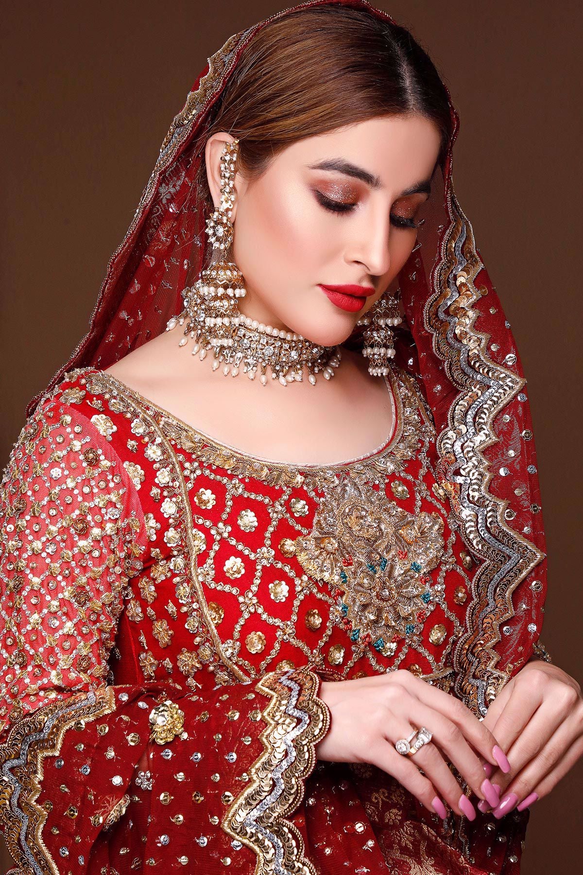 Long and flared silhouette pishwas featuring different hand block printed patterns in each panels incorporated with old school handcrafted techniques. Silk crushed dhaka pajama with gota finishings enhances this stunning ensemble. Blush dupatta featuring hand block printed patterns which are enhanced with sequins gota and dabka.