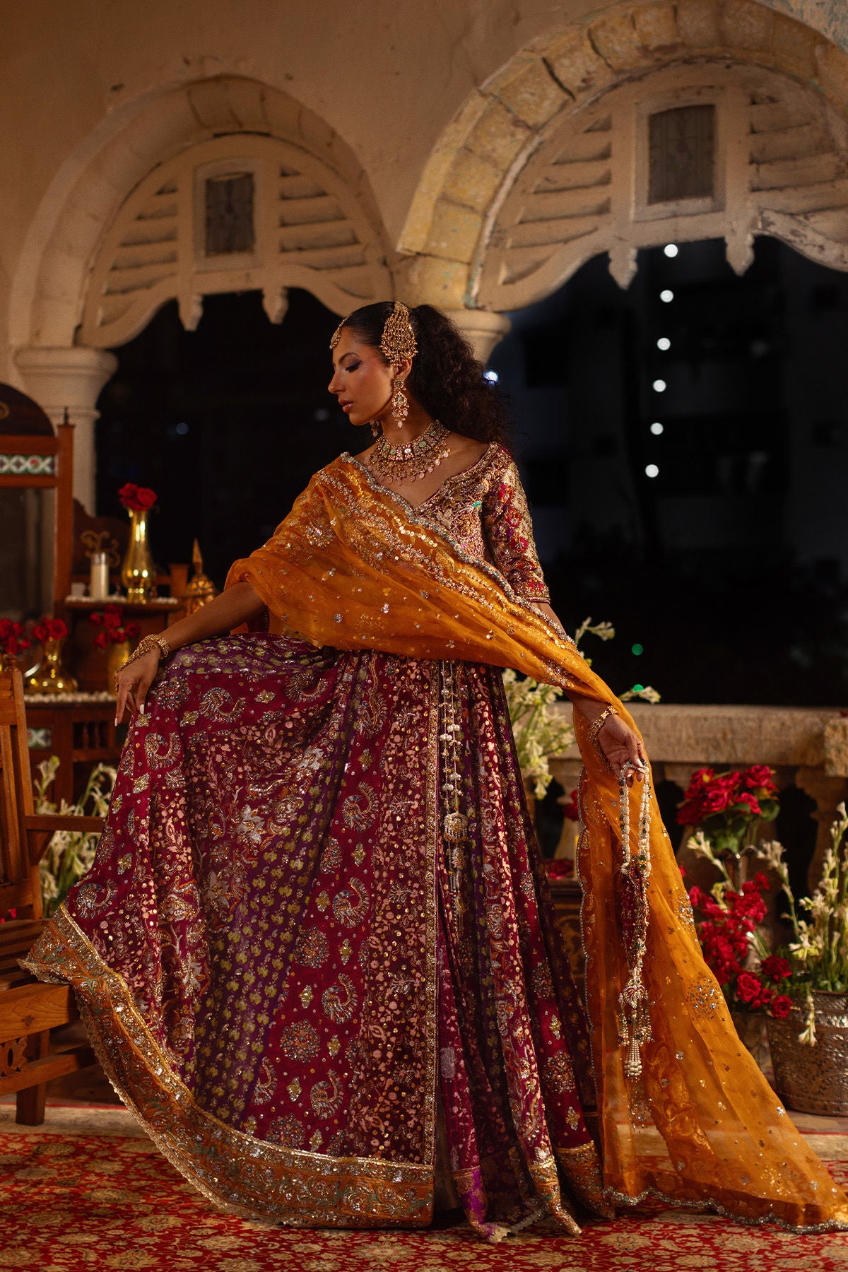 Floor-length Angharka pishwas in shades of cranberries and magenta on a silk net canvas, showcasing hand block printed details on the centre front and back. The bodice is meticulously crafted with intricate zardozi embellishments in gold, silver, and antique finishes. The hemline is elegantly accented with a color-blocked border, enriched with zardozi work and block printed canvas. The Kalidar is complemented by two-legged Dhaka pajamas and an organza rust dupatta, featuring zardozi scalloped details along each side and light-catching sequins, designed to captivate attention this festive season.