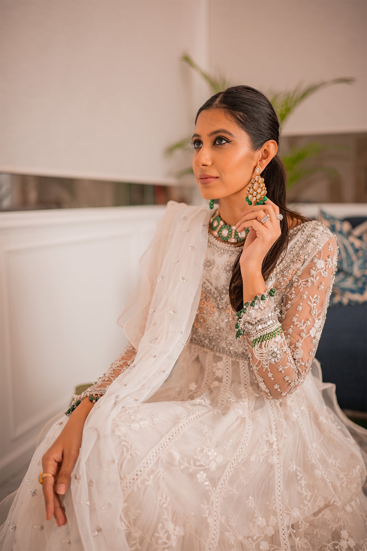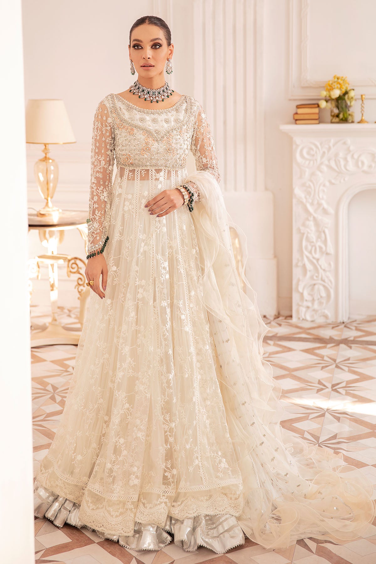 Floor length pishwas on self-embroidered net fabric featuring sequins details. The bodice of the pishwas is enhanced with light catching stones and subtle embroidered silk thread rosettes. The back of the pishwas is adorned with handcrafted ornaments and dangling signature AA tassels. The pishwas is paired with crushed panelled sharara featuring gota details on hem. The outfit can be paired with ruffled organza and net dupatta featuring heavy sequins and crystals details