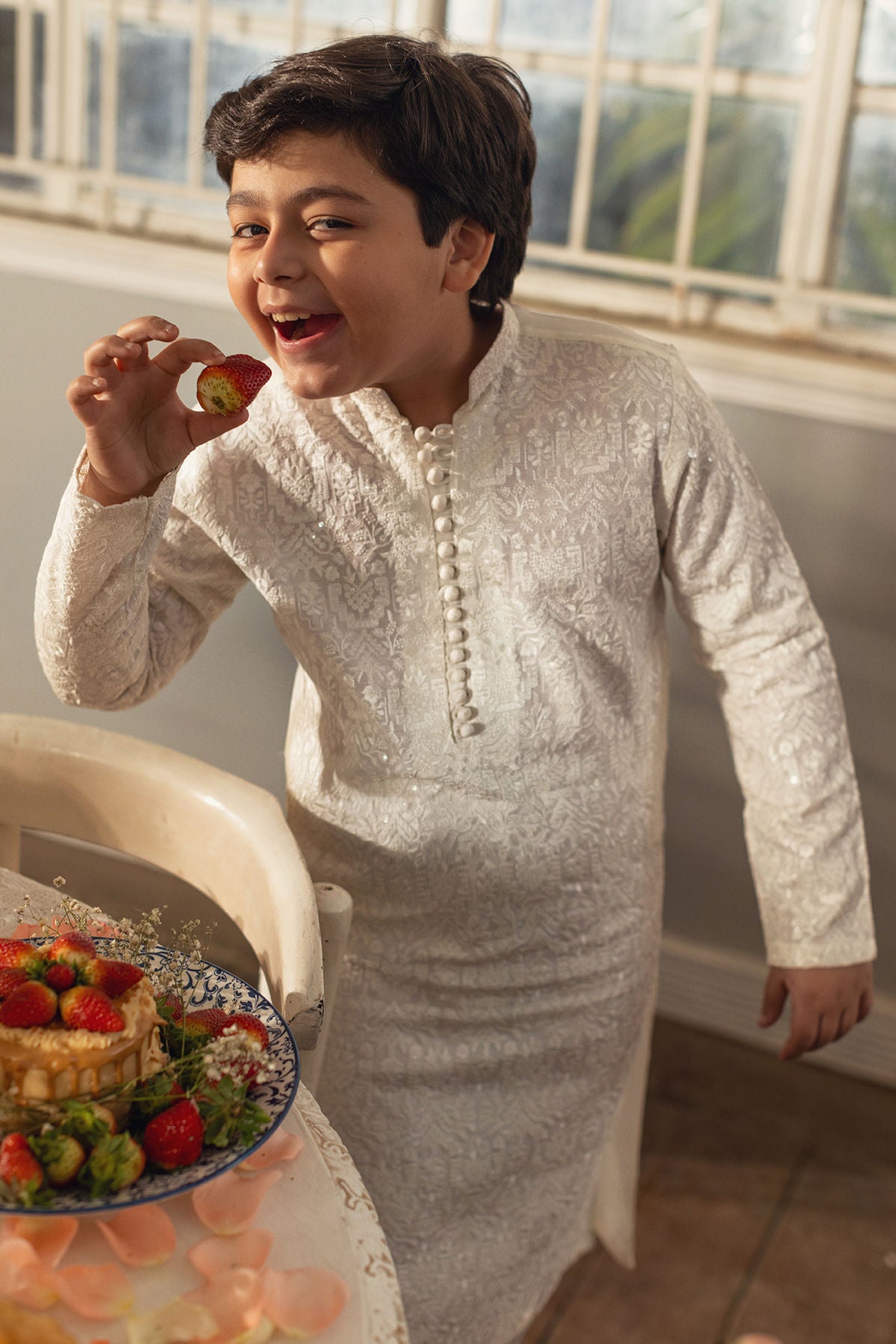 Embroidered raw silk kurta in elegant white featuring self-pattern details adorned with light catching sequins.The neckline is accentuated with loop buttons and the kurta can be elegantly paired with straight white pants to complete the ensemble.